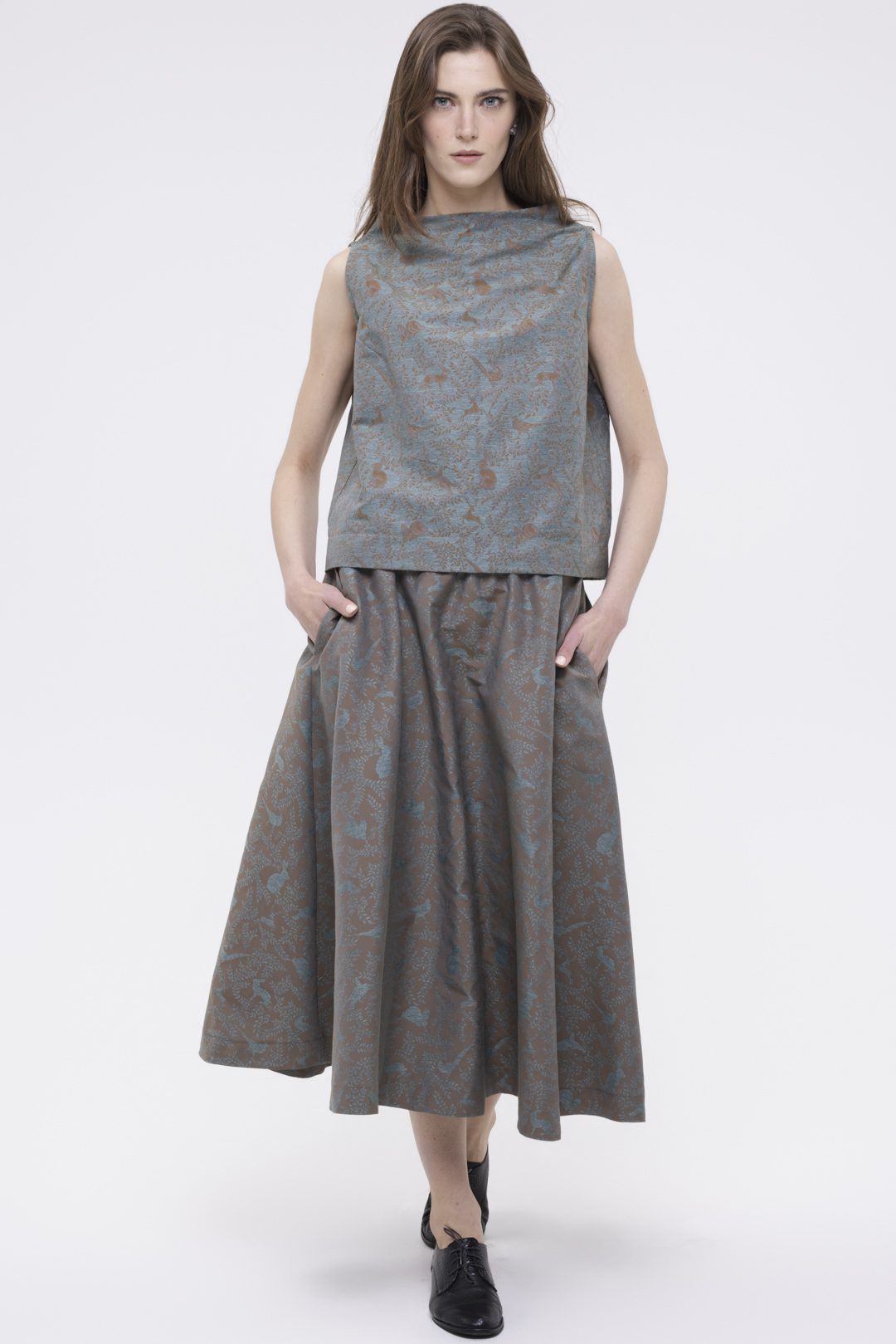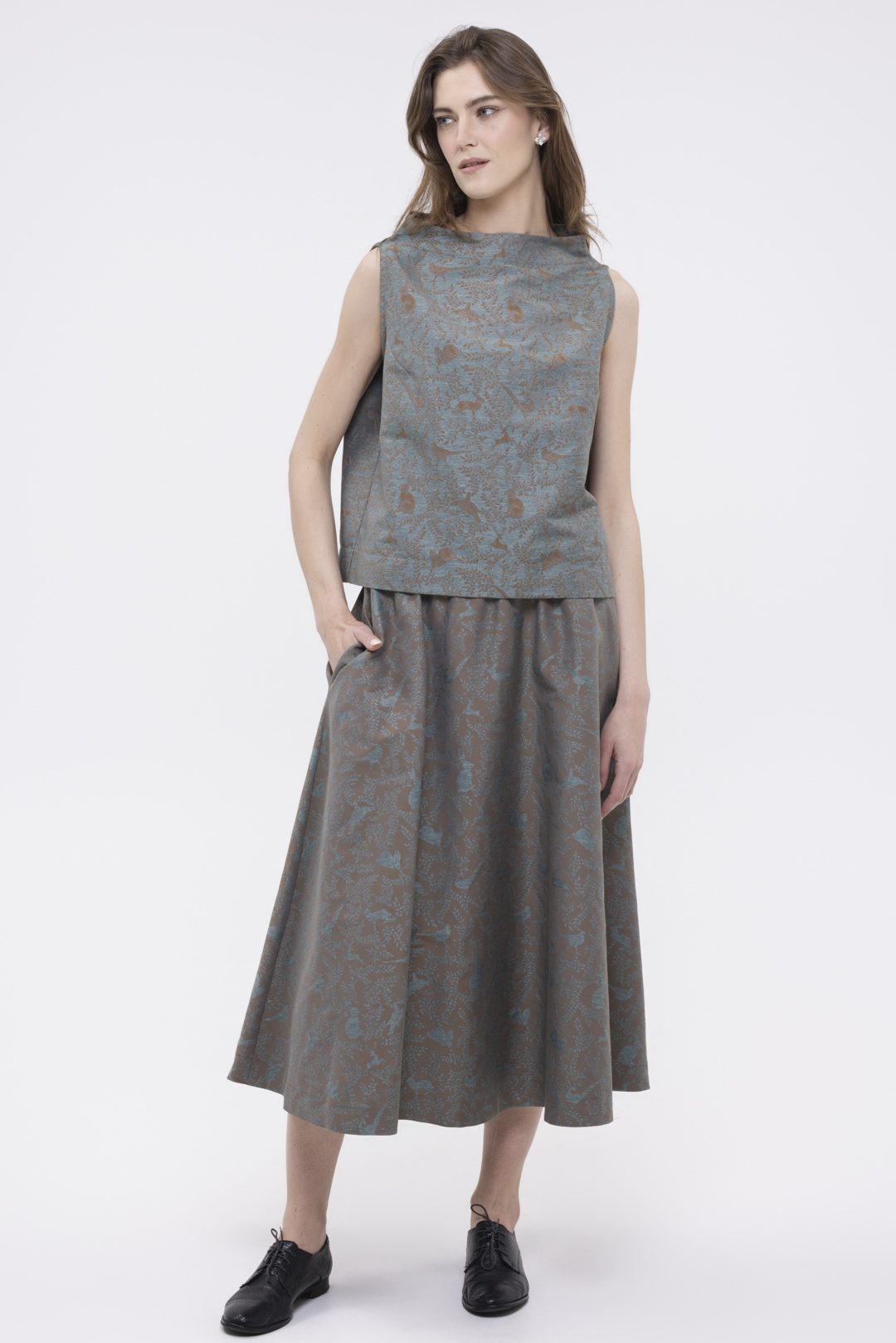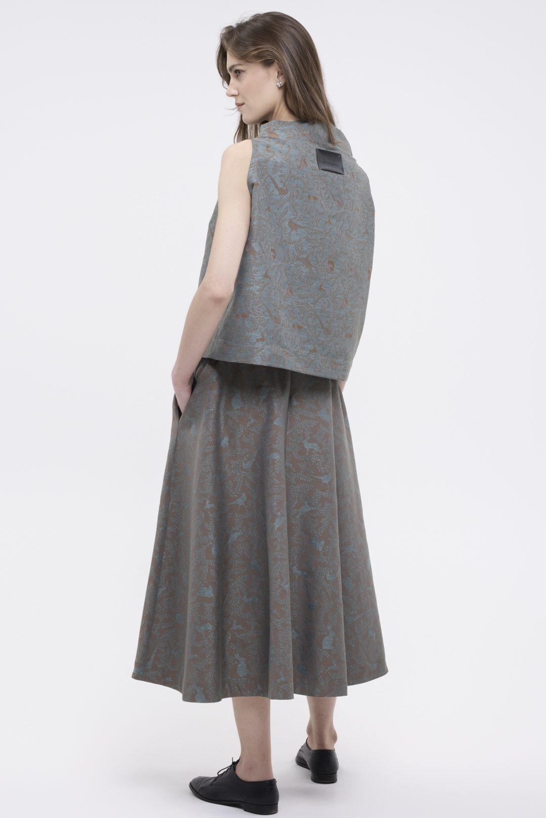 Spódnica BAJECZNA uszyta z żakardowej tkaniny o wyrazistej, ale stonowanej fakturze. Wzór inspirowany lasem nadaje jej charakteru, a neutralna kolorystyka – uniwersalności.