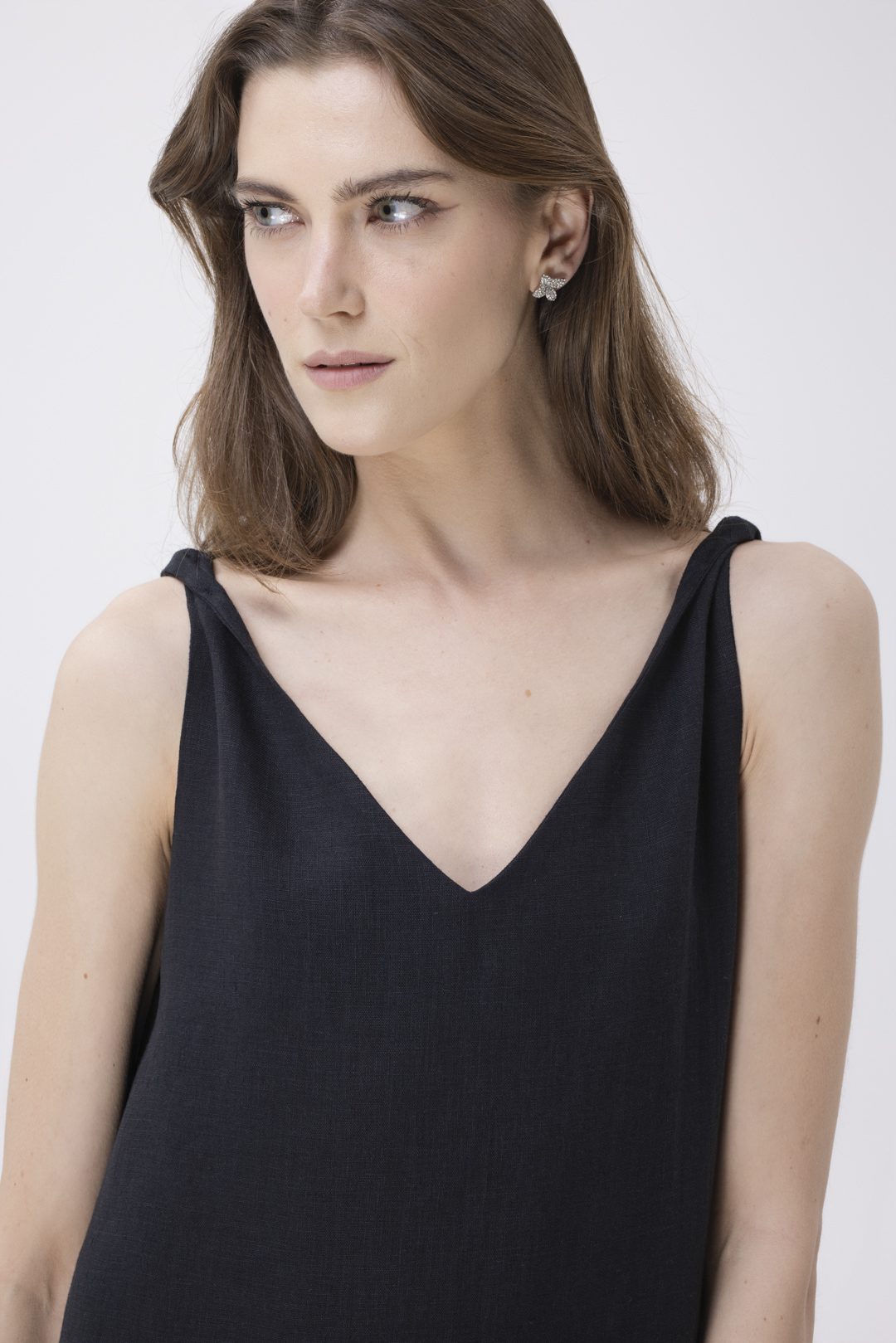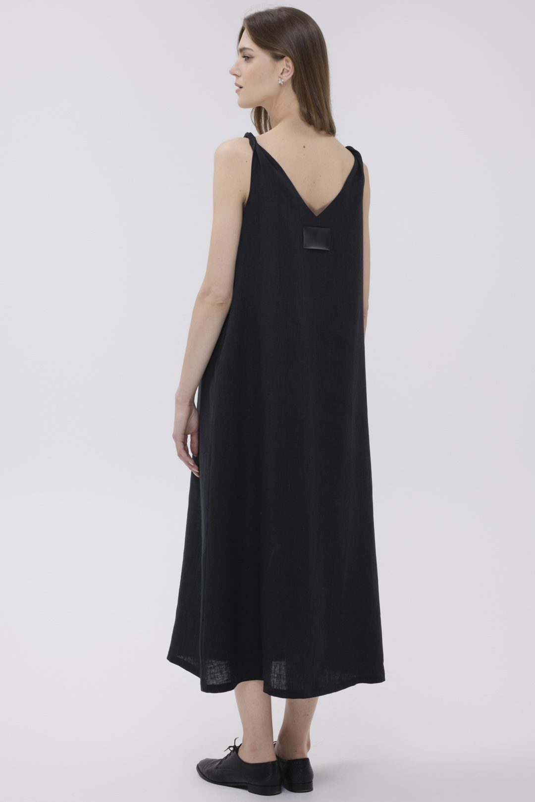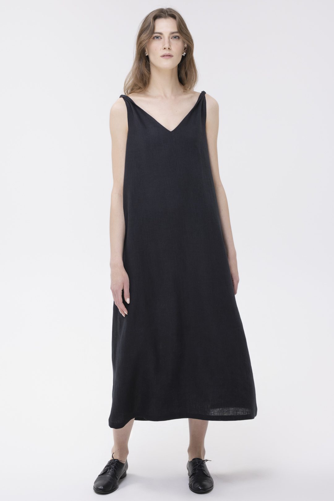 Sukienka lniana CISZA wygląda jak klasyk – dopóki nie spojrzysz na ramiączka. Delikatnie przekręcone, nadają formie lekkości, a sylwetce – miękkiego kształtu.