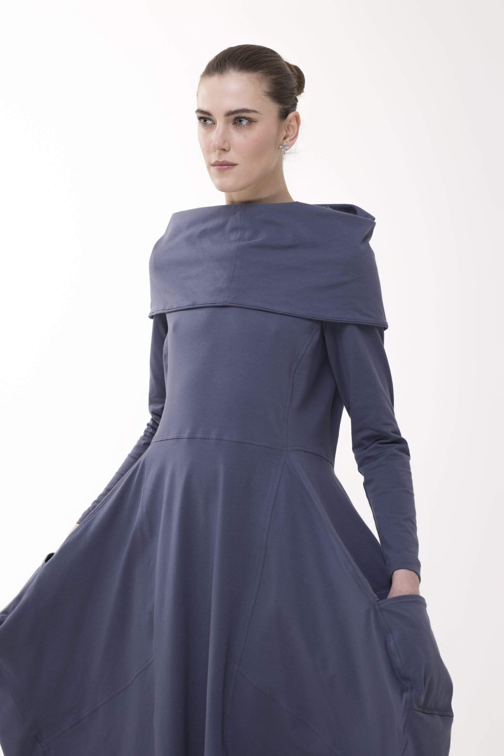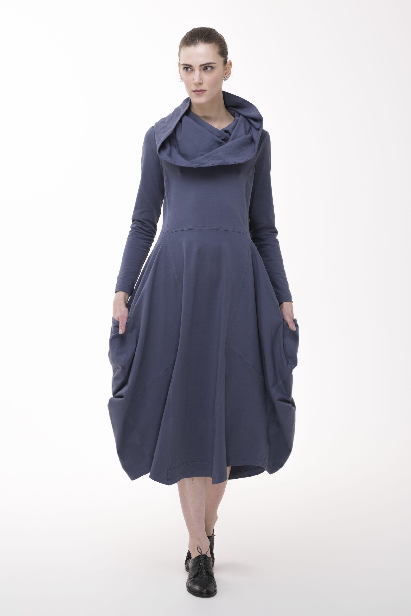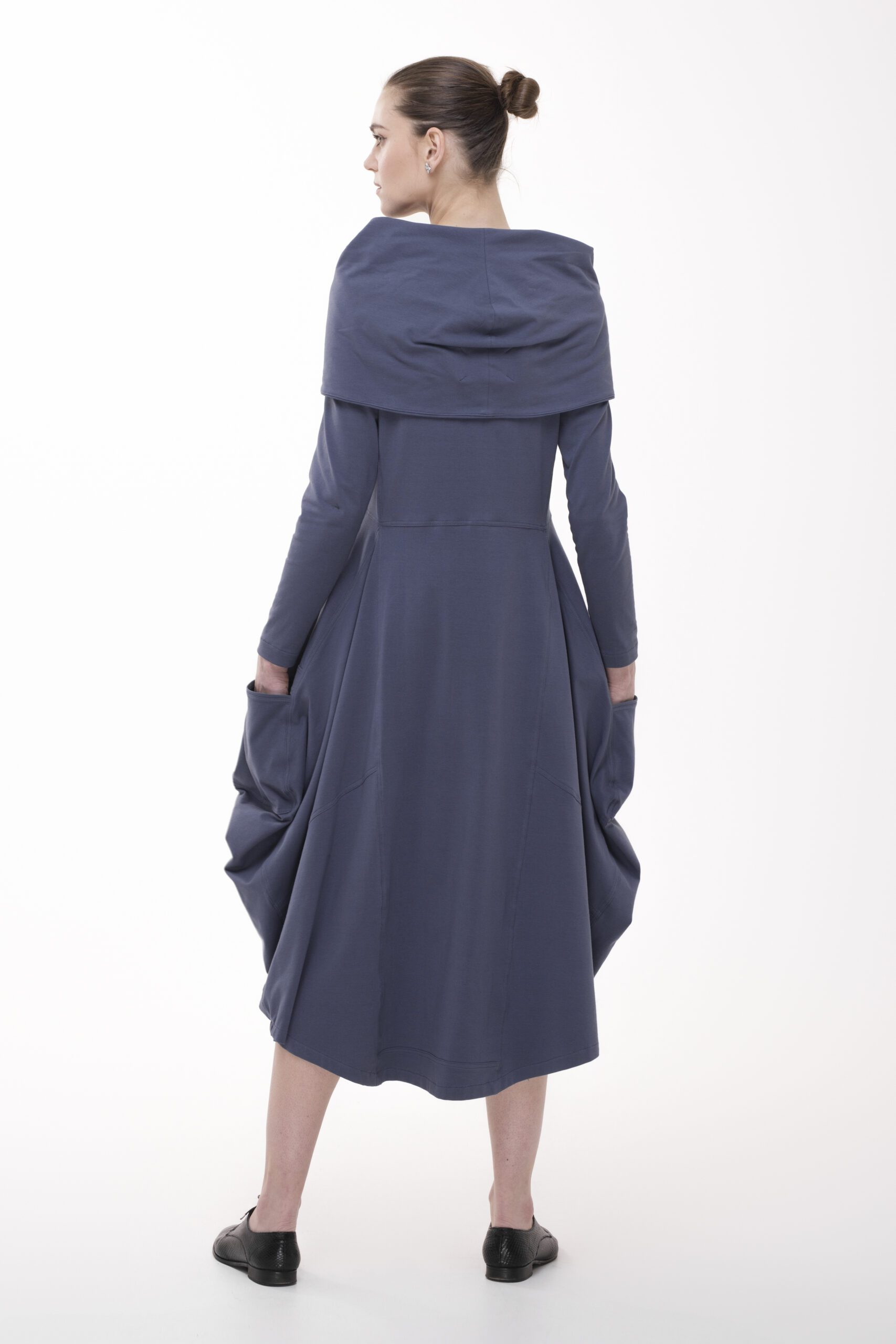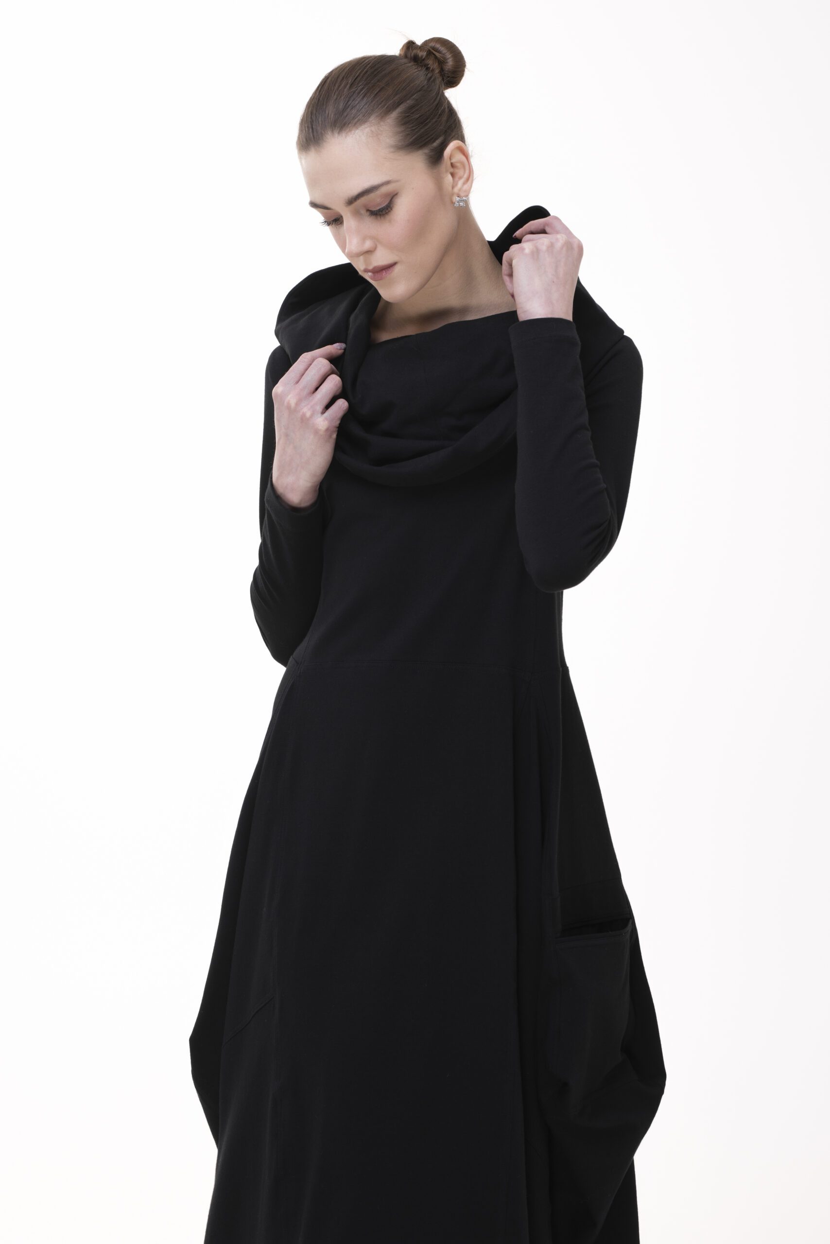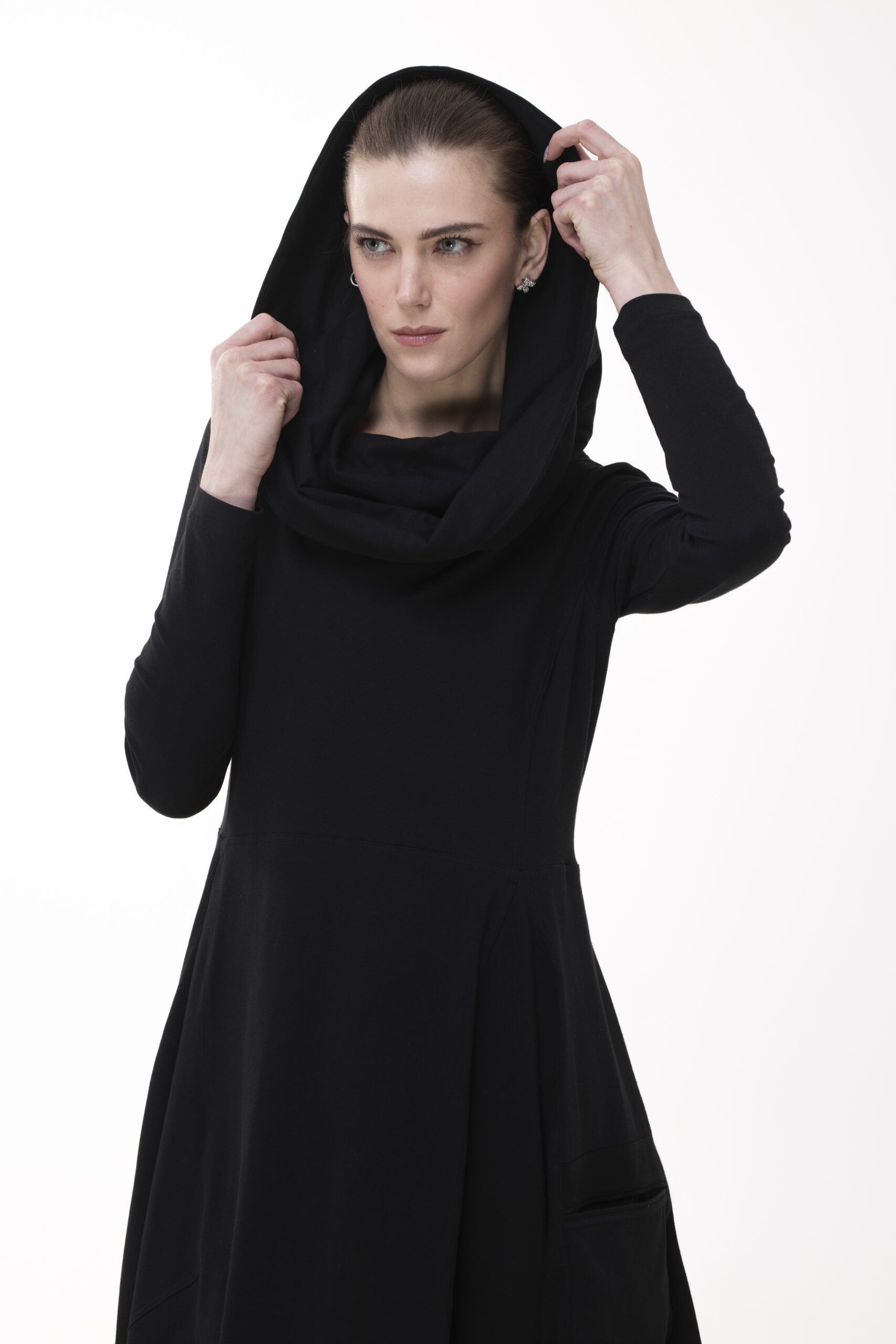 Jej charakterystyczna forma pozwala na swobodę ruchu, a dwie pojemne kieszenie dodają funkcjonalności. Kaptur, który można nosić w różnych wariantach – jako klasyczny kołnierz, osłonę przed wiatrem lub efektowny akcent stylizacji – sprawia, że każda wersja tej sukienki ma swój niepowtarzalny charakter.