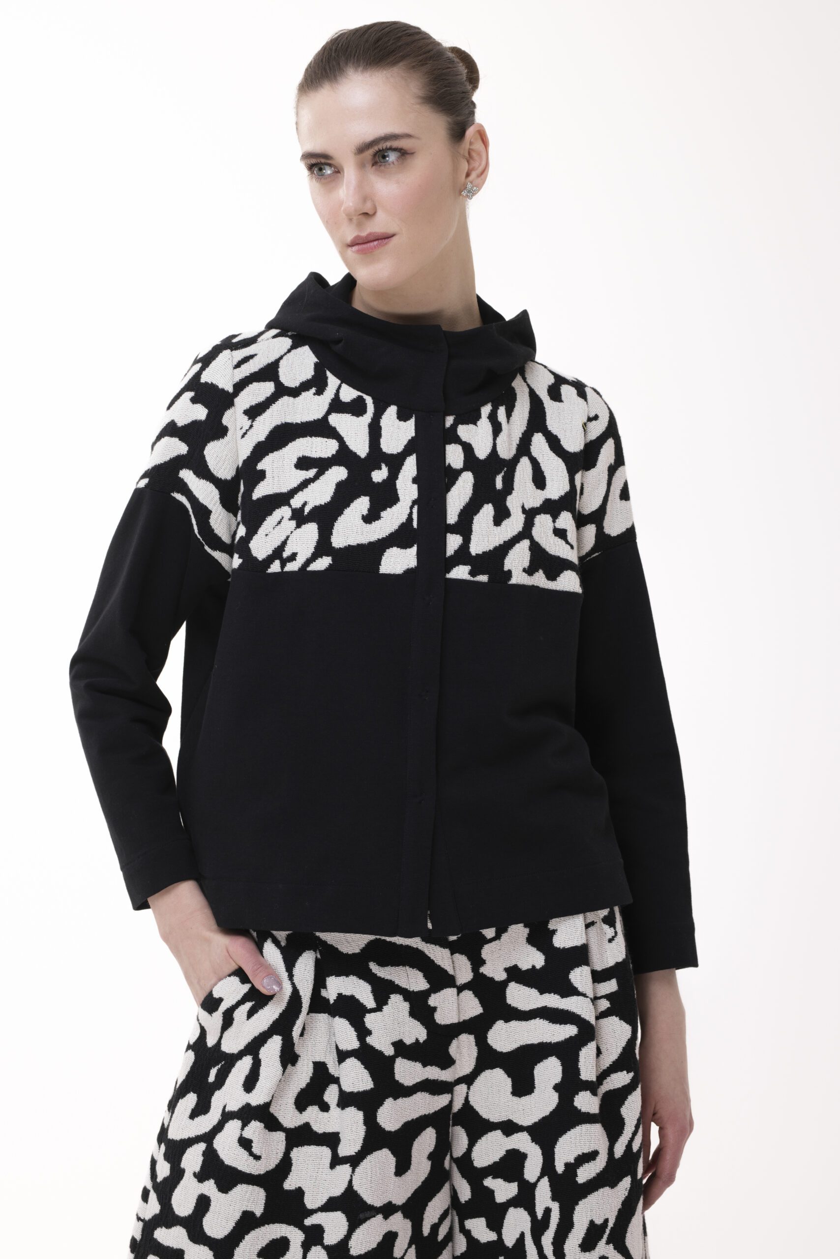 FRAGMENT to bluza, która łączy minimalizm z ekspresją. Kontrastowe połączenie gładkiej bawełny i graficznego wzoru sprawia, że jest równie wyrazista, co uniwersalna. Prosta forma przełamana dynamicznym wzorem nadaje jej nowoczesny charakter, ale nie odbiera jej funkcjonalności.