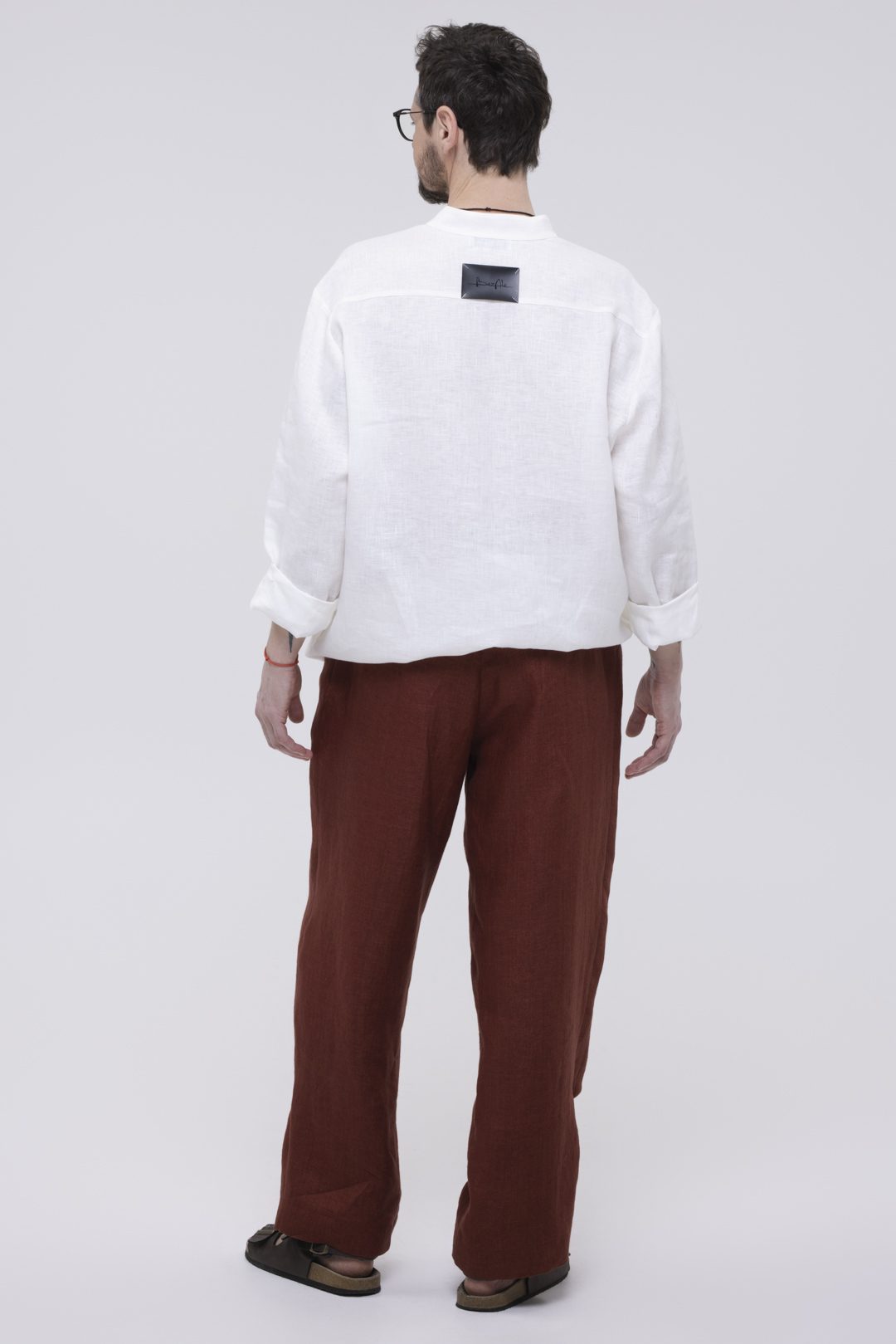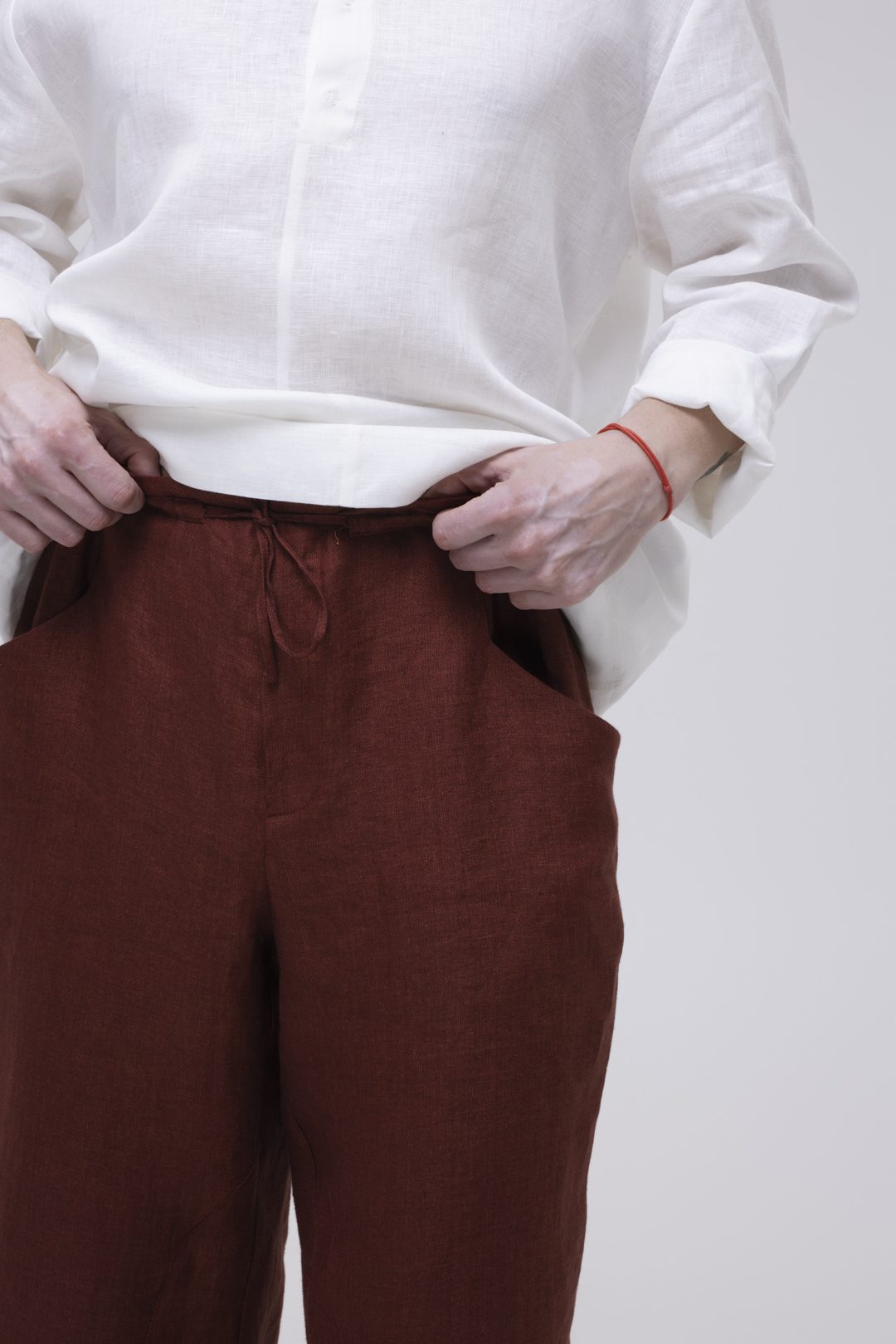 FRAGMENTY to lniane spodnie o prostym kroju, wykończone charakterystycznym „chwytem” materiału z przodu nogawki. Uszyte z naturalnego, oddychającego lnu – idealne na cieplejsze dni i codzienne użytkowanie. W pasie wszyty troczek, który pozwala dopasować spodnie bez sztywnej formy. Model łączy wygodę i funkcjonalność z detalem, która charakteru każdej stylizacji