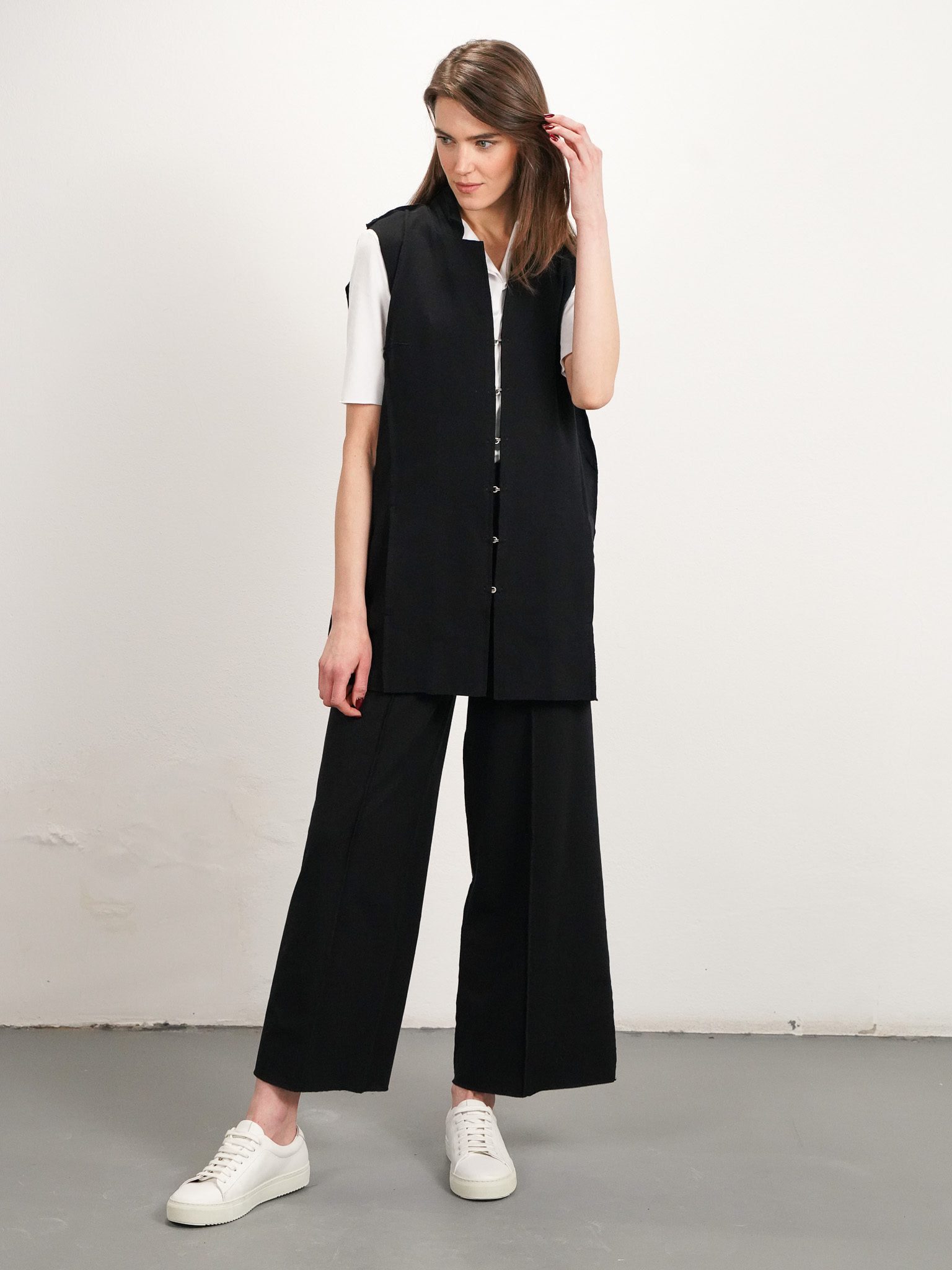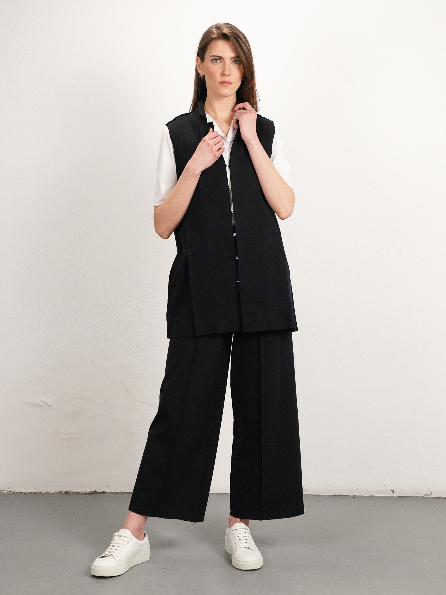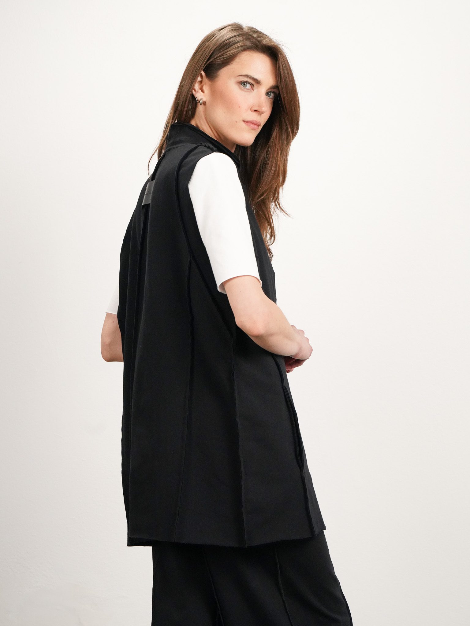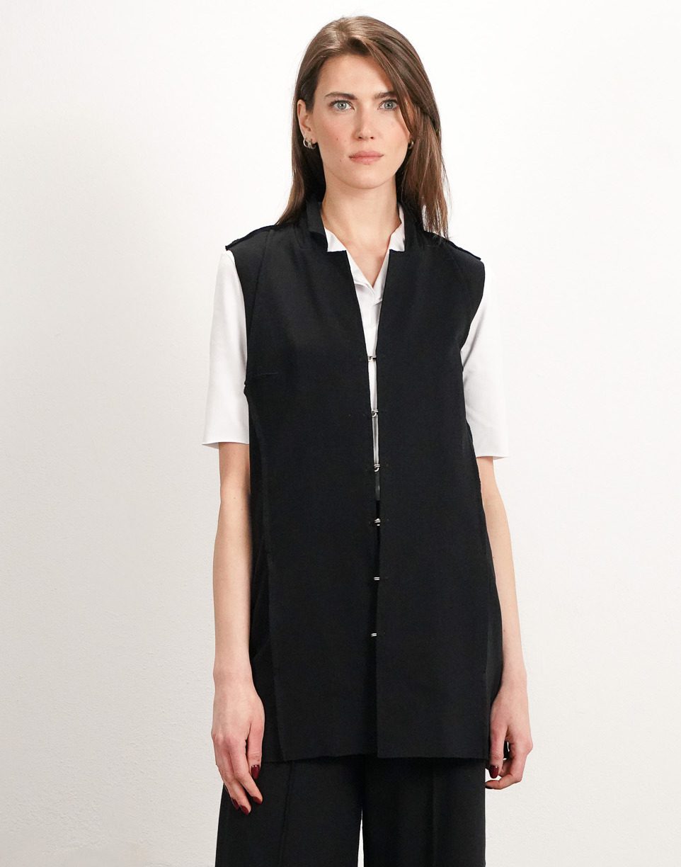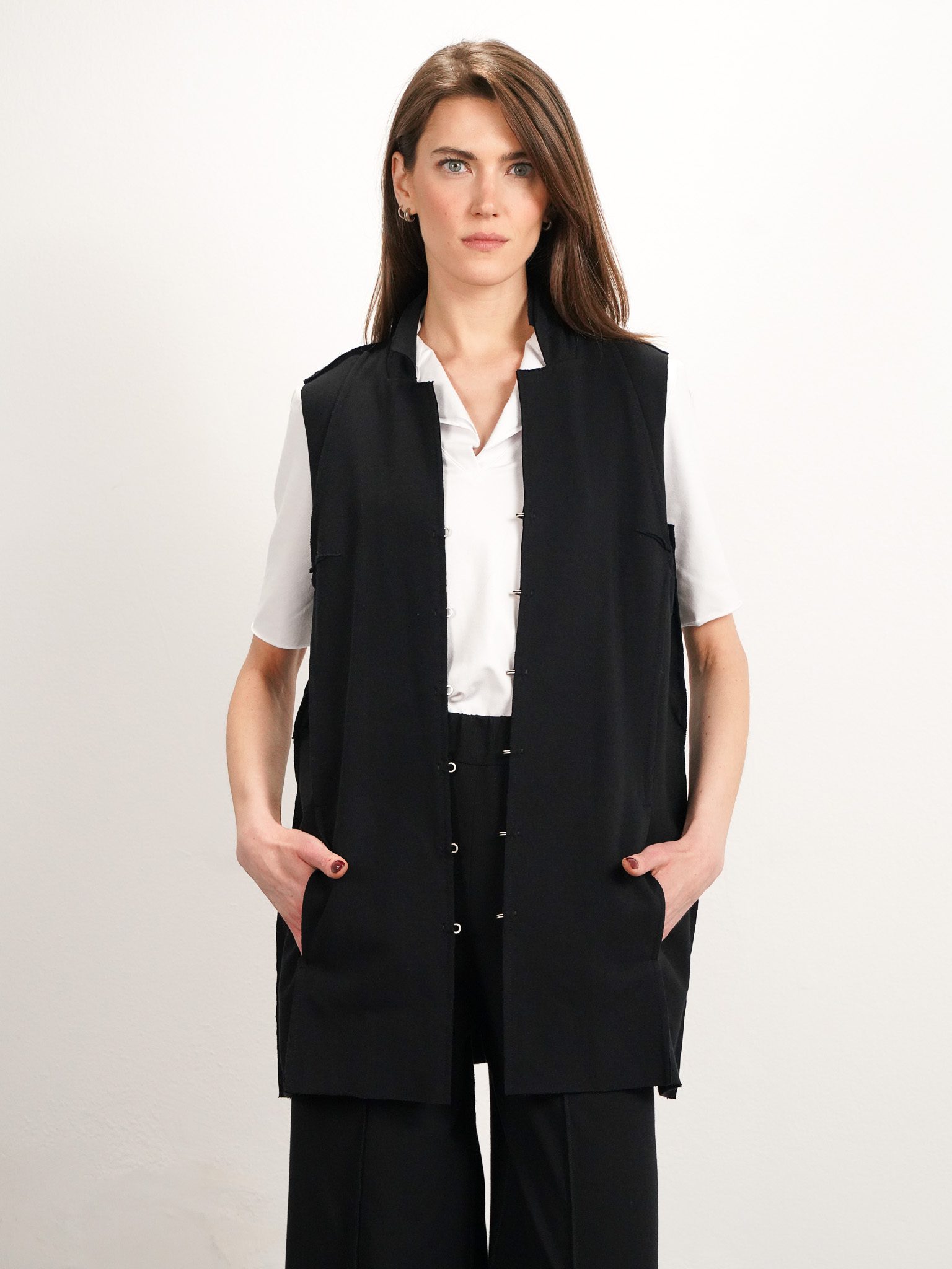 Z praktycznymi kieszeniami w szwach, zapewniającymi miejsce na drobne przedmioty oraz elegancką stójką, ta kamizelka dodaje szyku każdej stylizacji. Wybierając ją, wybierasz wygodę i elegancję w każdej sytuacji.