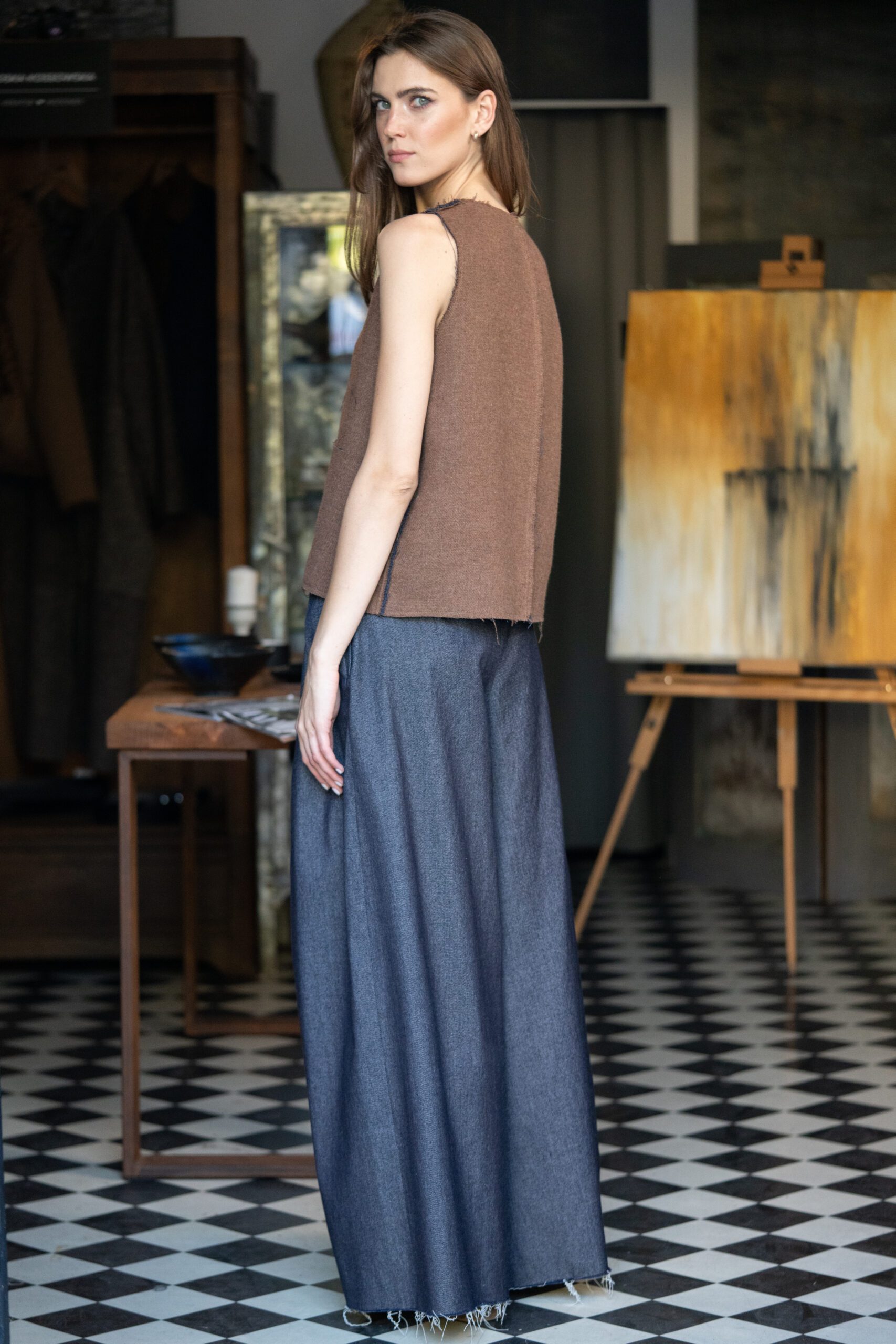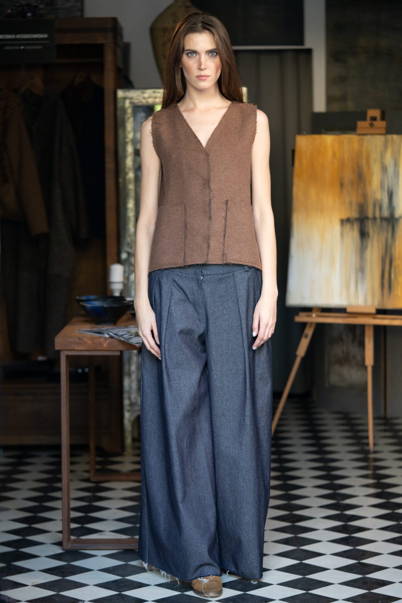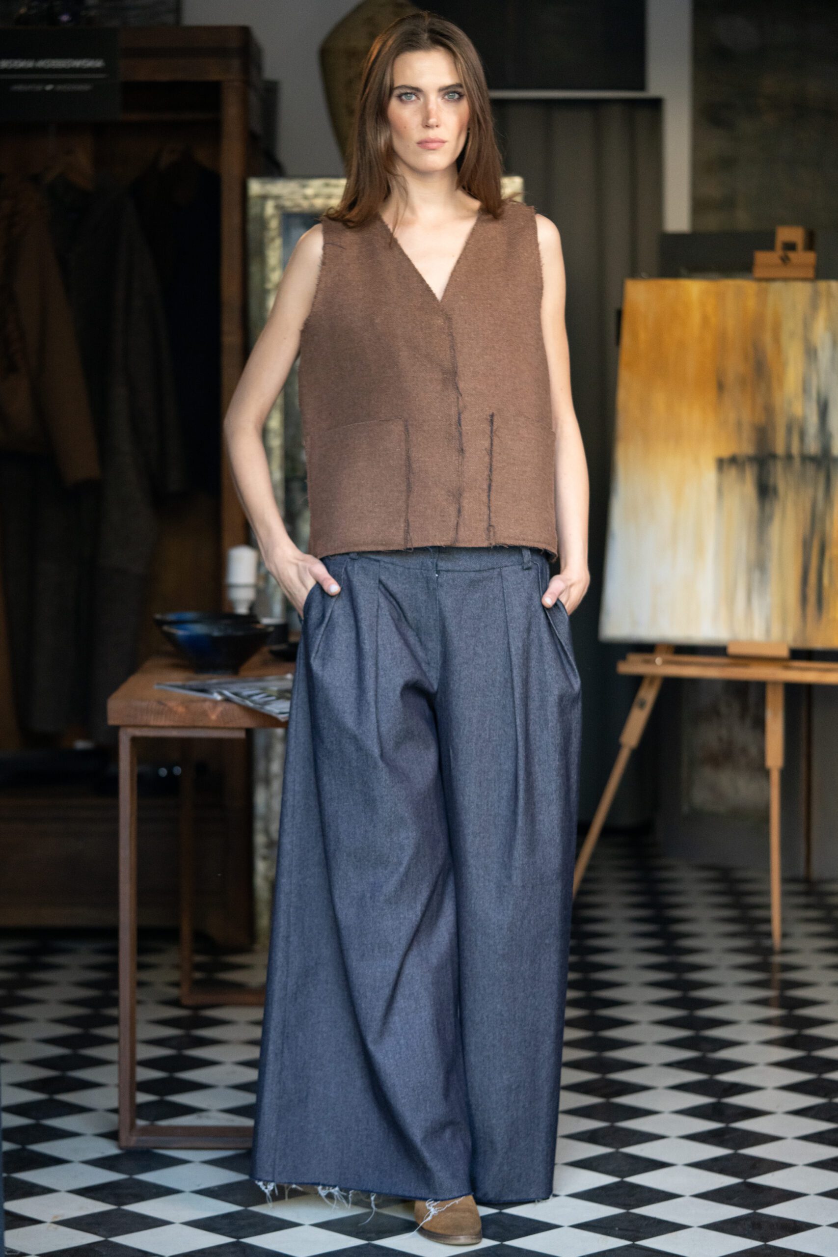 To niezwykle wszechstronny element garderoby, który doskonale pasuje zarówno do eleganckich stylizacji, jak i codziennych zestawów. Wyjątkowy detal, czyli surowe szwy, nadają kamizelce artystycznego wyrazu i sprawiają, że staje się ona prawdziwym dziełem sztuki.