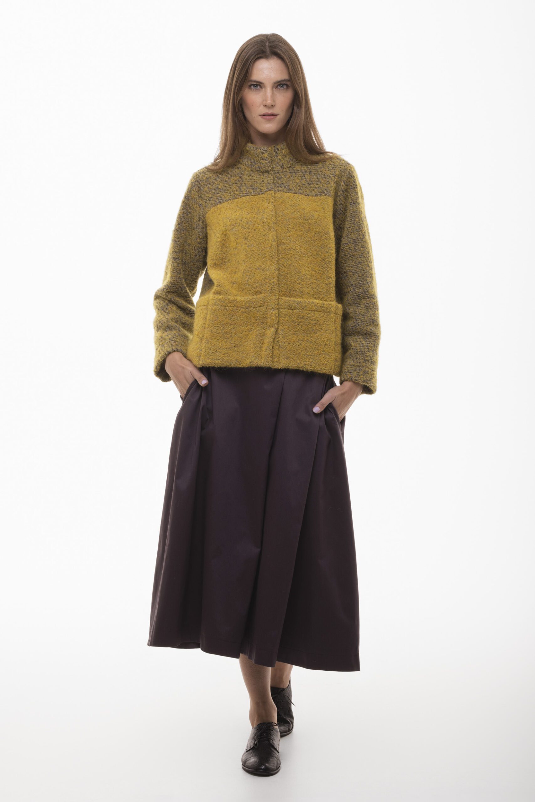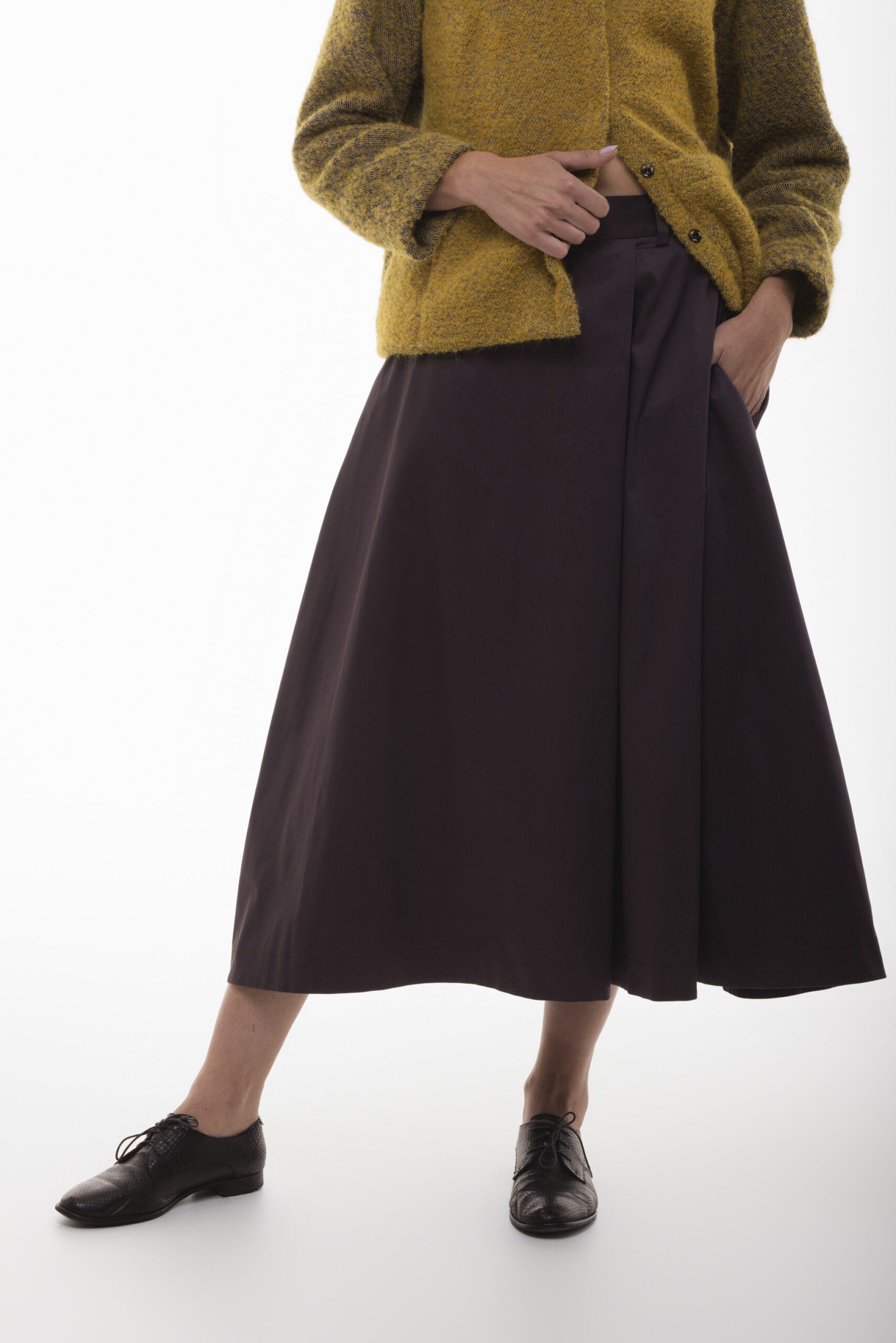 Spódnica Kaskada to połączenie klasycznej elegancji z nutą natury. Wykonana z wysokiej jakości, miękkiej tkaniny, w głębokim odcieniu ciemnej śliwki, ta spódnica jest idealna zarówno na co dzień, jak i na specjalne okazje. Zakładki dodają jej struktury, podkreślając kobiecą sylwetkę i nadając całości lekkości oraz subtelnego ruchu.
