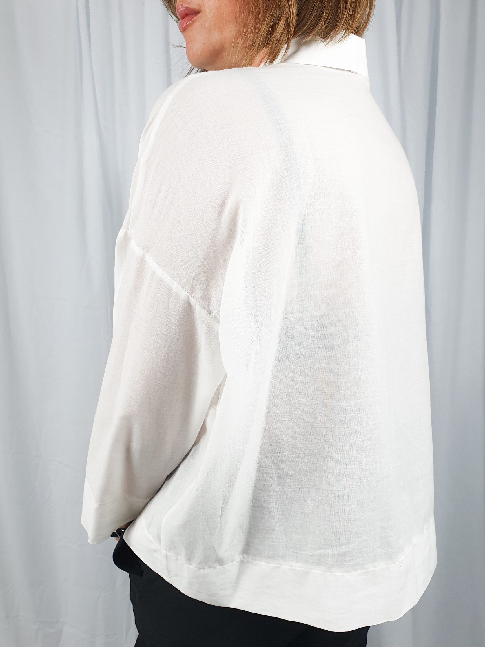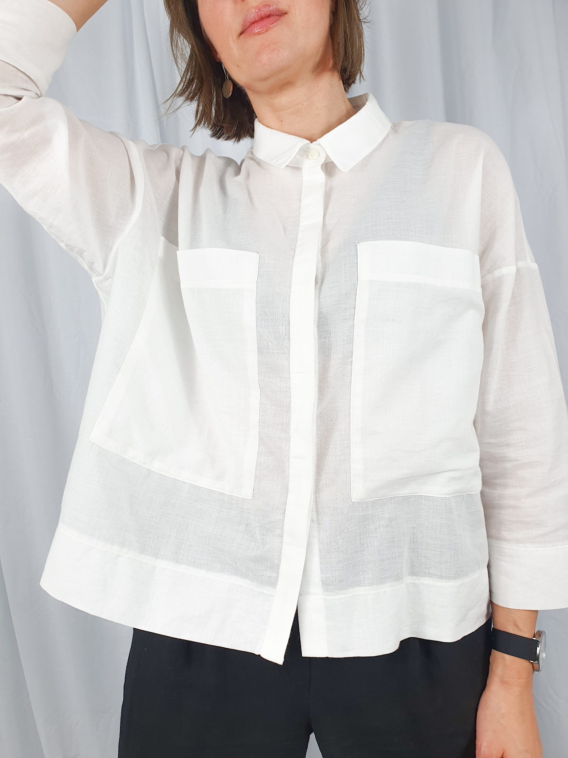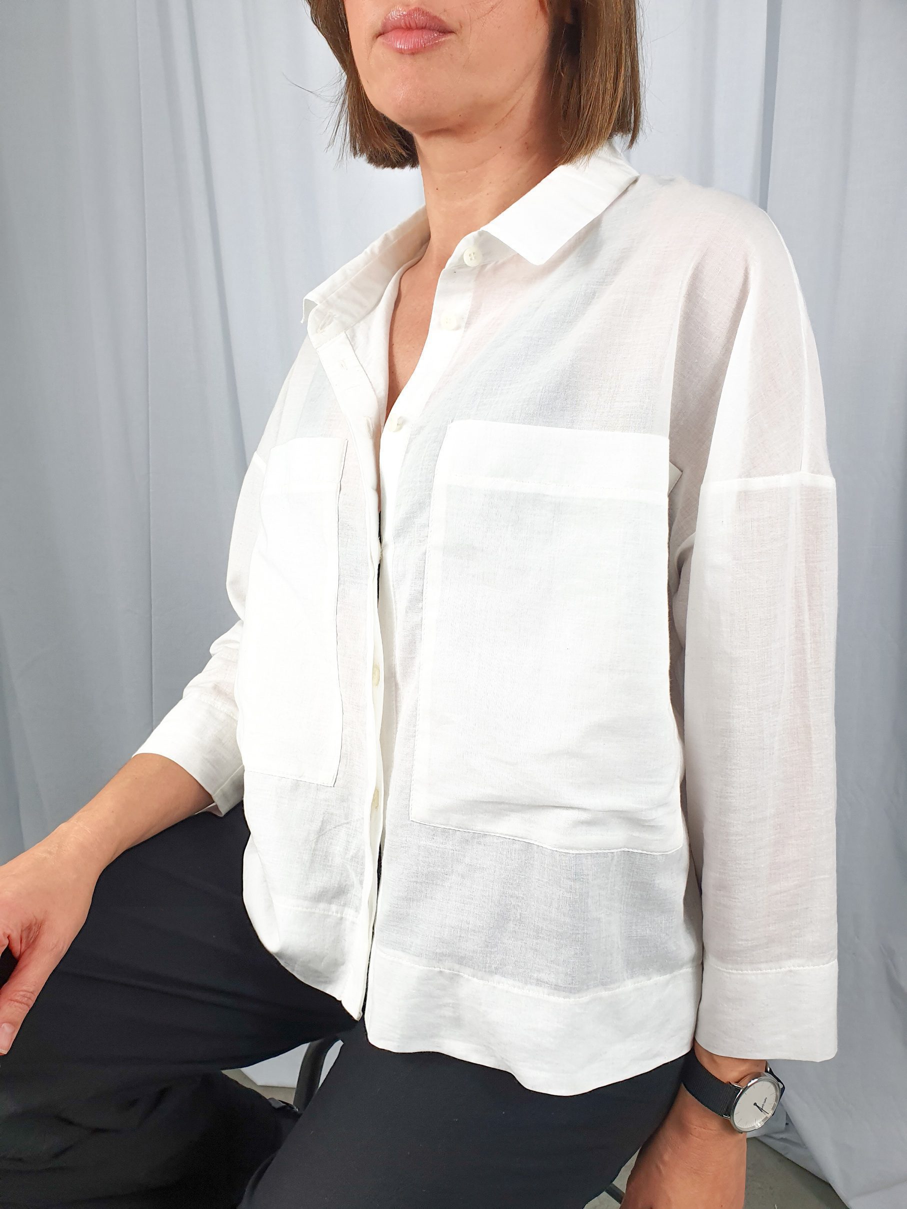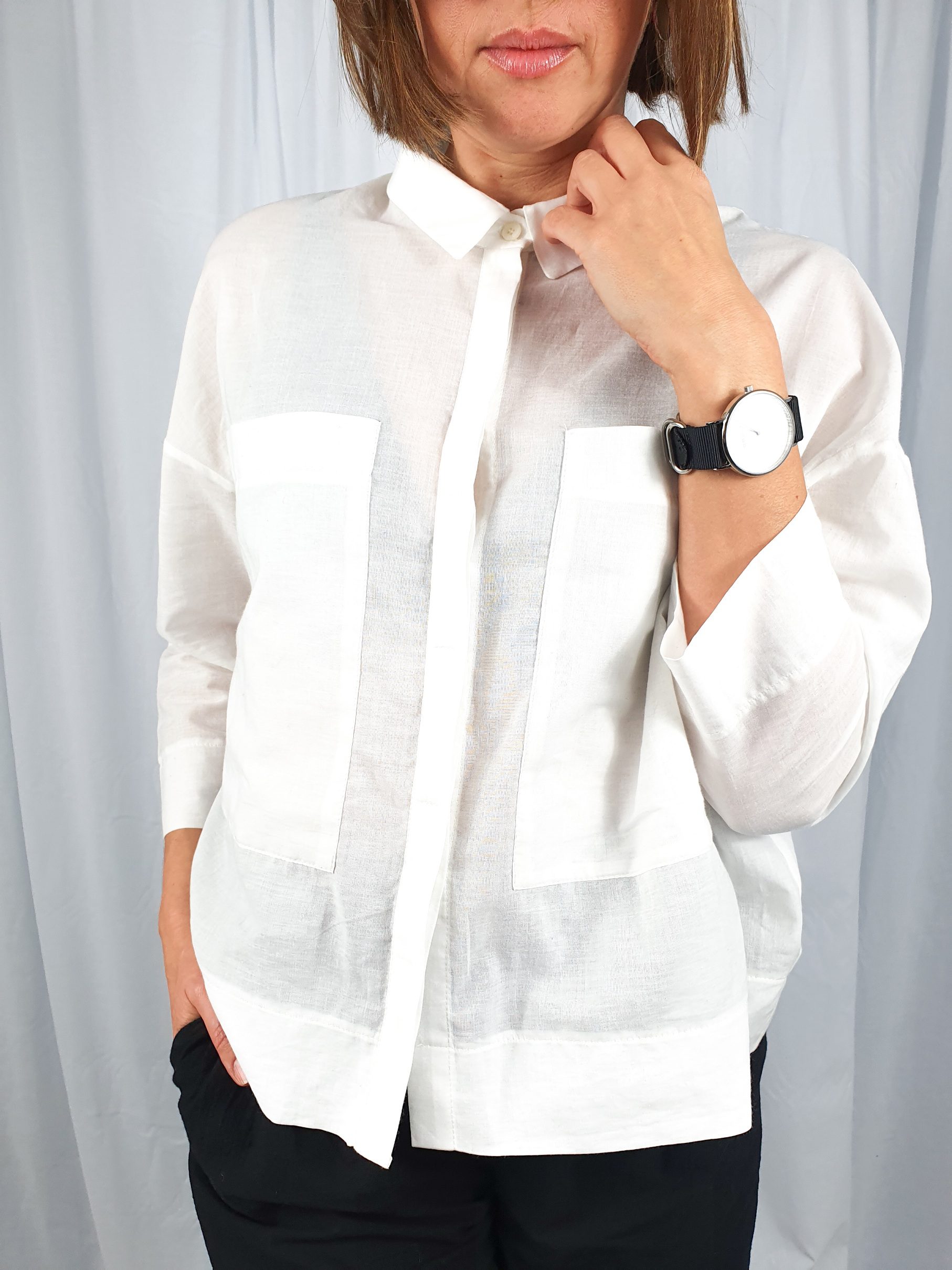 Luźna, krótsza koszula uszyta z cienkiej, lekko przezroczystej tkaniny bawełnianej. Mały kołnierzyk, rękaw 7/8, na biuście naszyte duże kieszenie, zapinana na guziki. To idealna baza do tworzenia stylizacji w każdym stylu – od tych bardziej formalnych, po casualowe.