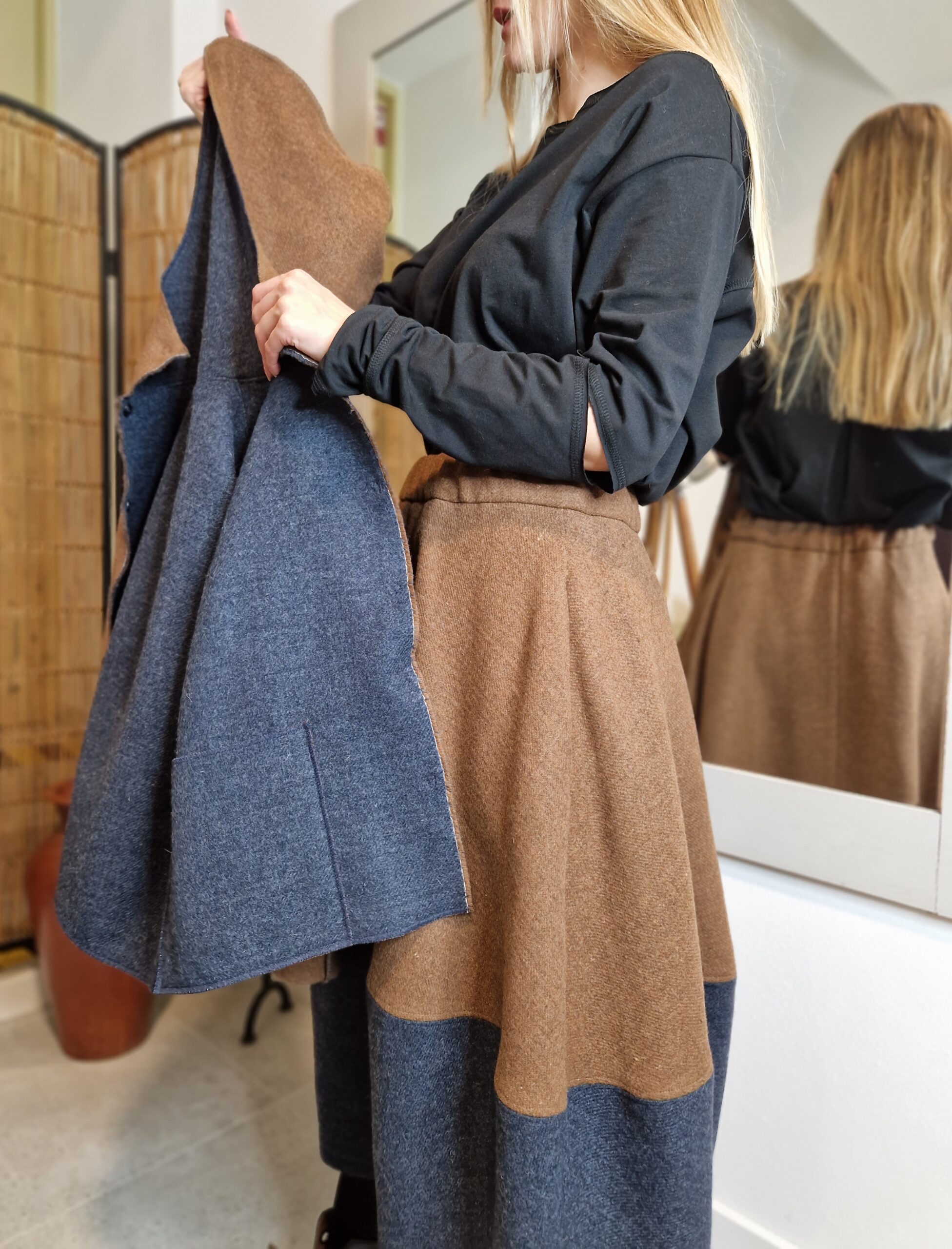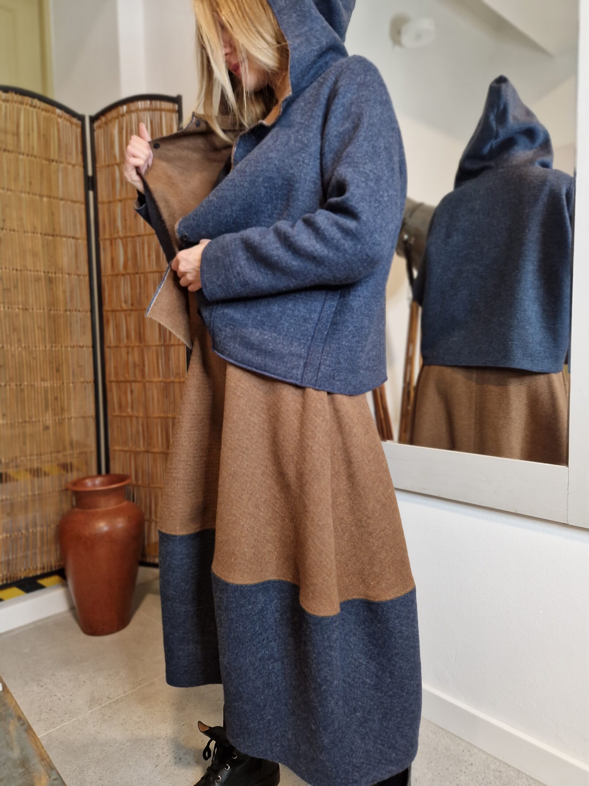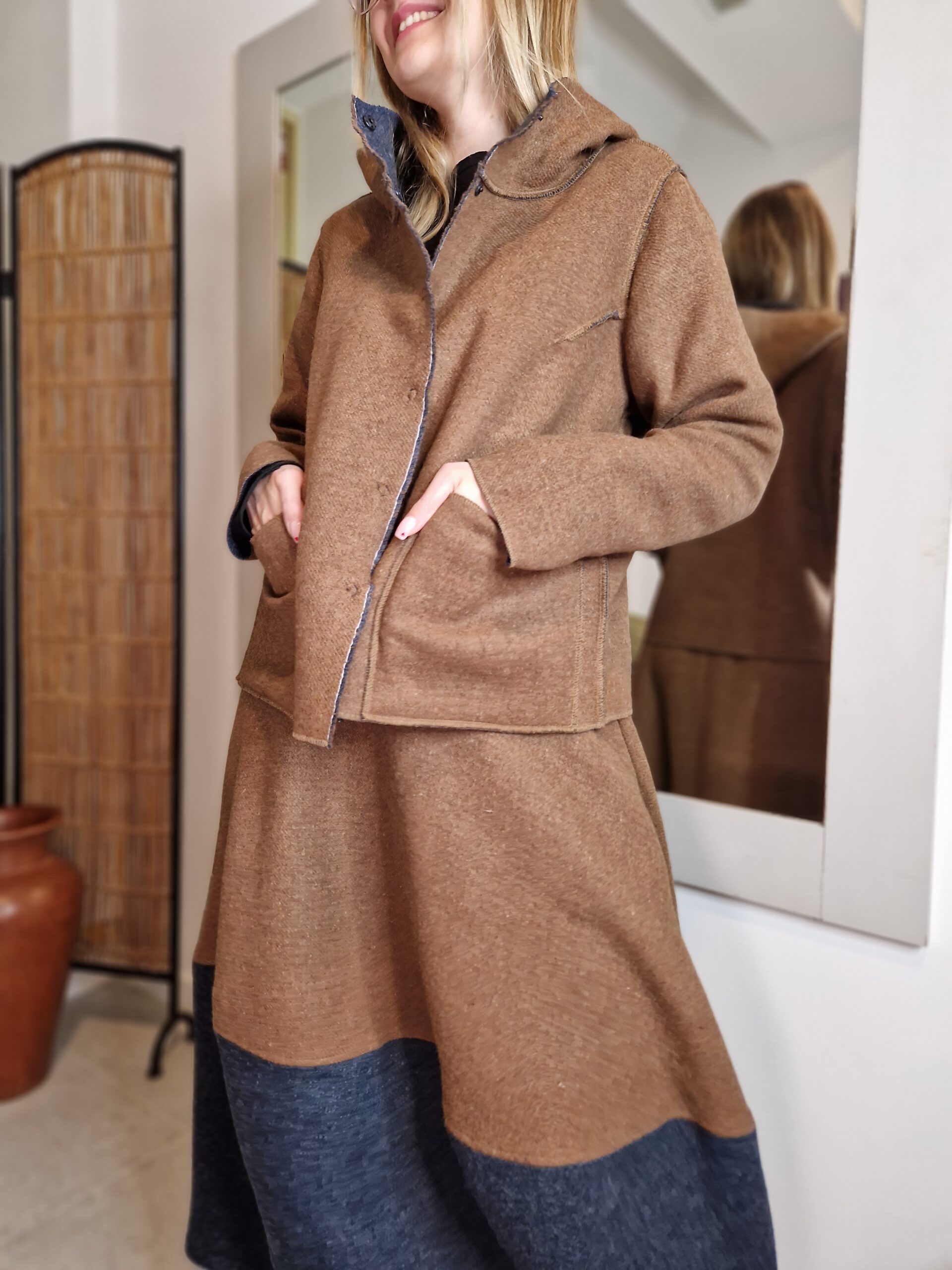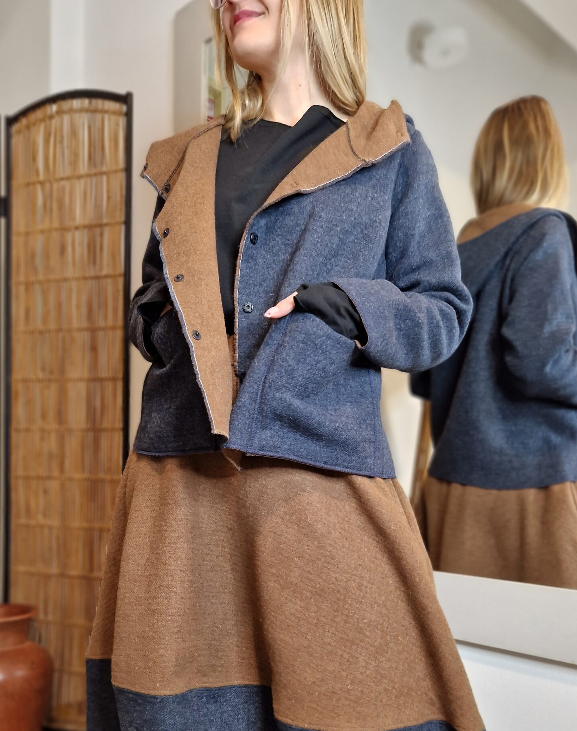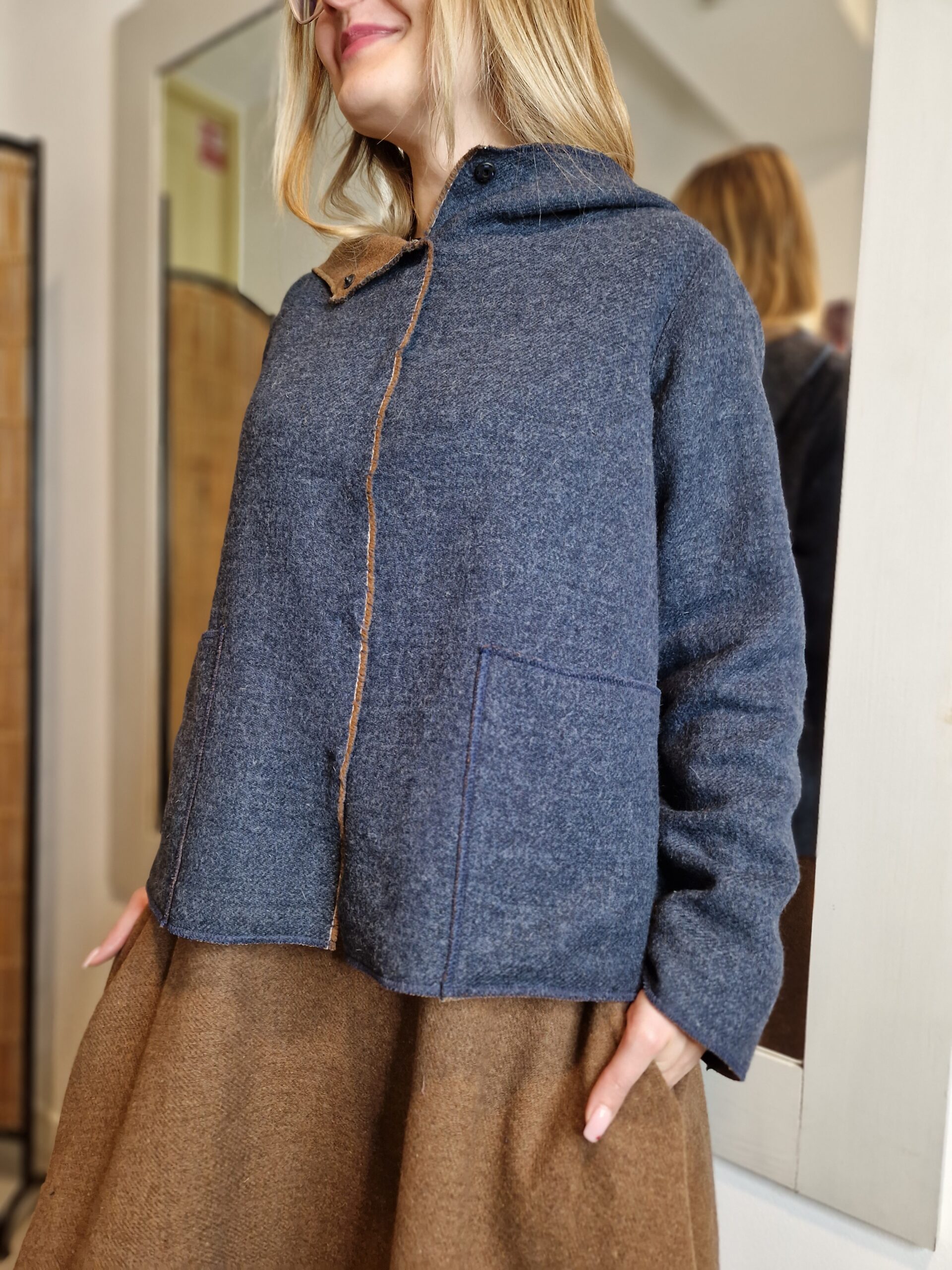 Nasza wełniana krótka kurtka DWUSTRONNA równie dobrze może pełnić rolę bluzy, to esencja okresu przejściowego.