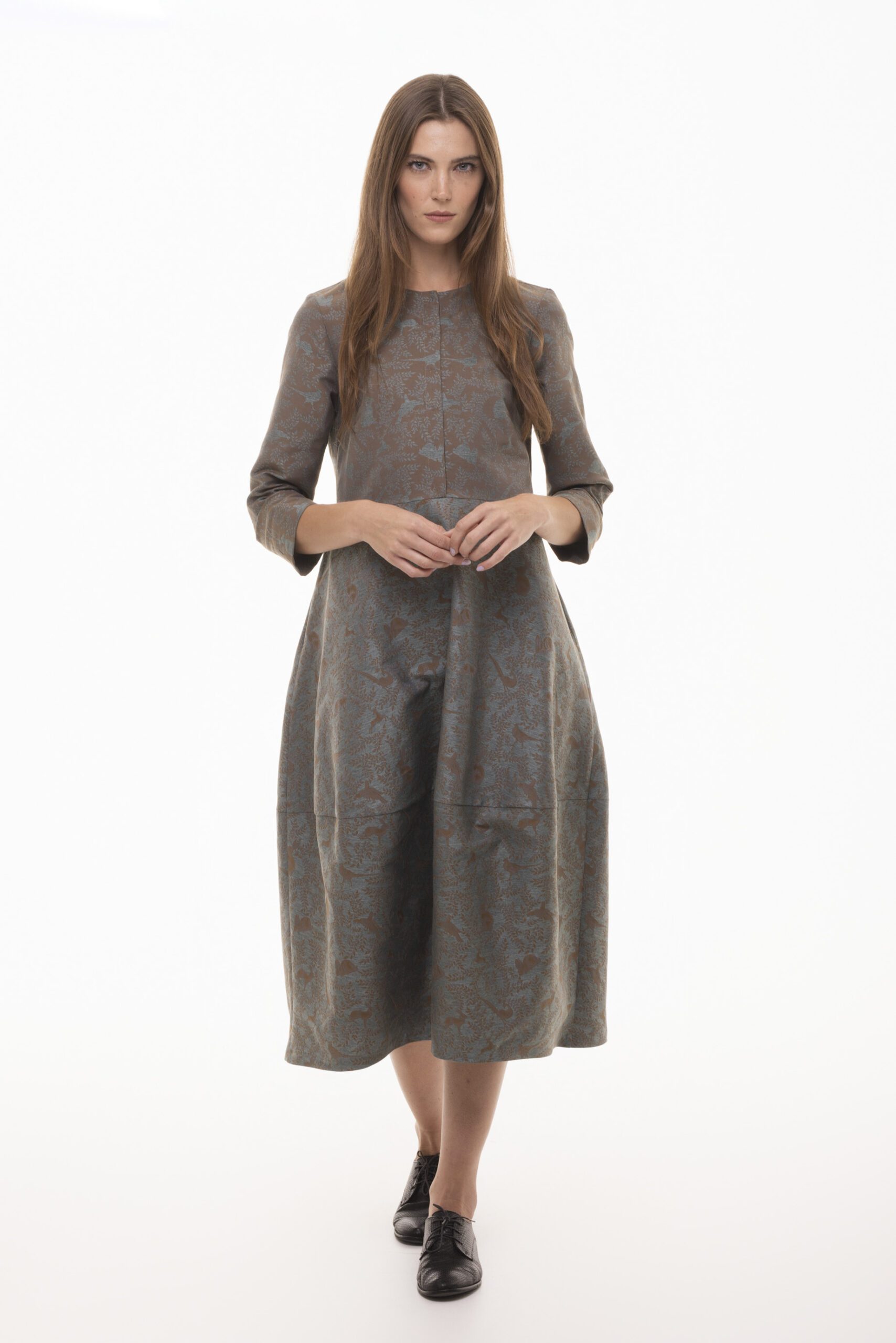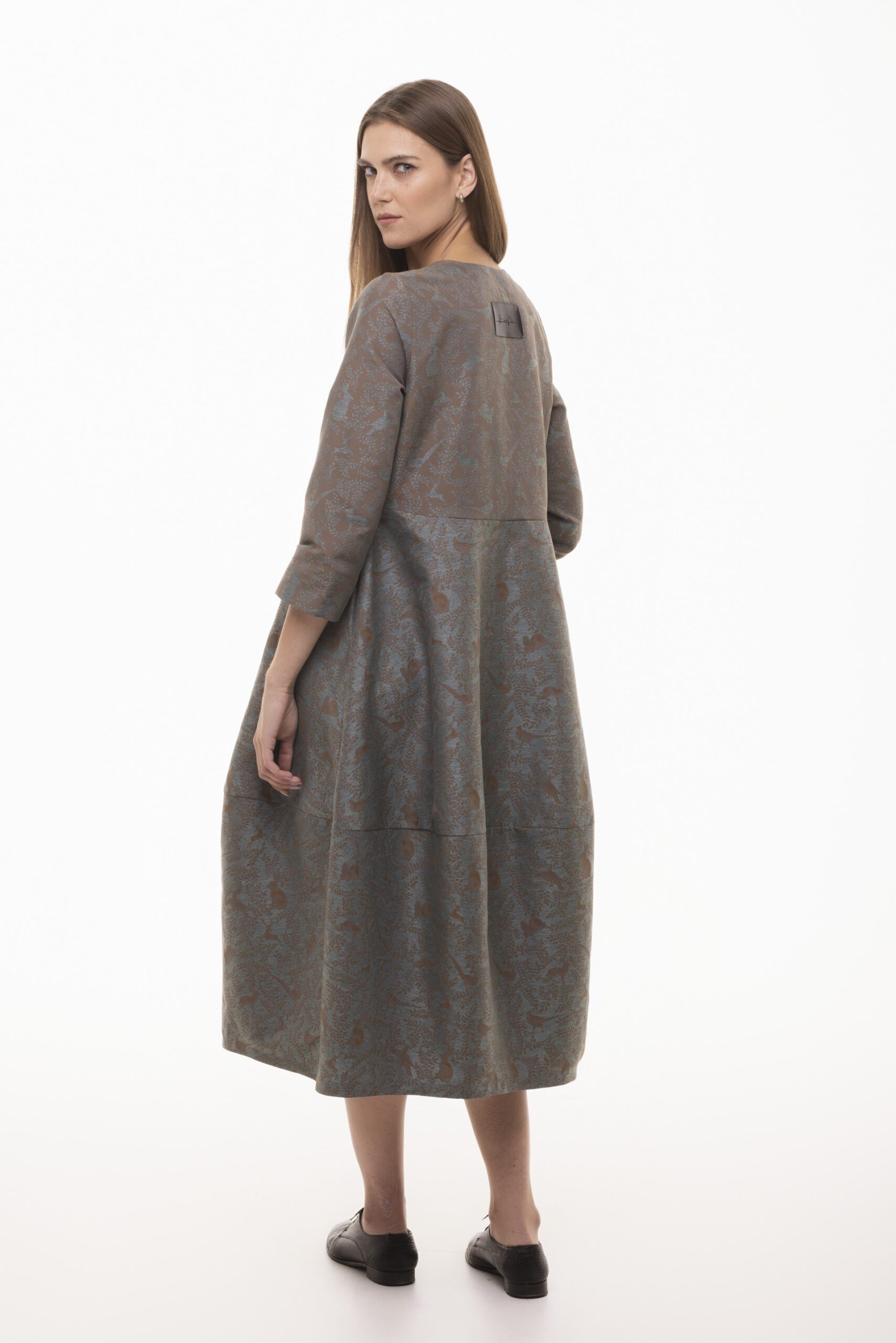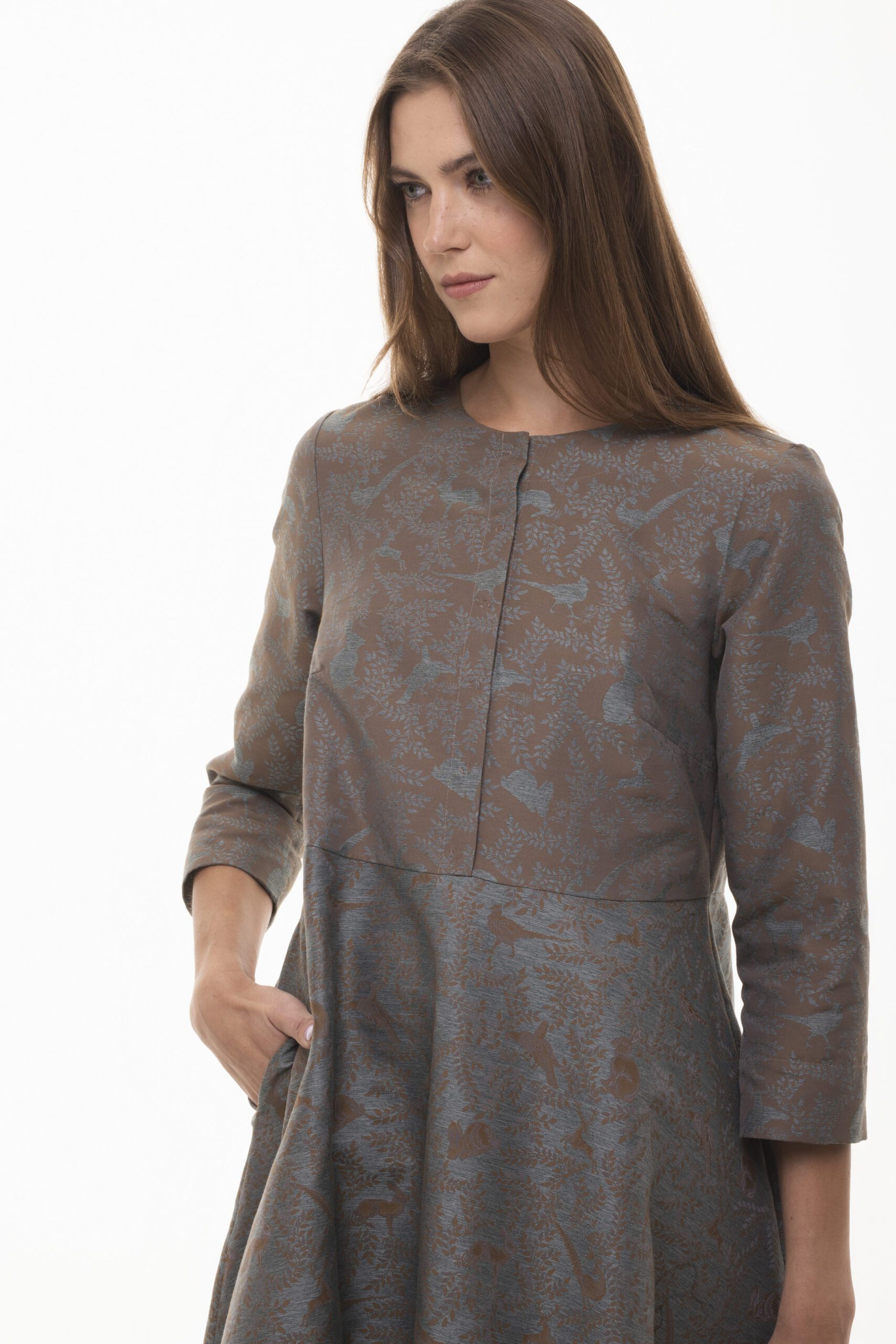 Sukienka Leśna Bajka to esencja naturalnej elegancji, która łączy subtelną formę z wyrafinowanym wzornictwem. Jest to jesienna odsłona bestsellerowej Młynarki. Żakardowa tkanina inspirowana jest bogactwem przyrody – delikatne gałązki i subtelny motyw leśnych zwierząt nawiązują do lasu, tworząc harmonijną całość. Wzór w odcieniach brązu i przygaszonej zieleni podkreśla naturalny charakter sukienki, czyniąc ją wyjątkowym elementem garderoby.