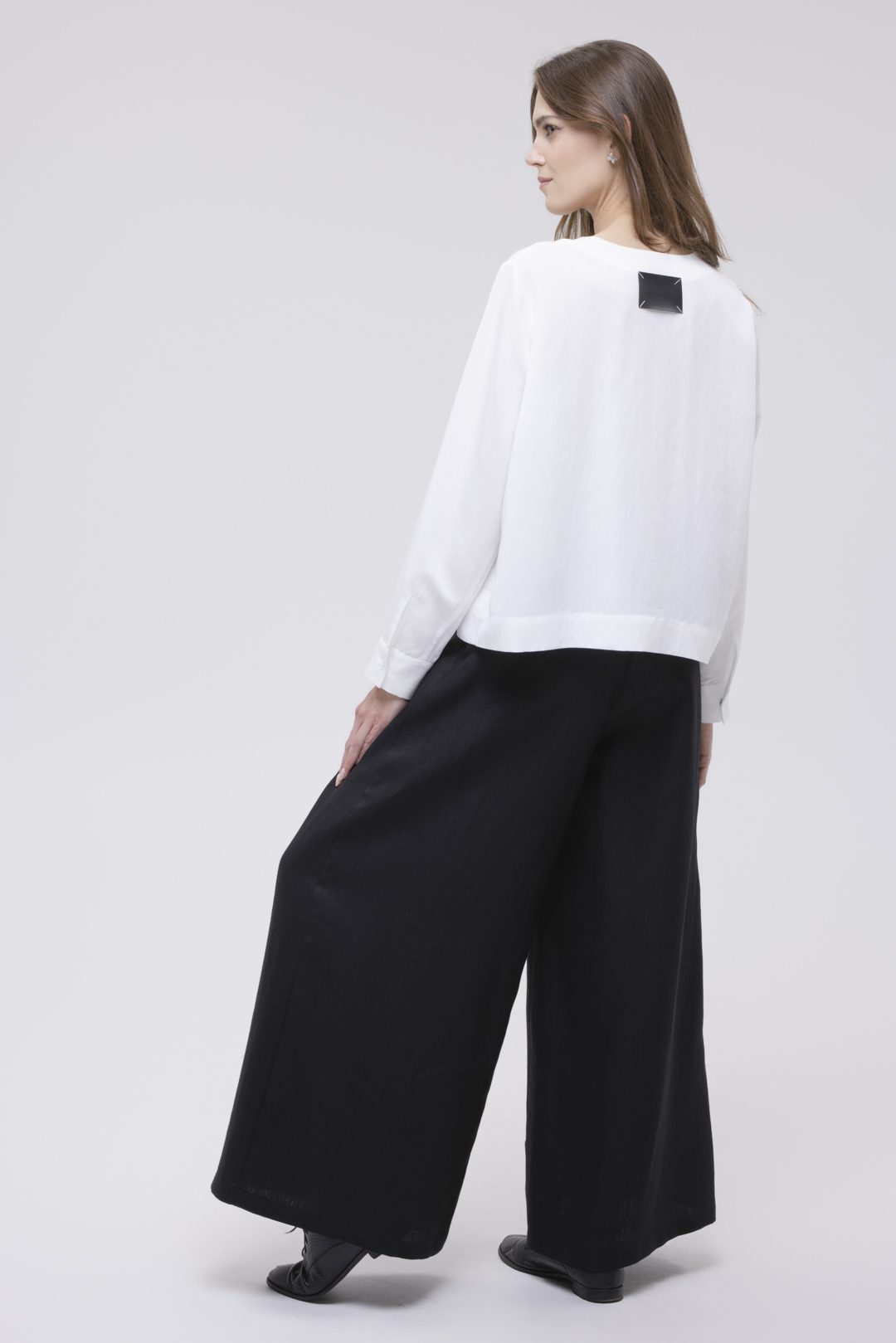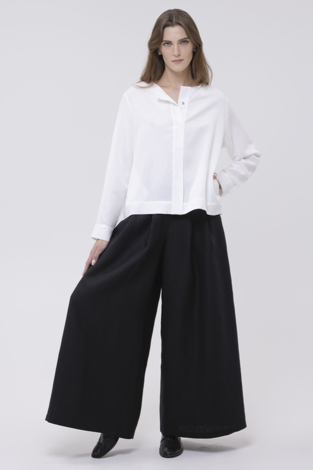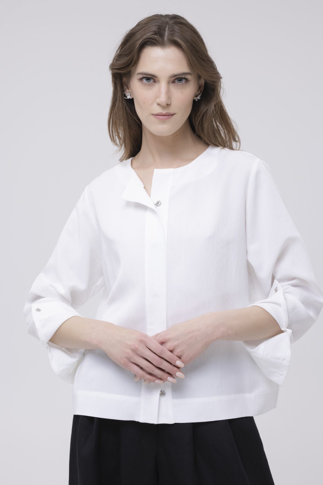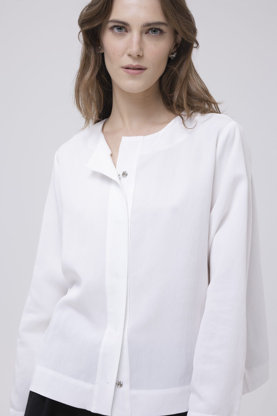 Bez kołnierza – z subtelnie zaokrąglonym wykończeniem przy szyi. Koszula z niespodzianką – posiada kieszenie.