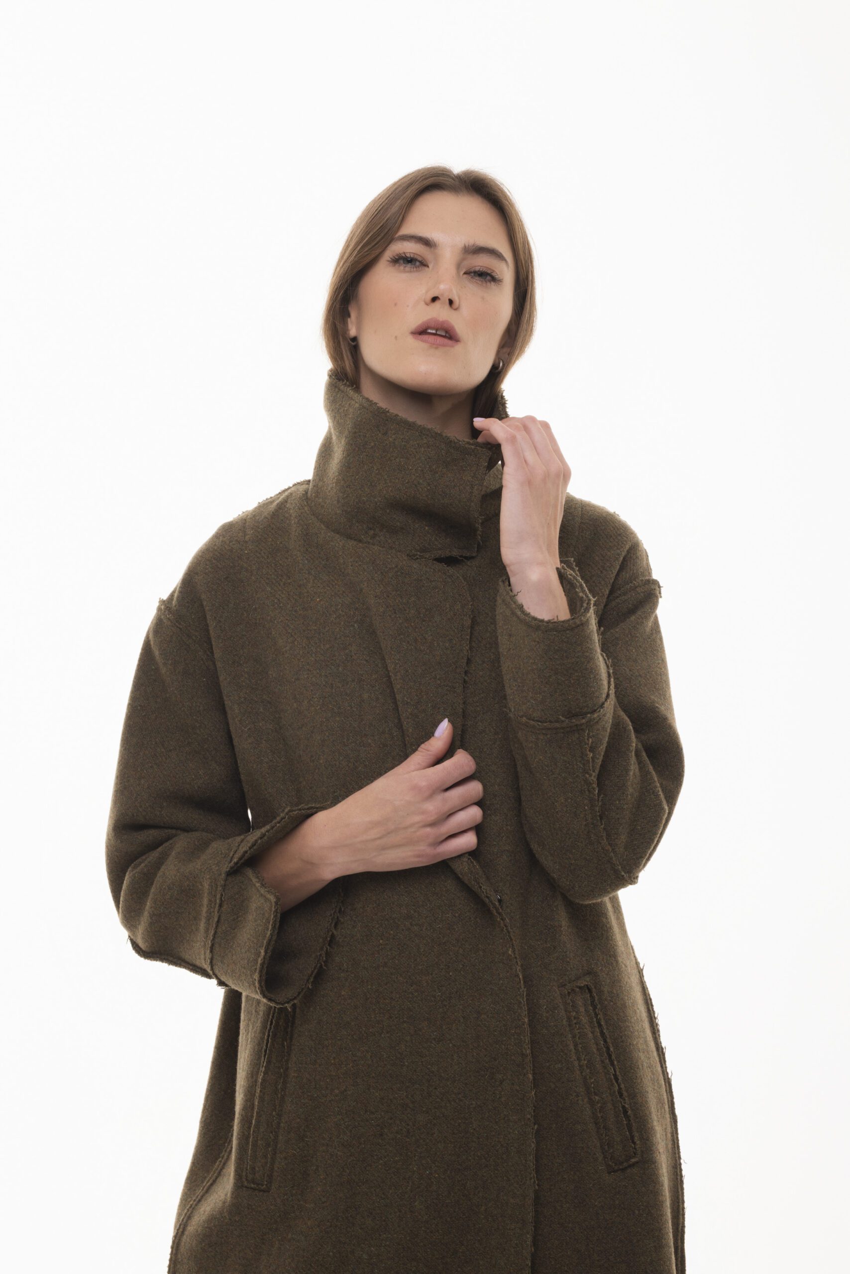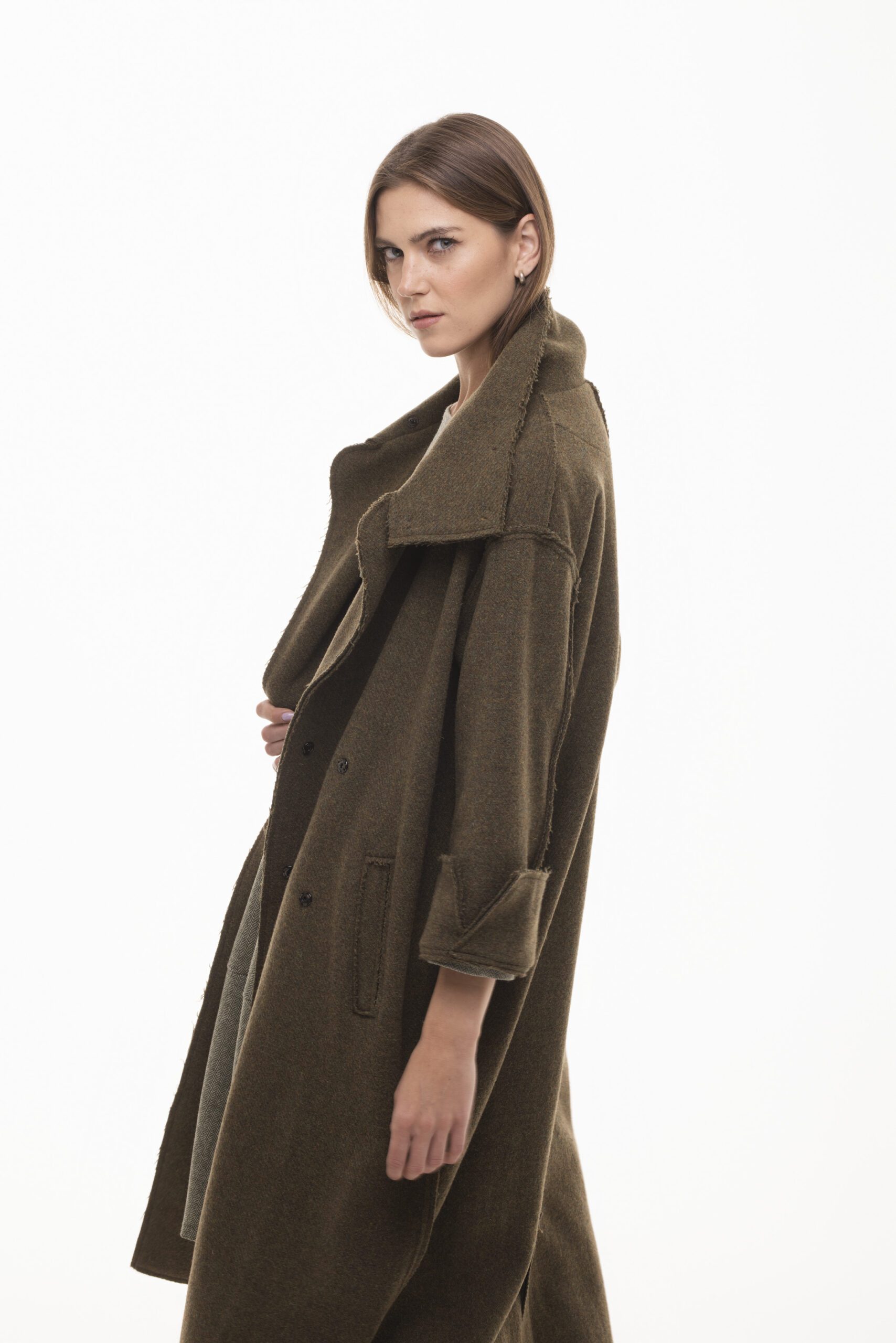 Wełna przypominająca w dotyku mech, nadaje temu płaszczowi niepowtarzalny wygląd, który z pewnością wyróżni Cię na tle miejskiego krajobrazu. Skośne kieszenie zapewniają funkcjonalność, a tylny rozporek zwiększa komfort noszenia, pozwalając na swobodne poruszanie się w chłodniejsze dni. Mankiety z delikatnymi cięciami dodają subtelnego, artystycznego akcentu, idealnie dopełniając całości.