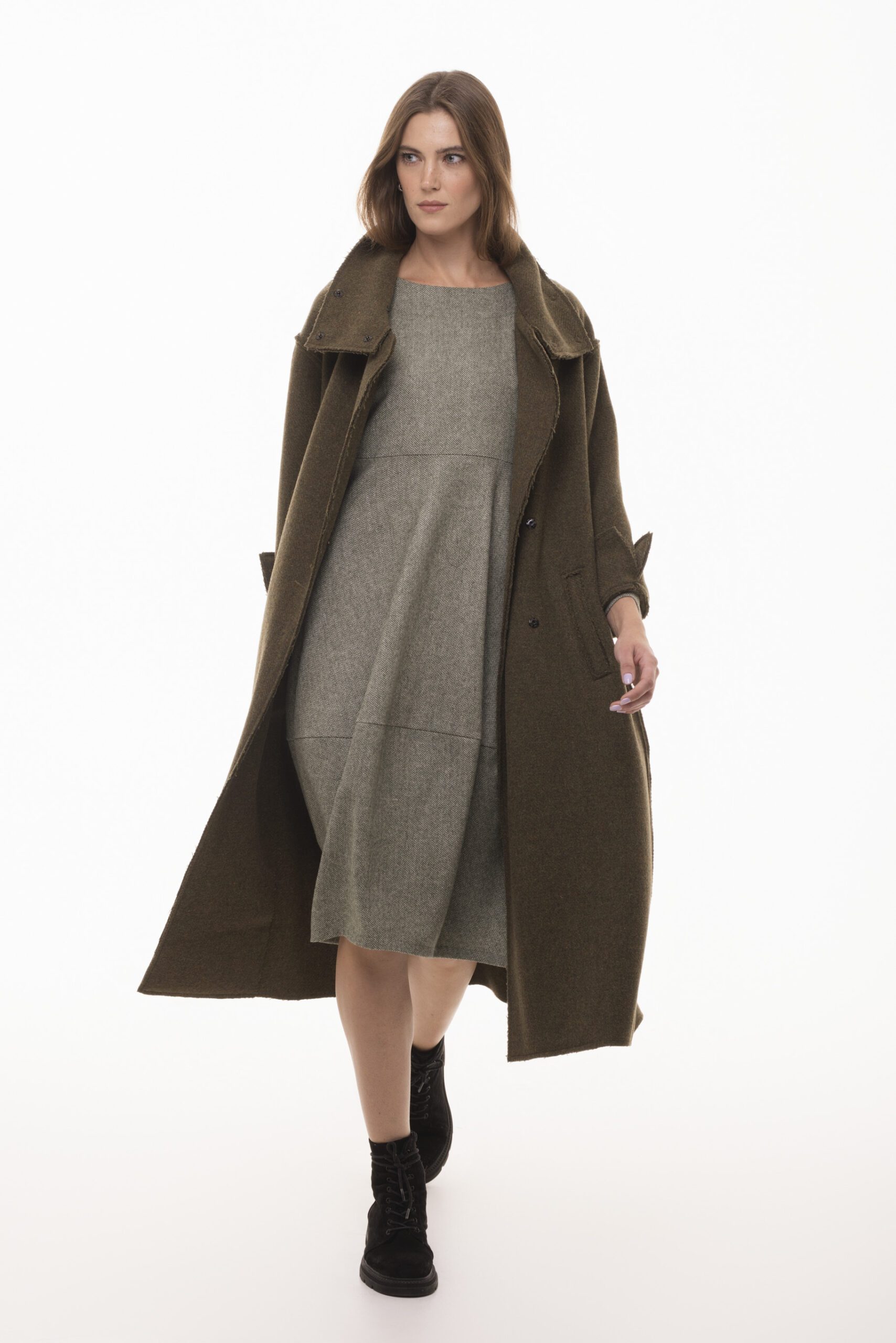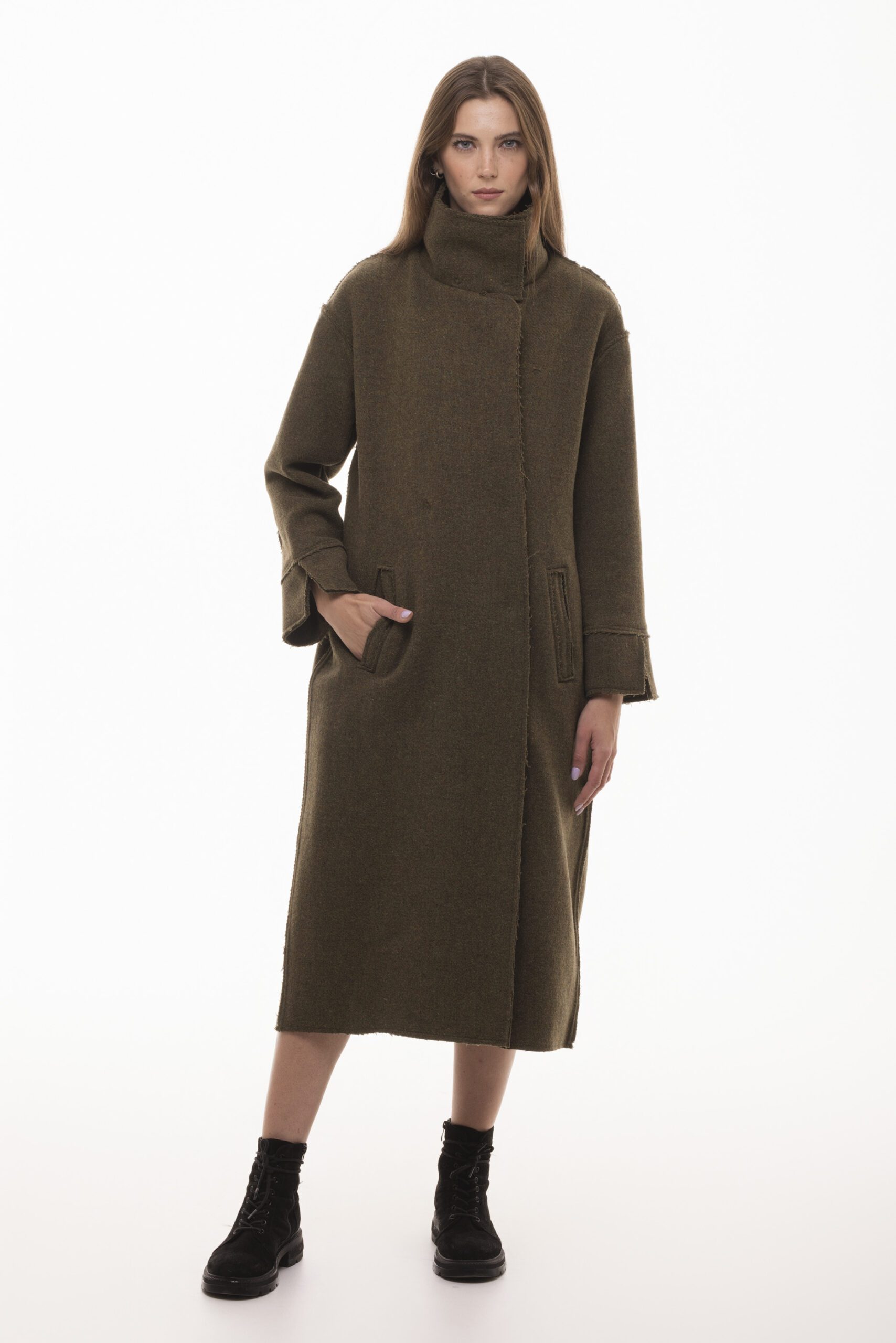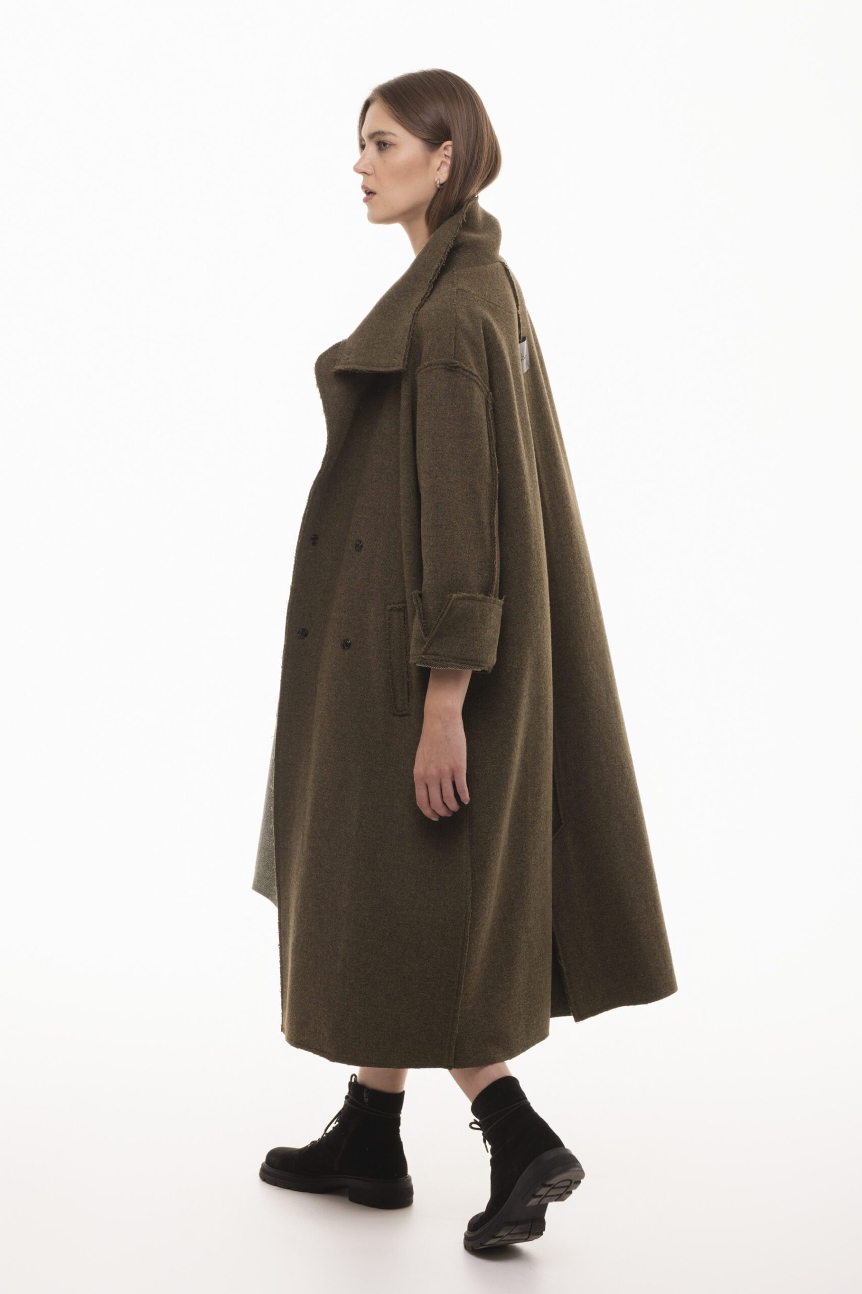 Mech – długi, wełniany płaszcz dwurzędowy. Ten prosty, a zarazem elegancki płaszcz łączy minimalistyczny design z wyrafinowanymi detalami. Wysoki kołnierz, zapinany na zatrzaski, skutecznie chroni przed chłodnym wiatrem, podkreślając jednocześnie szykowny charakter płaszcza. Dwurzędowe zapięcie i surowe wykończenie dodają całości nowoczesnej, nieco surowej elegancji.