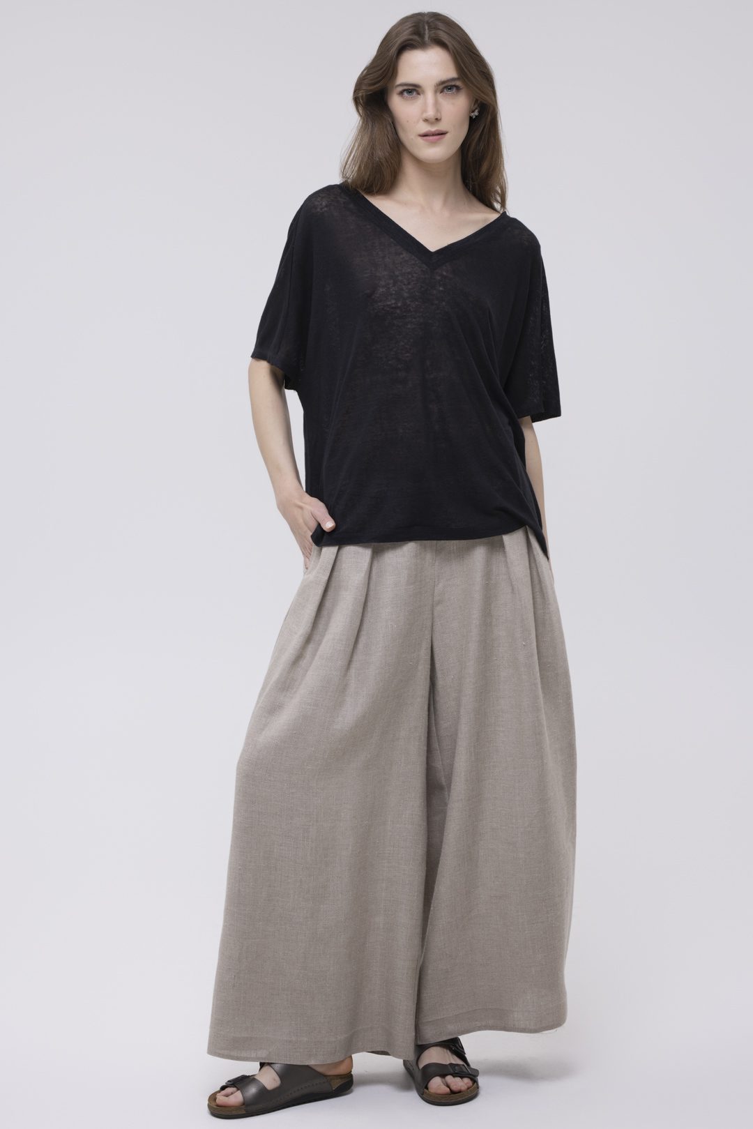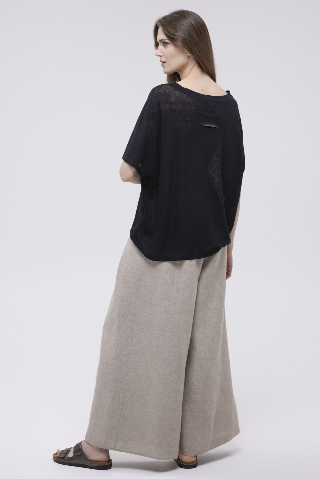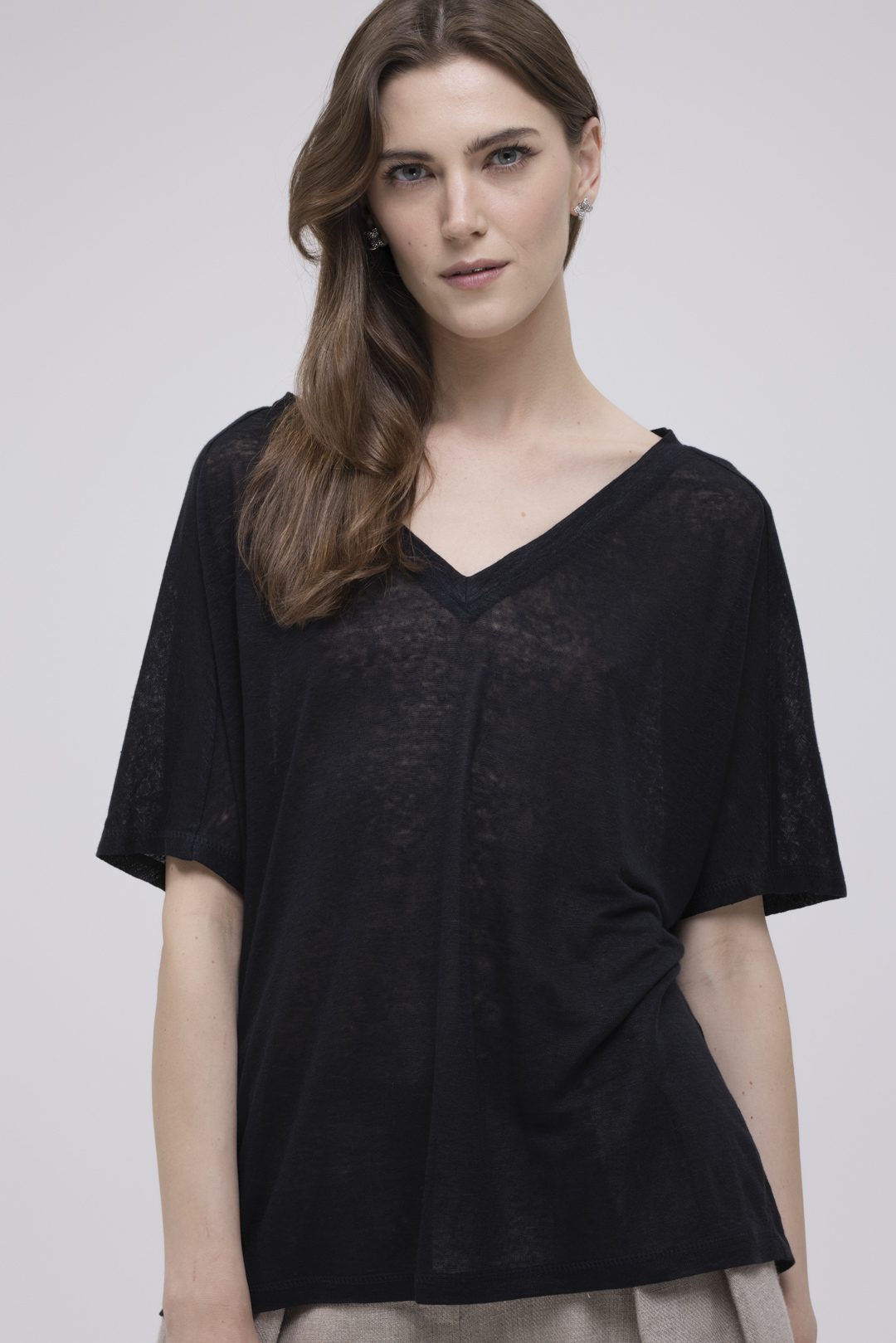 Uszyta z cienkiej dzianiny lnianej, przewiewna i lekka, ale trzymająca formę. Dekolt w kształcie litery V wydłuża szyję, a lekko opadający rękaw daje swobodę w ramionach.