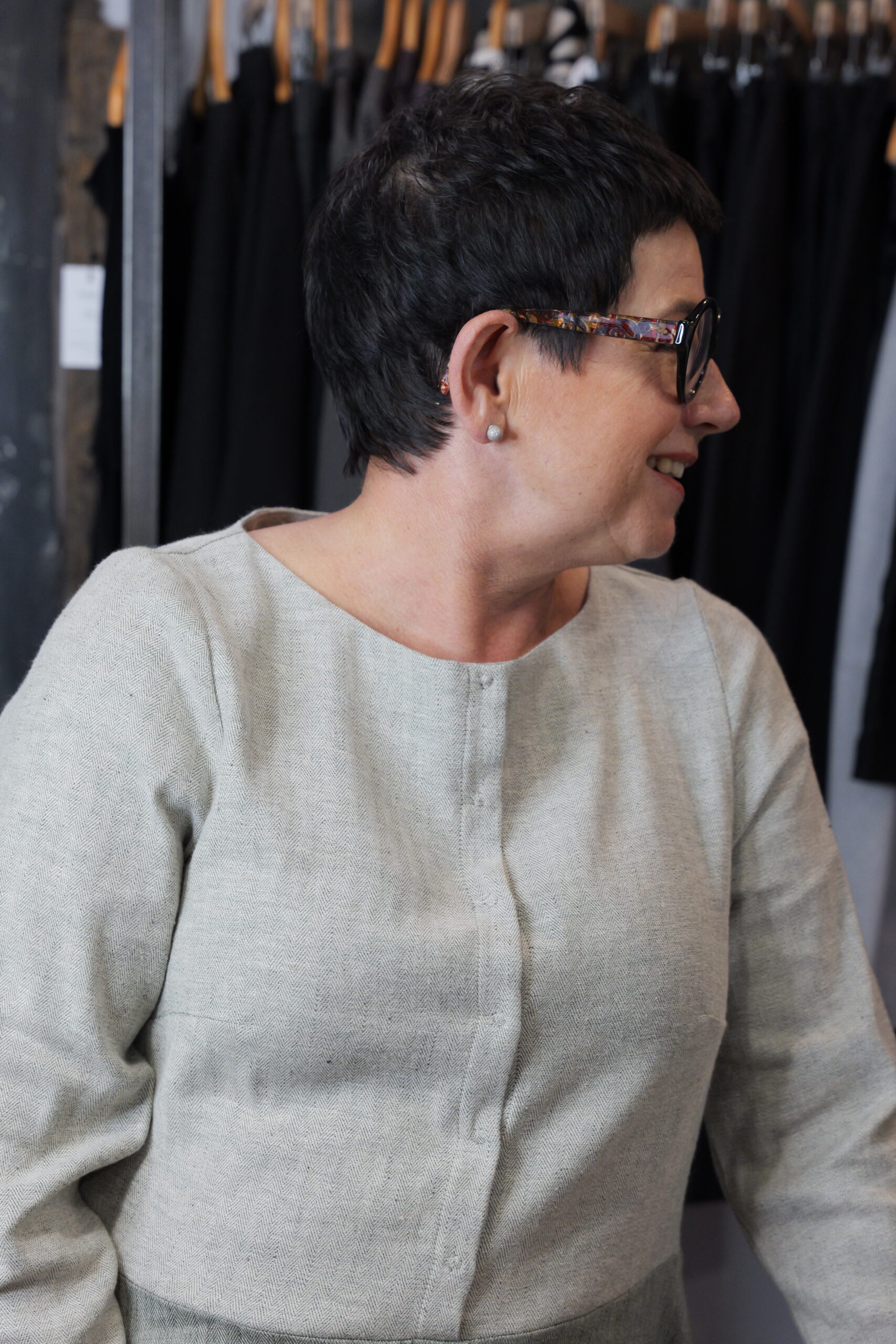 Młynarka – lniana sukienka jodełka na zatrzaski