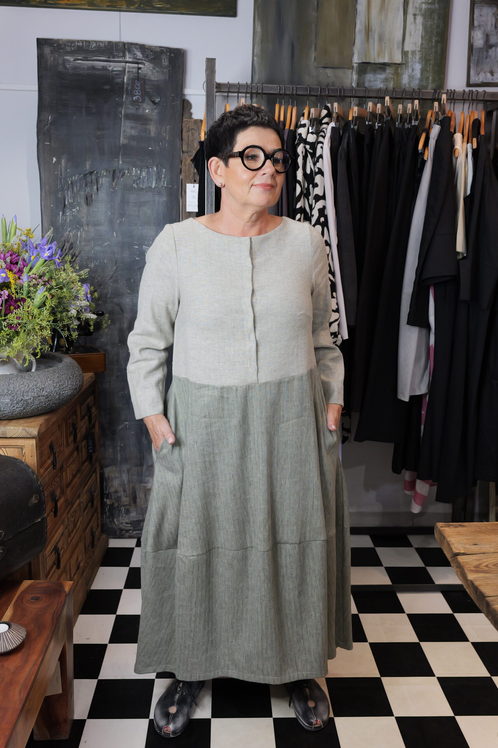 Młynarka – lniana sukienka jodełka na zatrzaski to flagowy model BezAle. Elegancka, lekka i wyjątkowa, w oryginalnym wzorze jodełki.