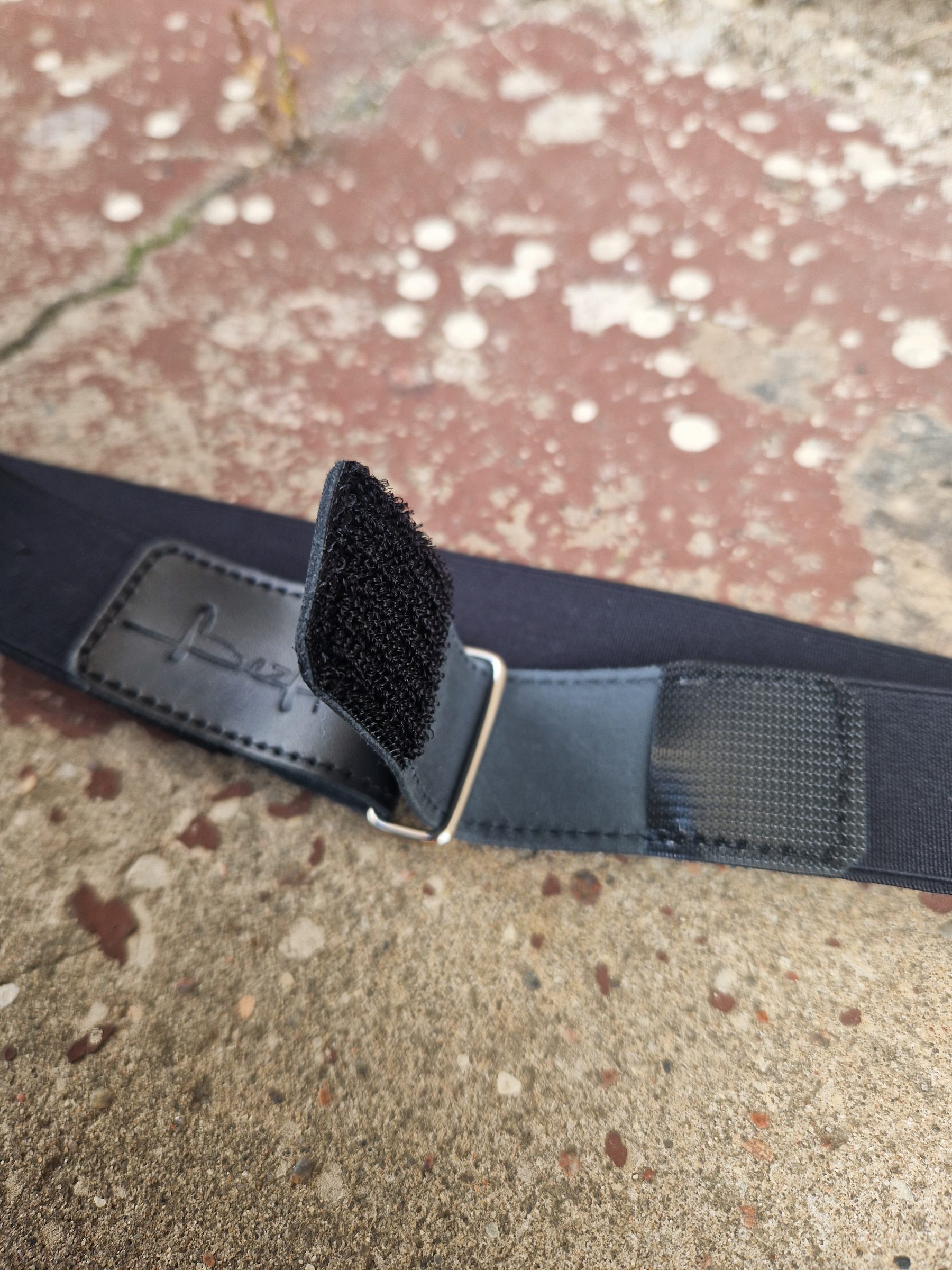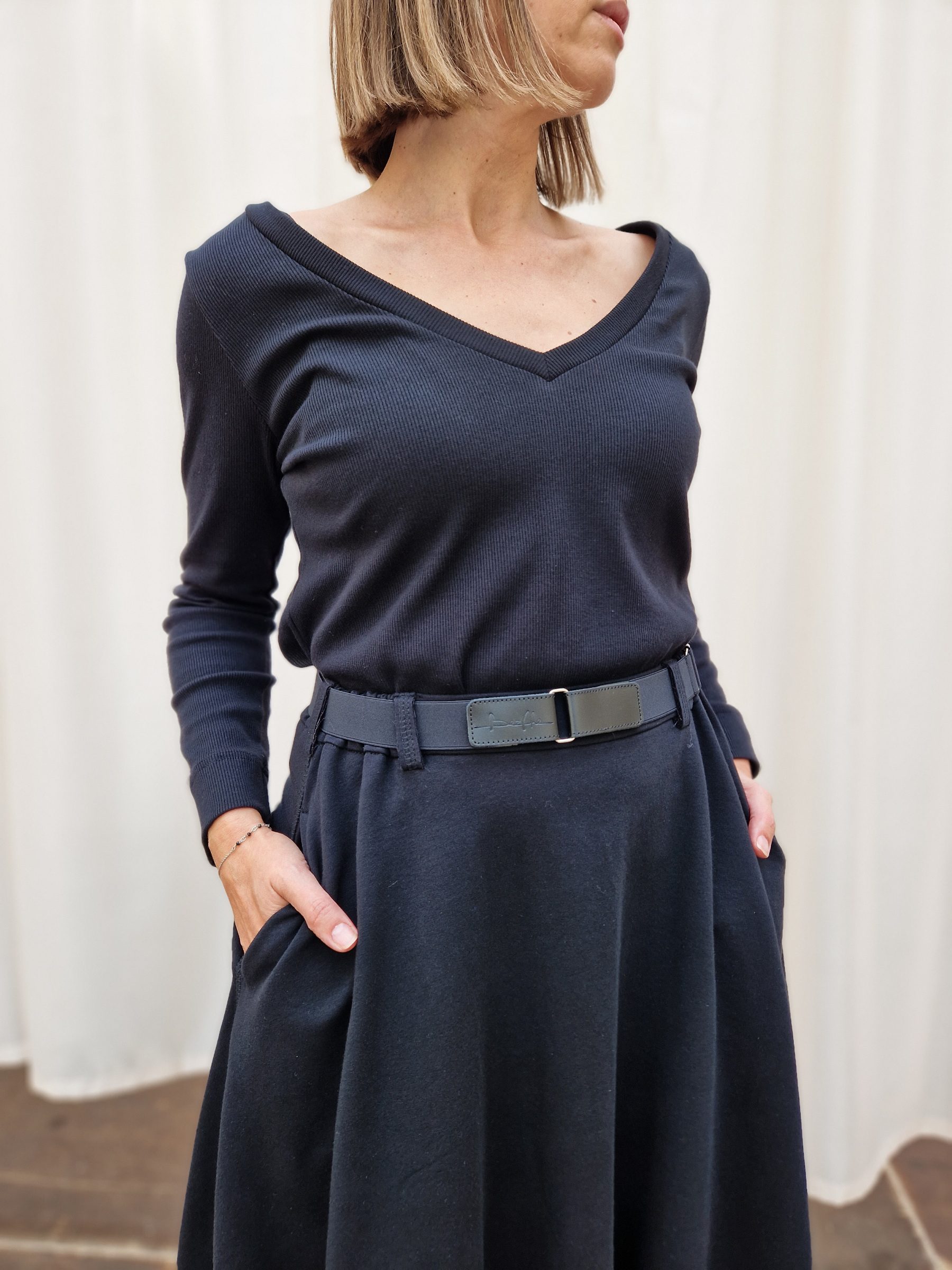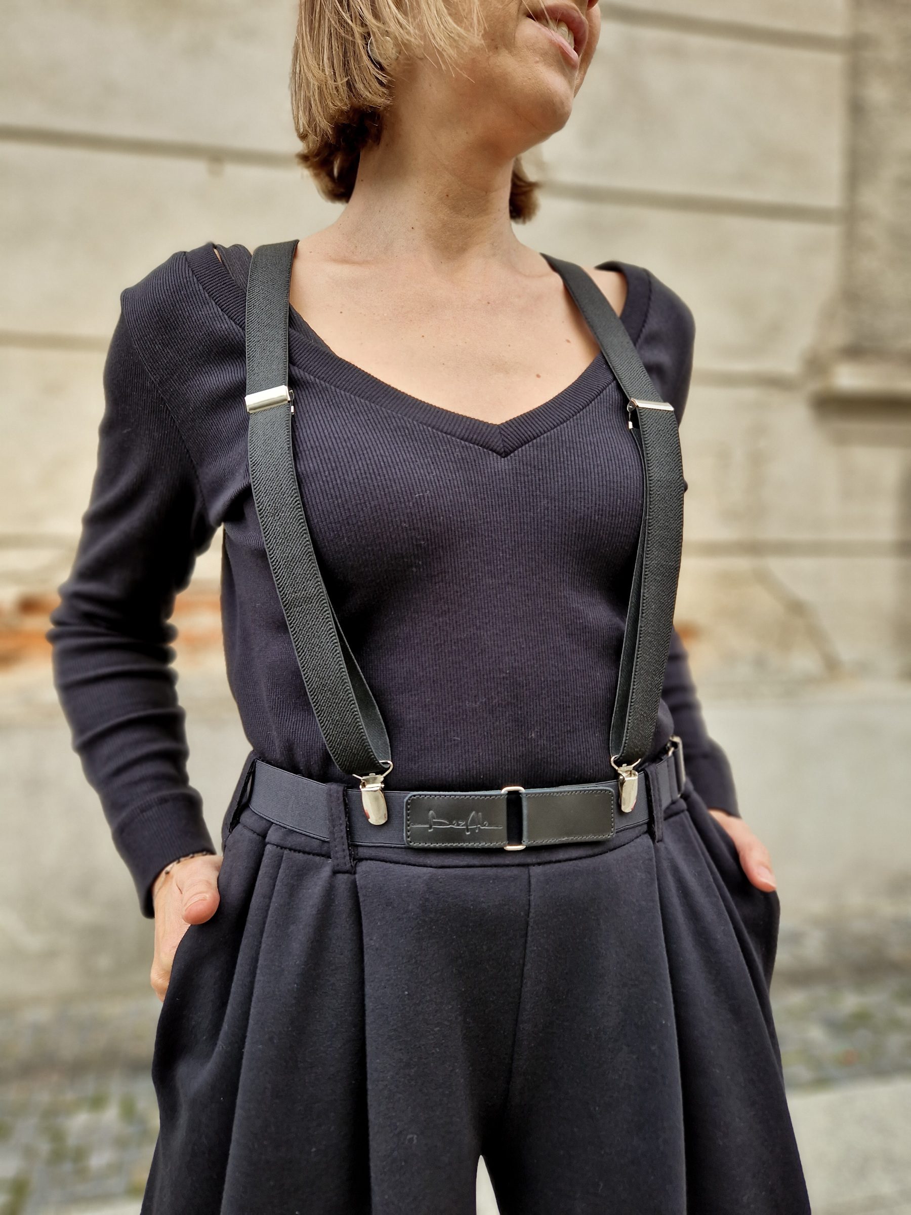 Pasek o szerokości 3 cm wykonany z gumy i skóry naturalnej, z regulacją i logo marki. Idealny do spodni, spódnic i sukienek.