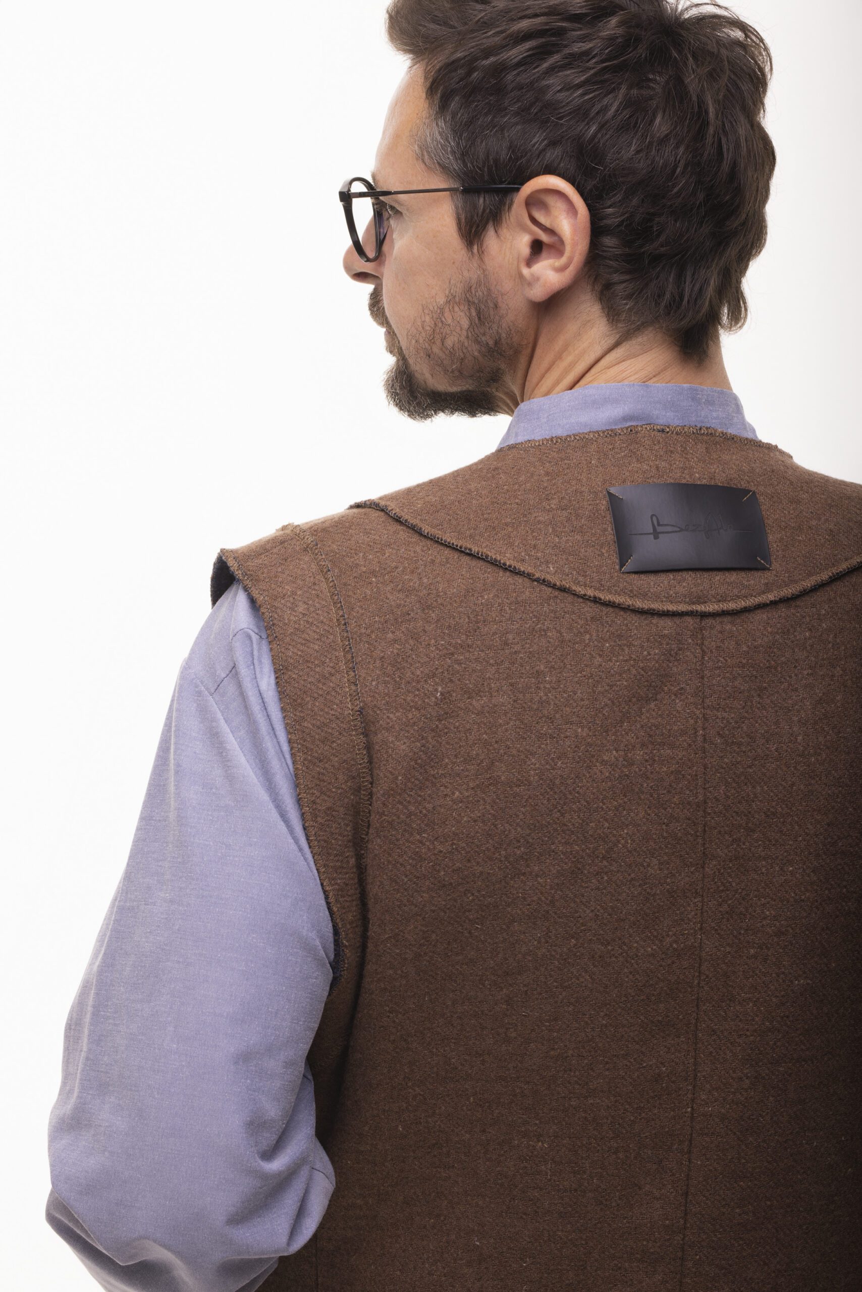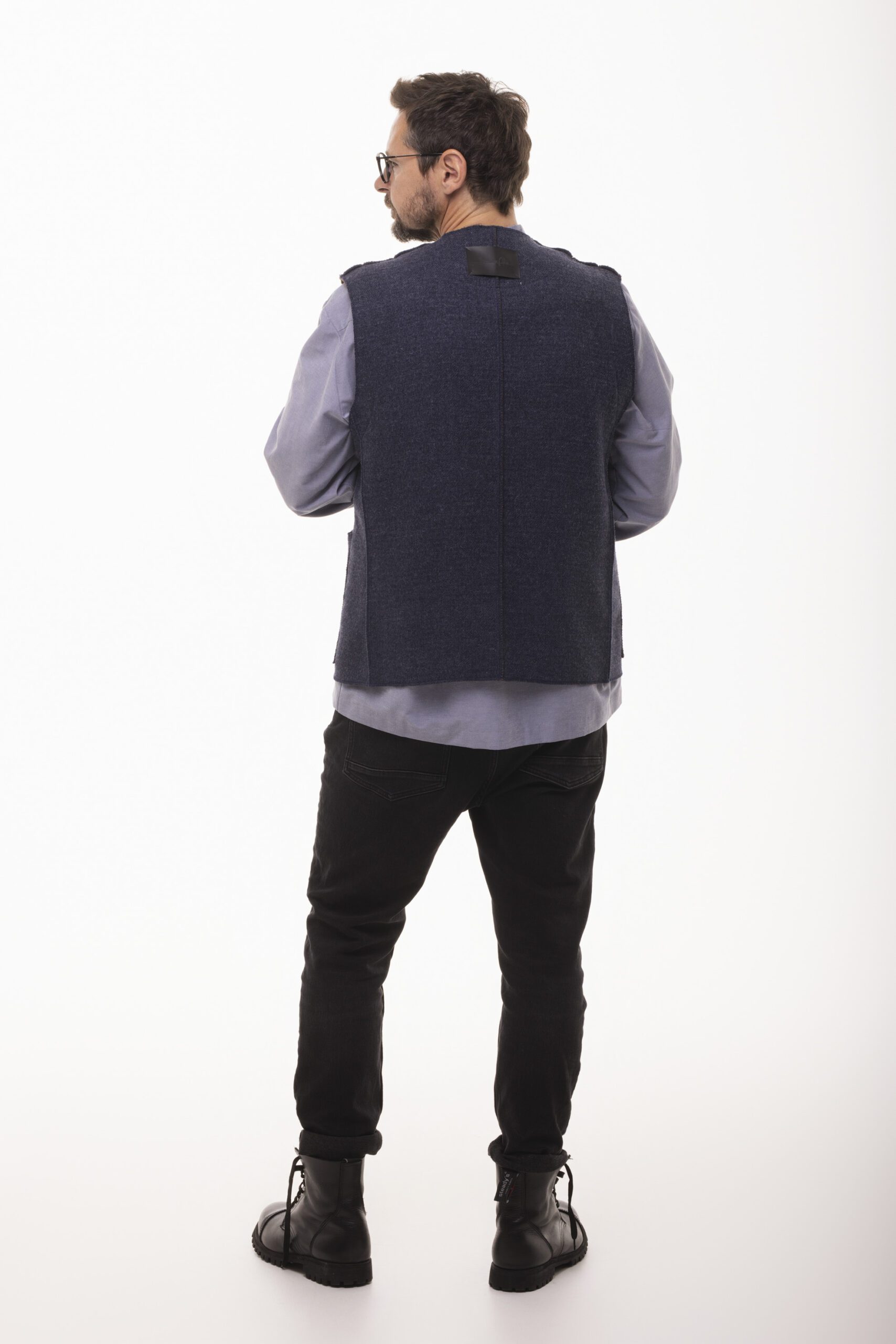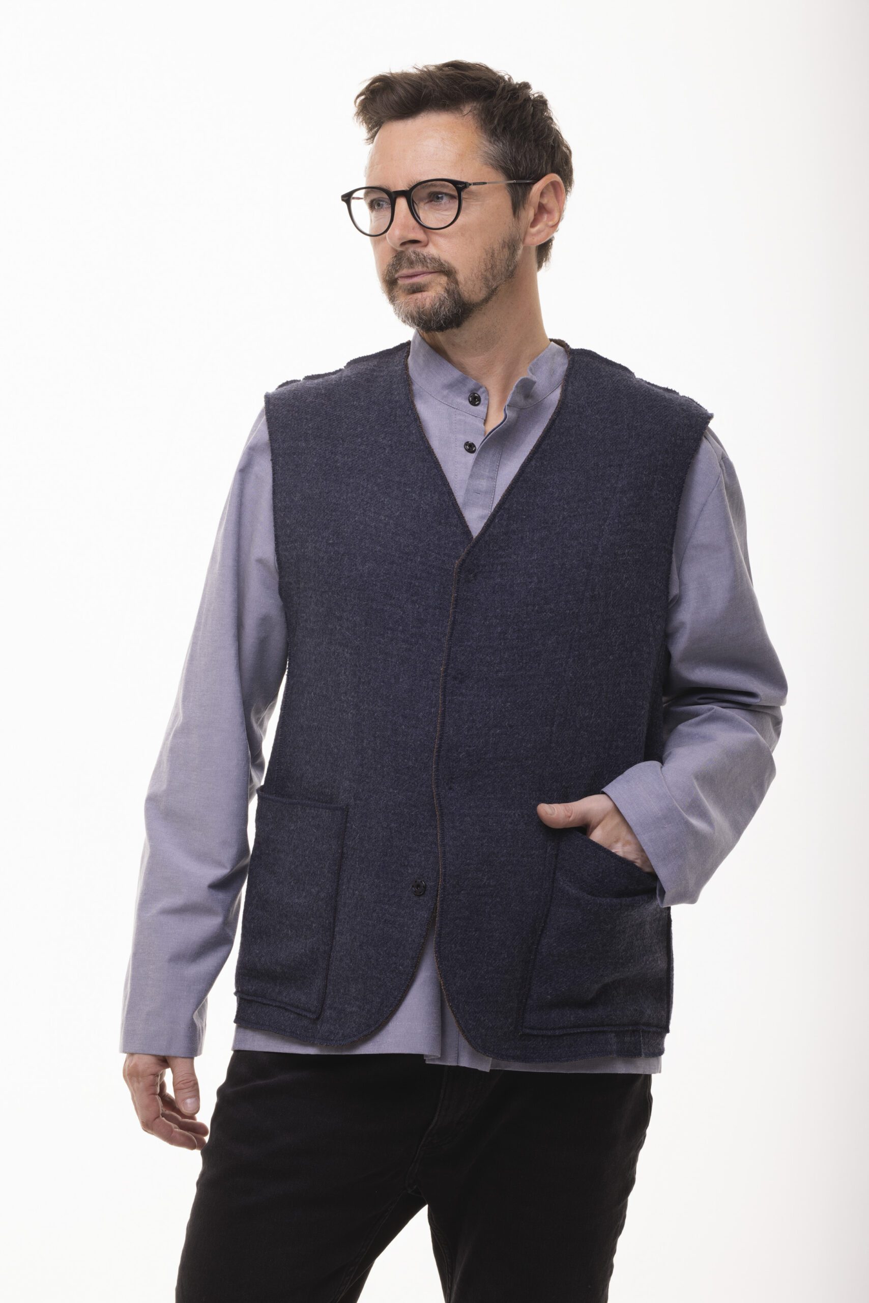 Kamizelka ma prosty krój z funkcjonalnymi kieszeniami, co nadaje jej ponadczasowego charakteru. Wykończenia z naturalnej wełny nadają jej szlachetności, a zatrzaski podkreślają jej uniwersalność. Jest ciepła a przy tym lekka, co sprawia, że świetnie sprawdzi się zarówno jako element casualowego, jak i bardziej eleganckiego stroju.