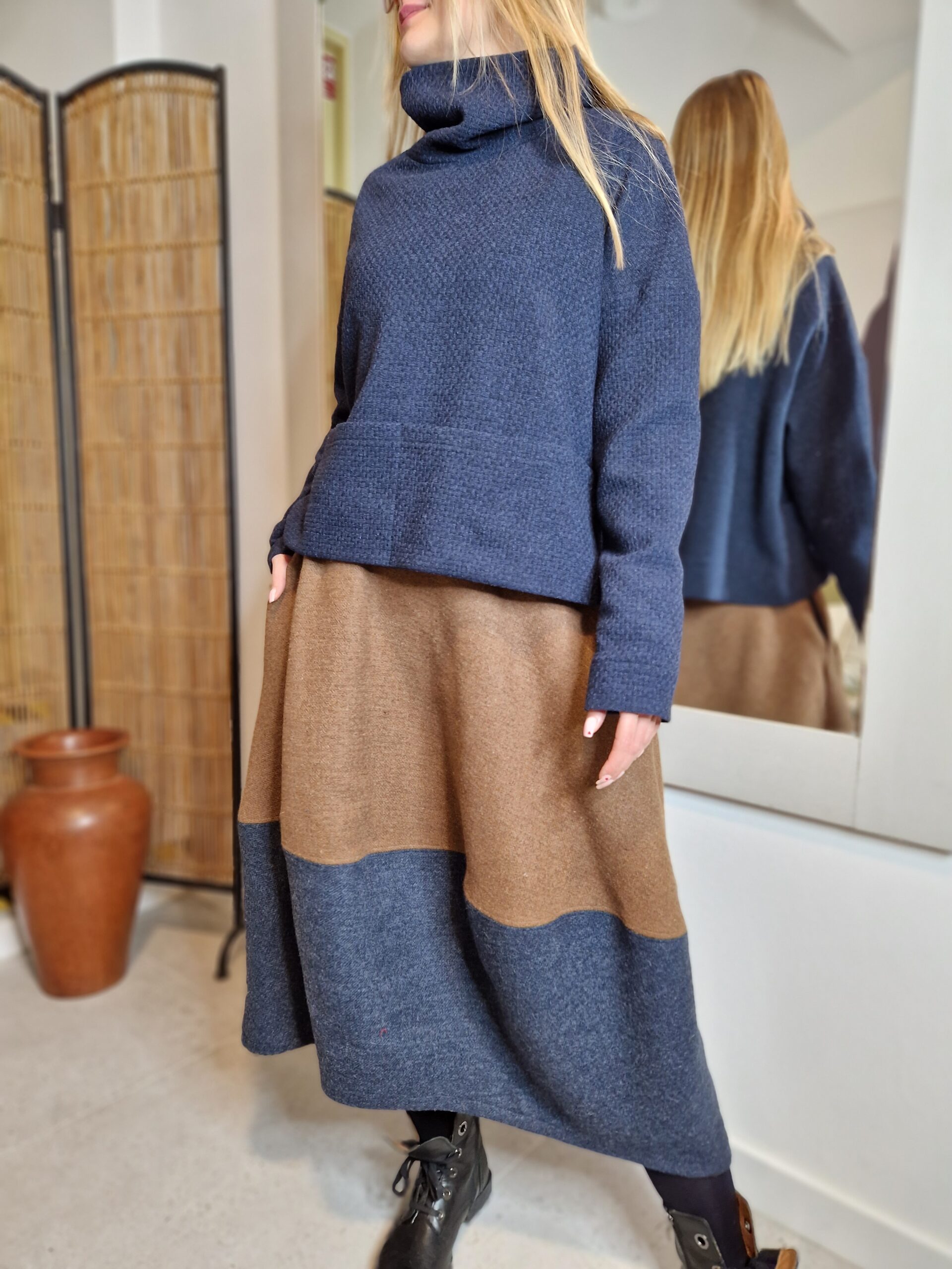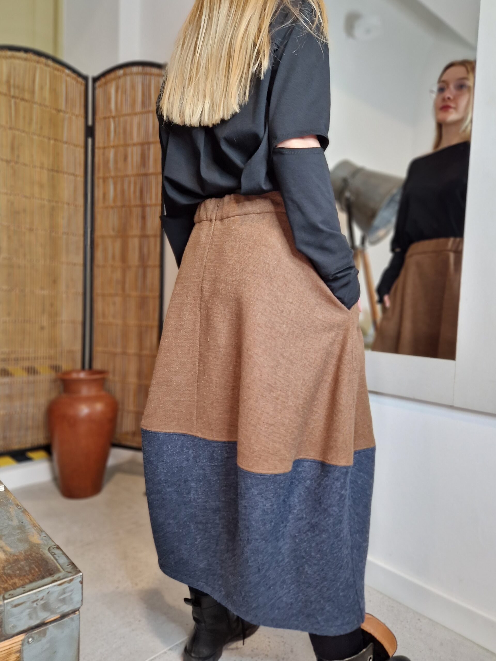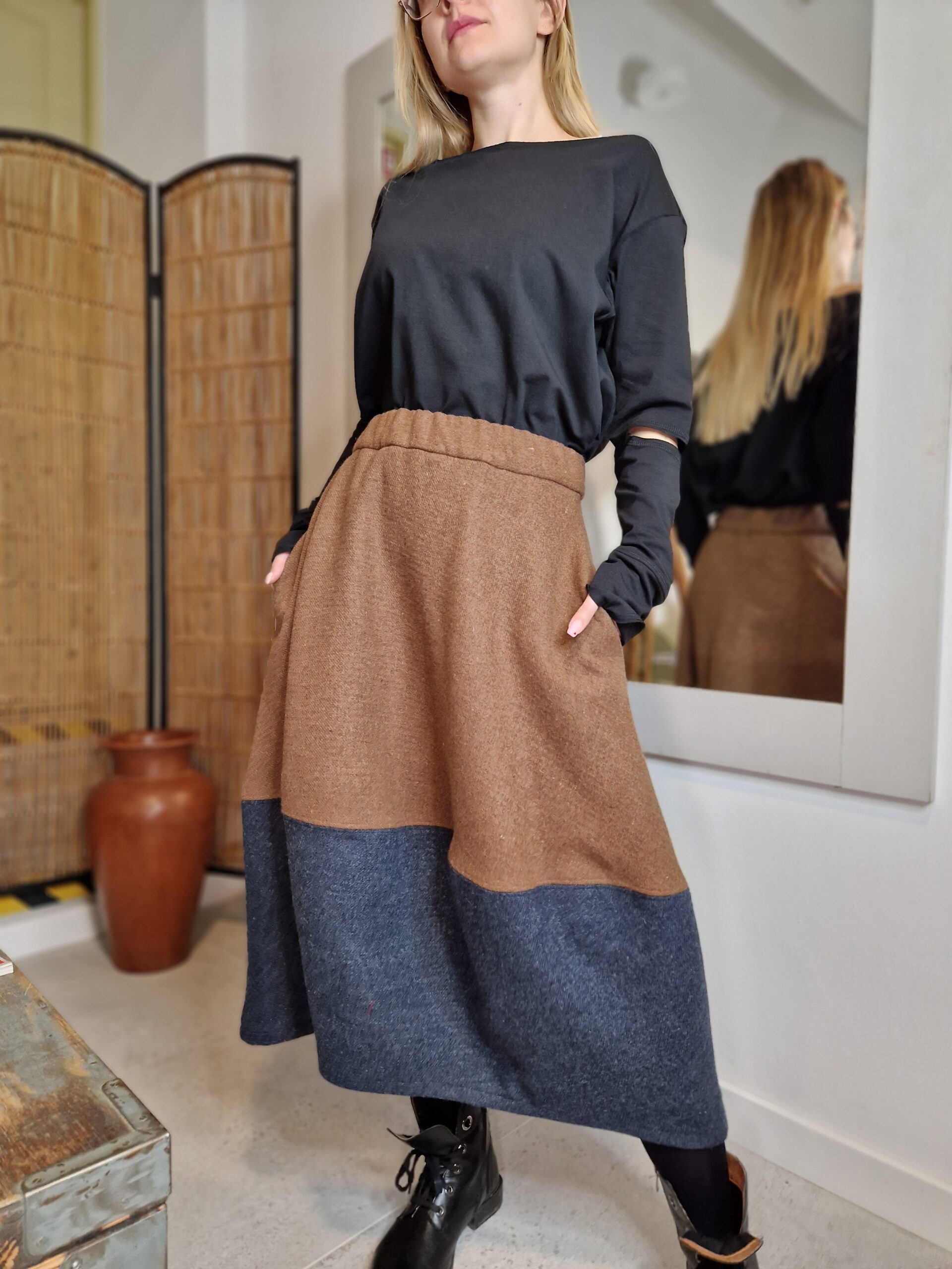 Spódnica BOMBOWA SZEFOWA PIASEK I MORZE wykonana z mięsistej wełny, dwukolorowa spódnica to prawdziwe połączenie elegancji i stylu. Górna część w odcieniu brązu harmonijnie przechodzi w głęboki granat, tworząc niepowtarzalny efekt przypominający piasek i morze nocą. Posiada kieszenie boczne i elastyczną gumkę w pasie, która zapewnia wygodę noszenia.