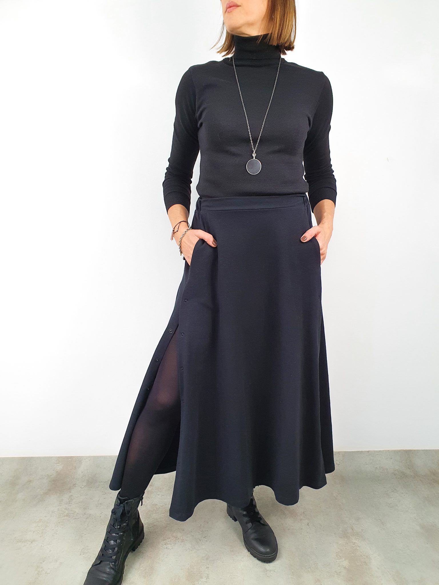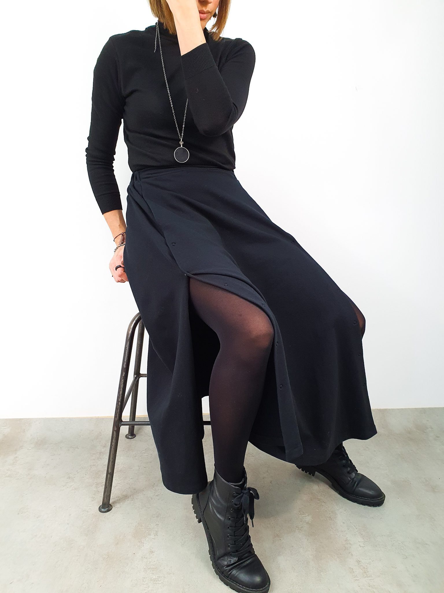 Rozkloszowana spódnica KOKIETKA z mięsistej bawełny z kokieteryjnymi bocznymi rozporkami zapinanymi na zatrzaski. Małe kieszonki z przodu, w pasie guma. Bardzo kobieca, a przy tym wygodna i komfortowa. Idealna jako baza do przeróżnych stylizacji, na każdą porę roku.
