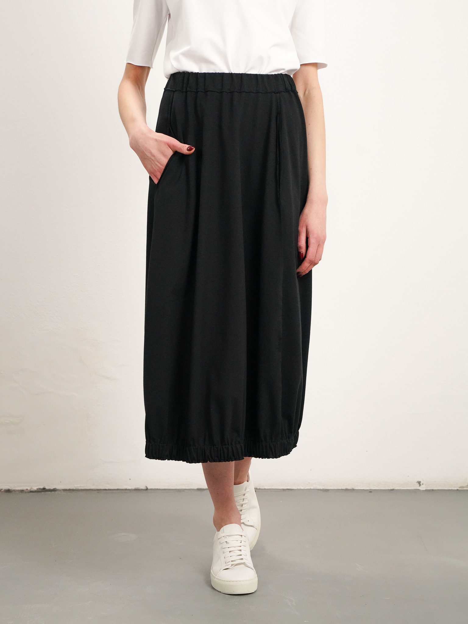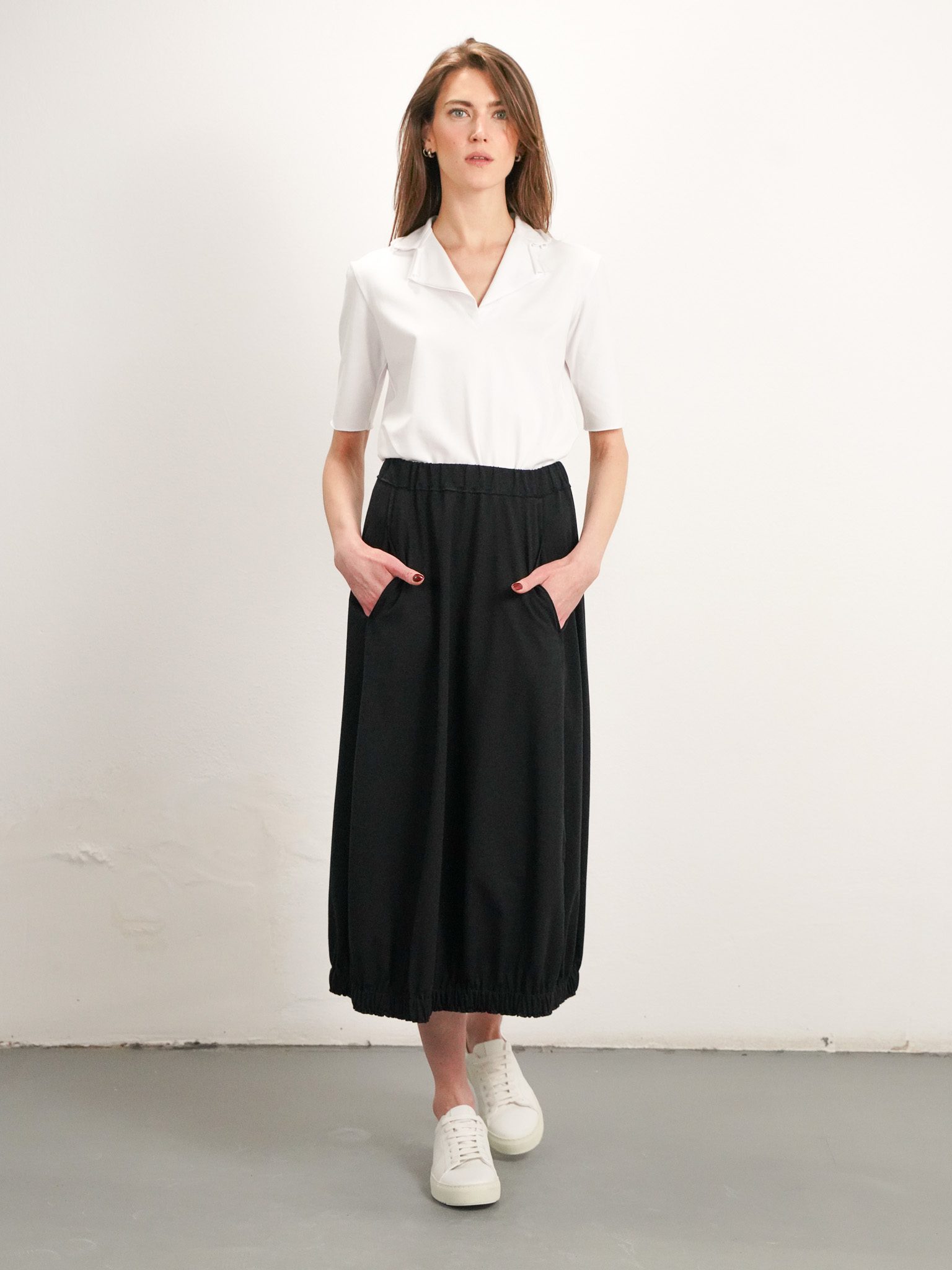 Wykonana z mięsistej bawełny, spódnica ta zapewnia nie tylko wyjątkową wygodę, ale także trwałość. Przeszycie i gumka w pasie i na dole dodają spódnicy subtelnego charakteru. Charakteryzuje się luźnym dołem, przypominającym kształt bombki. Jest lekko dopasowana w talii, a następnie poszerza się ku dołowi, tworząc efekt płynnego i kobiecego ruchu.
