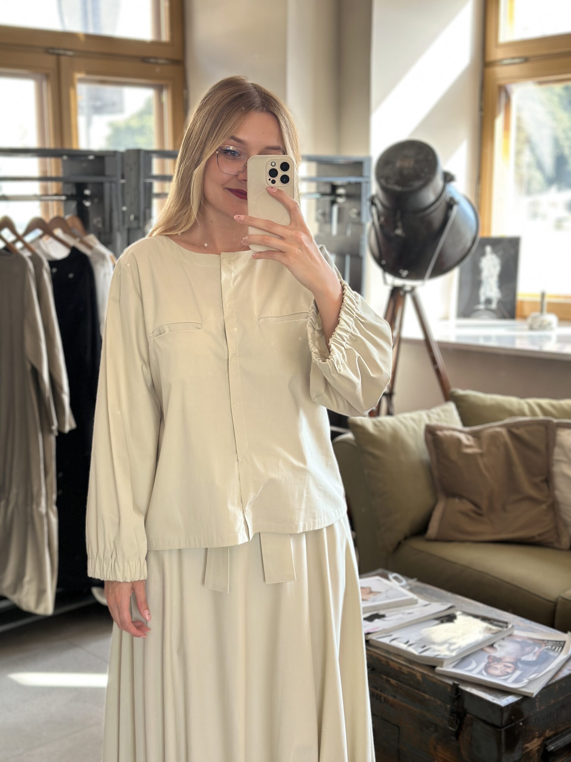 Subtelna – koszula bawełniana z marszczonymi mankietami to klasyka w minimalistycznym wydaniu. Luźny fason, zatrzaski zamiast guzików i kieszenie sprawiają, że jest uniwersalną bazą stylizacji.
