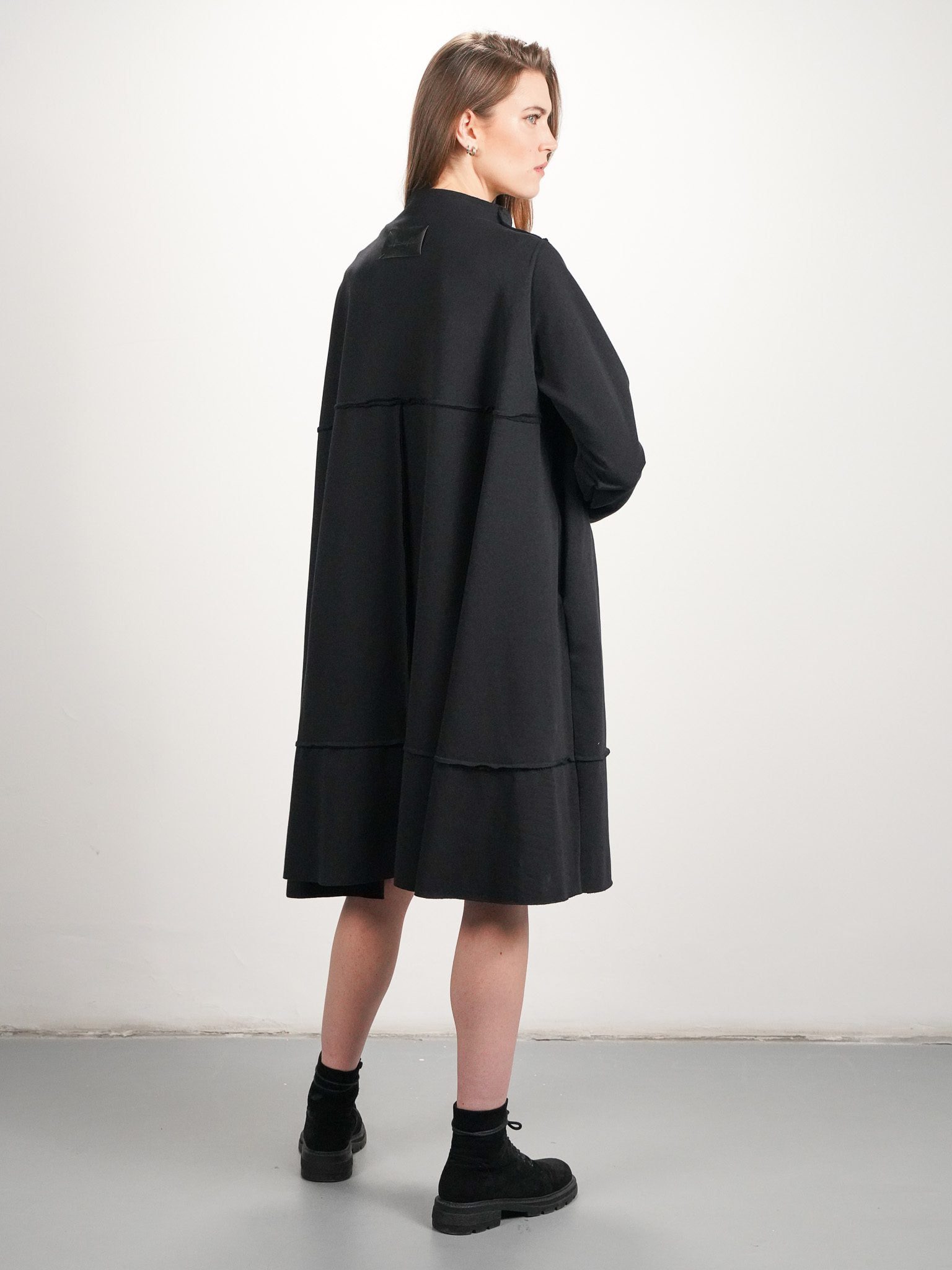 Jej fason w formie trapezu zapewnia swobodę ruchów i komfort noszenia, podkreślając jednocześnie kobiecą sylwetkę. Efektowne surowe szwy na wierzchu dodają charakteru i oryginalności całej stylizacji. Delikatna stójka nadaje jej elegancji i wyrafinowania, podczas gdy kieszenie w szwach są praktycznym dodatkiem, umożliwiającym przechowywanie najpotrzebniejszych drobiazgów.