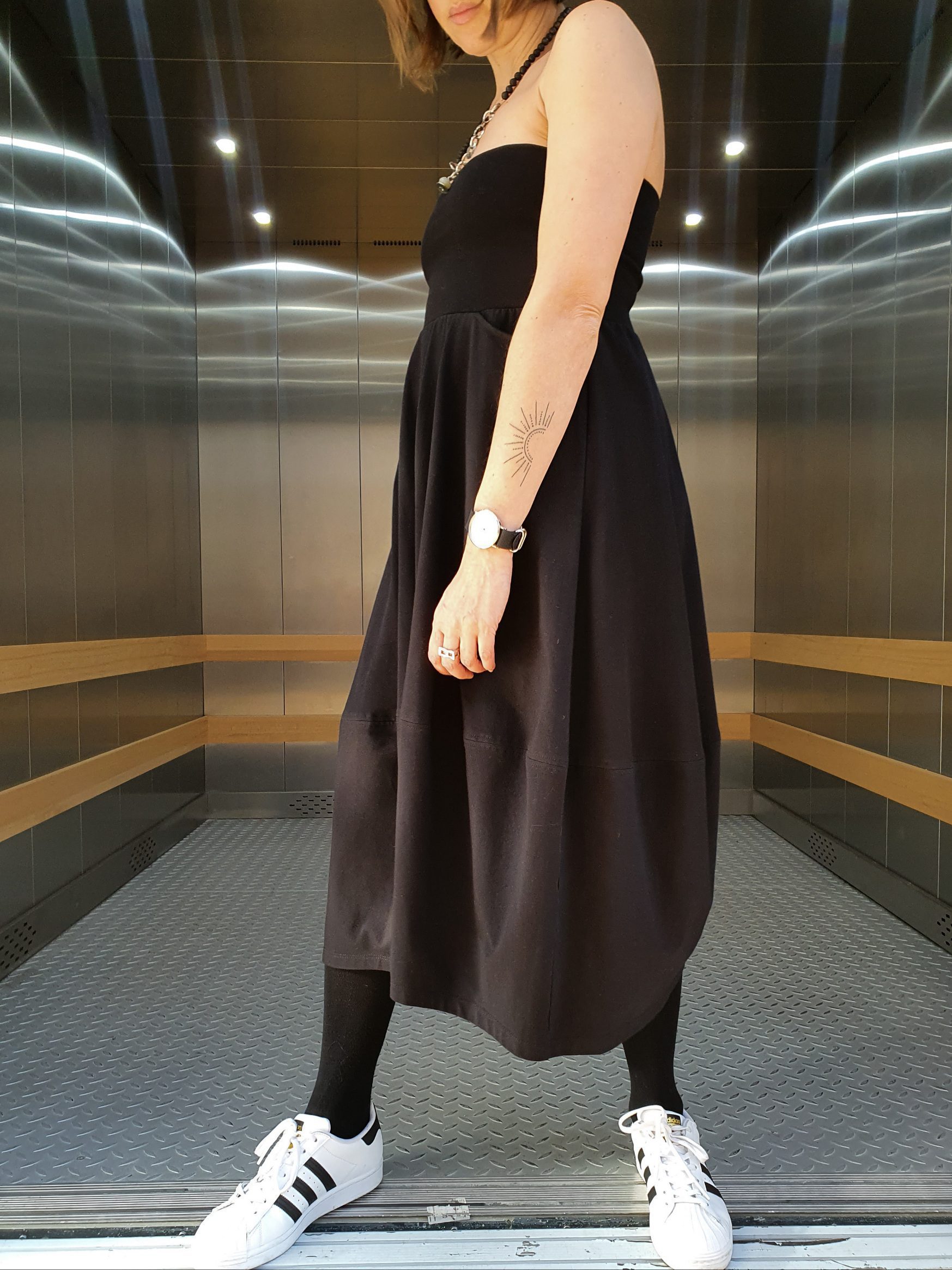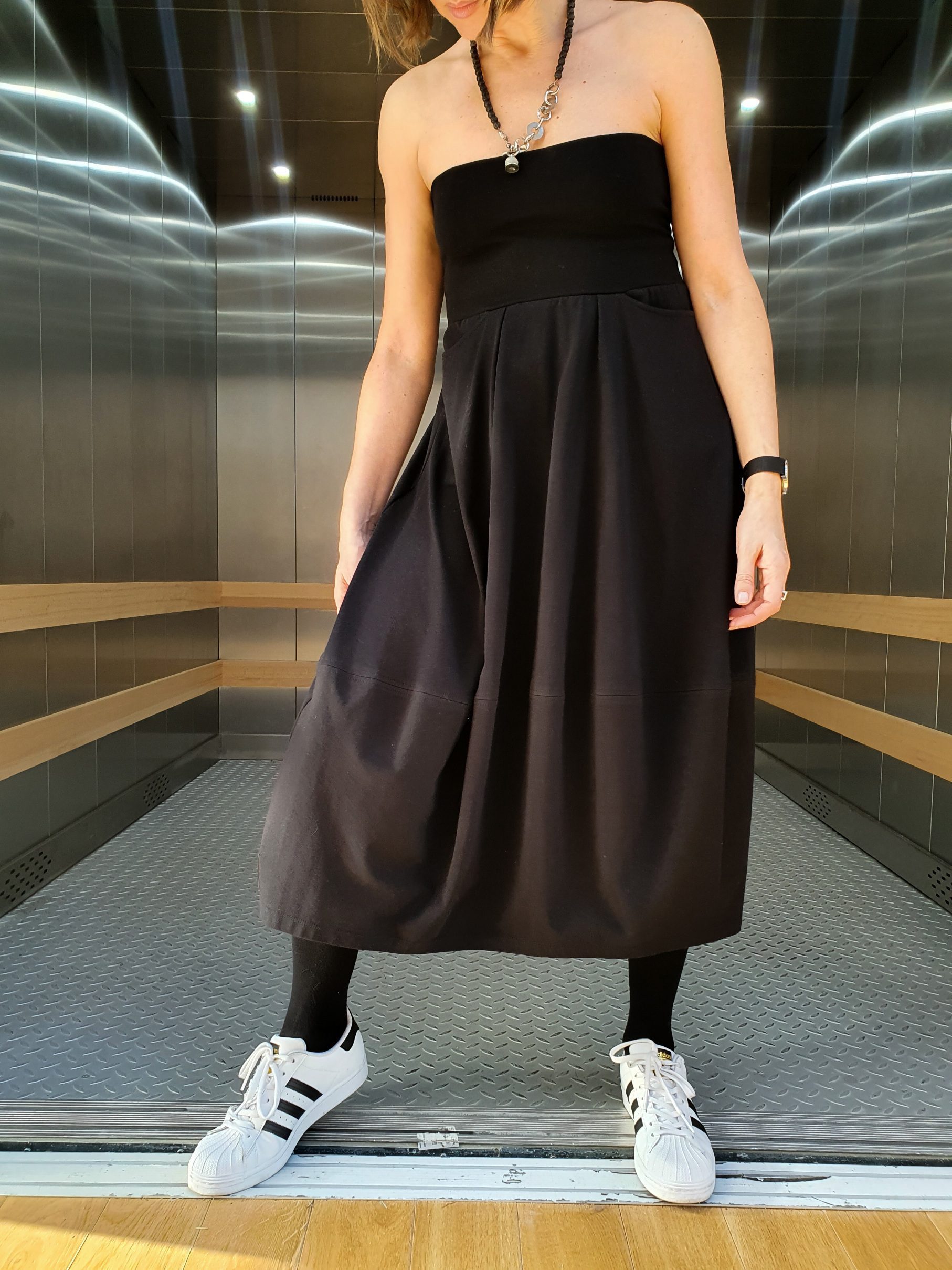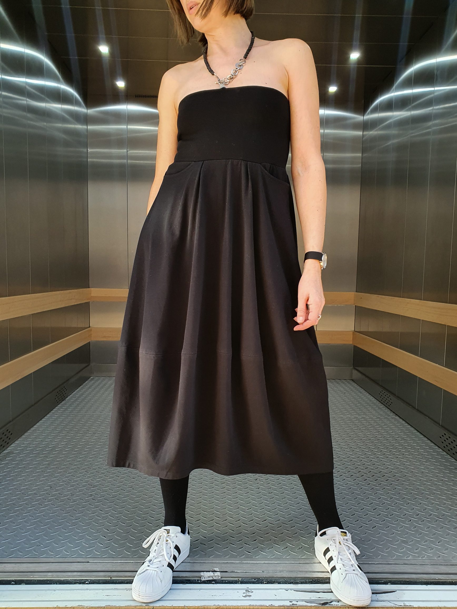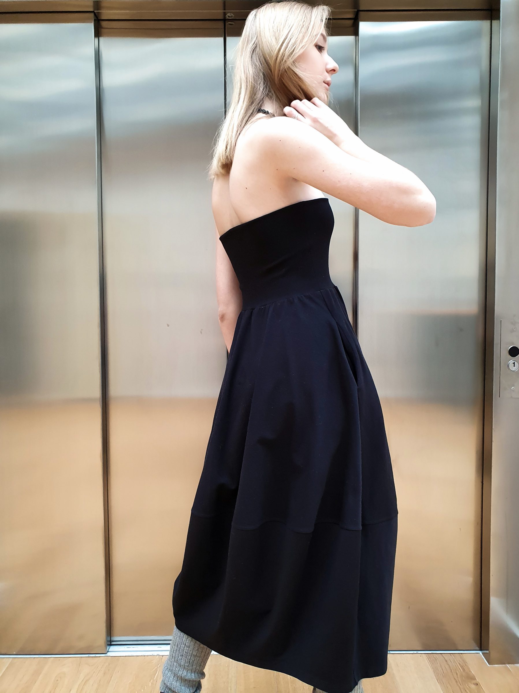 Bawełniana sukienka KOKIETERKA, która w sprytny sposób przeradza się w spódnicę 🙂 To propozycja idealna na każdą okazję i różne pory roku. Założona na gołe ciało to idealna opcja na wszelakie imprezy, z golfem czy t-shirtem do noszenia na co dzień. Polecamy też z szelkami! Góra uszyta z elastycznego ściągacza, dół z miękkiej bawełny w kształcie bombki, z małymi kieszonkami.  Po zwinięciu ściągacza, łatwo staje się świetną spódnicą.