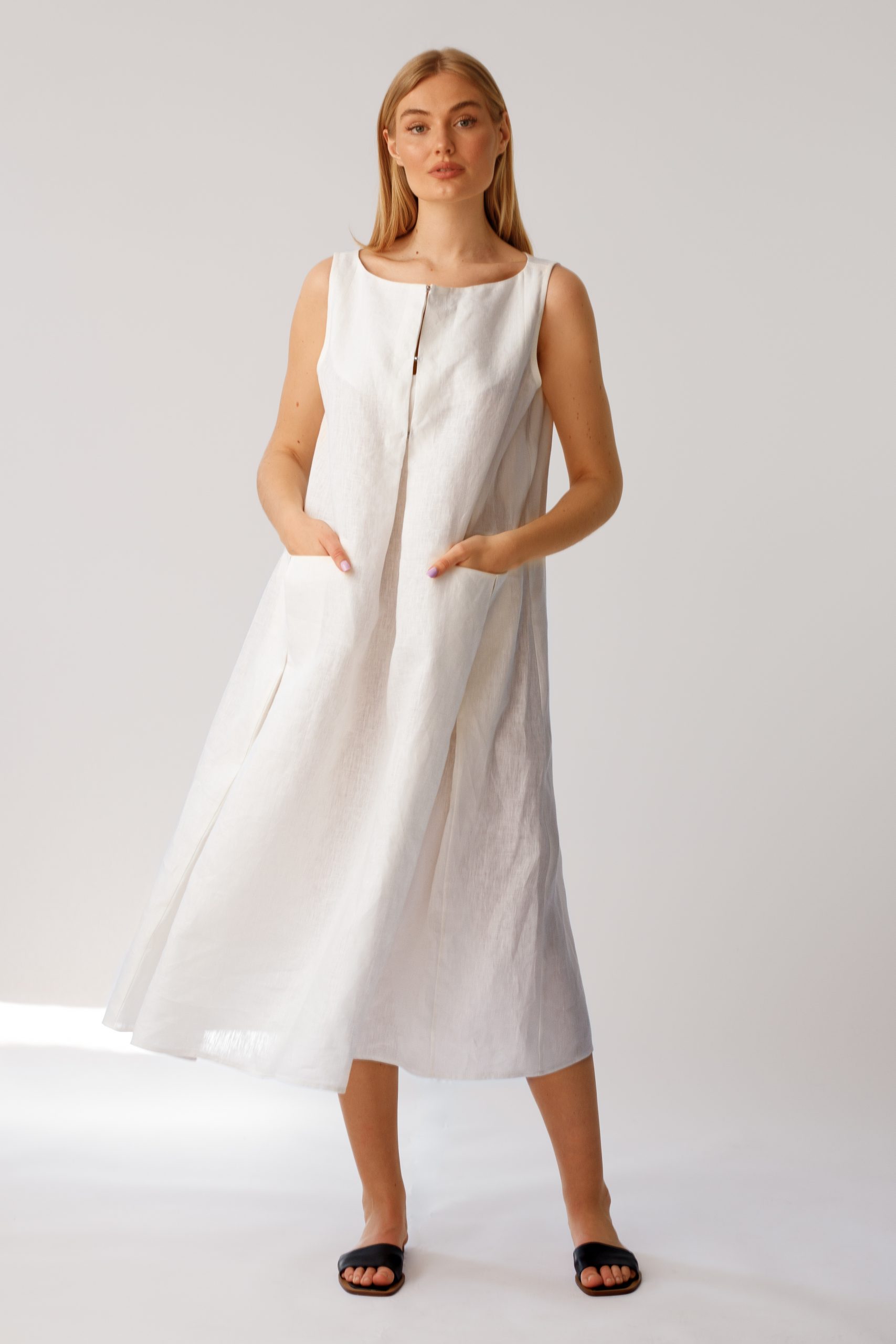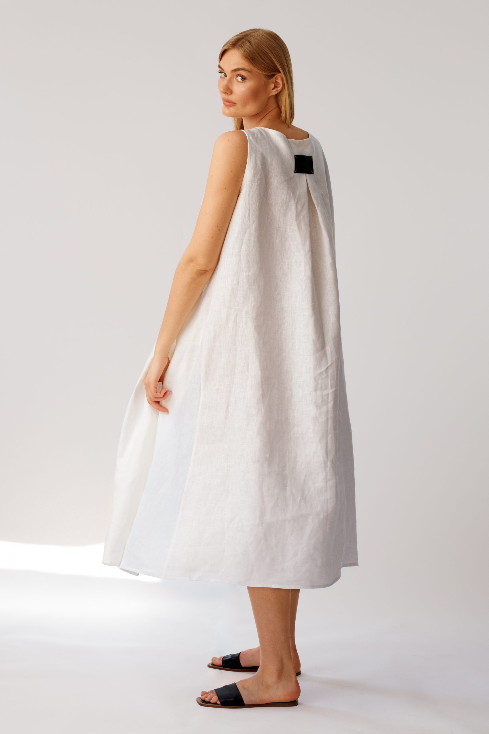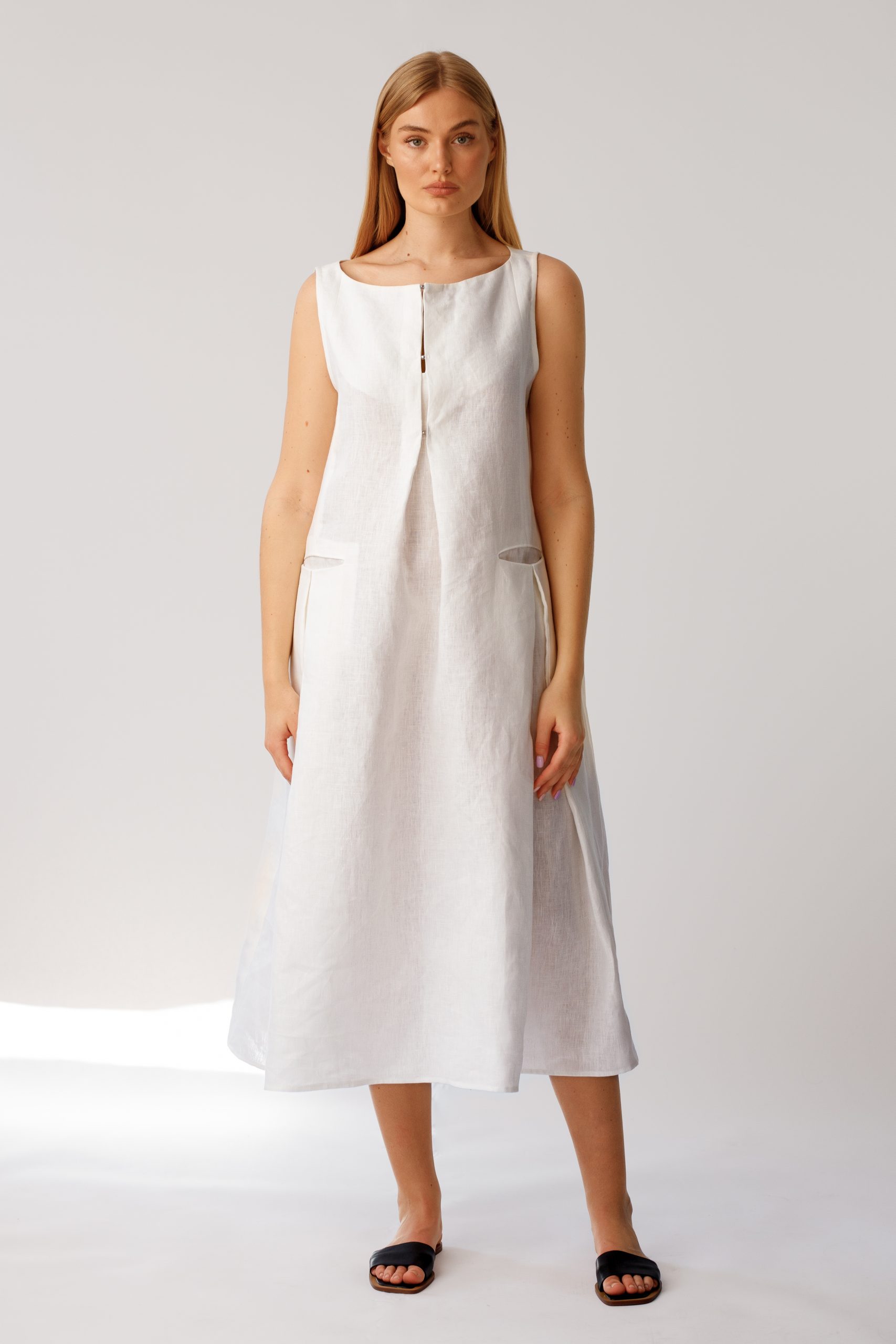 Sukienka LEKKA MNISZKA to nasz flagowy model, więc nie mogło jej zabraknąć! To kwintesencja elegancji i kobiecości, która podkreśli Twoją wyjątkową osobowość. Piękna, świeża, rozświetlająca! Oryginalny, luźny fason (tutaj wersja bez rękawów) świetnie prezentuje się na każdego typu sylwetce. Sukienka ma 3 haftki, których rozpięcie pozwala na lekkie odsłonięcie dekoltu, a na plecach i przy kieszeniach kontrafałdy, które dodają jej wyjątkowego i designerskiego charakteru.