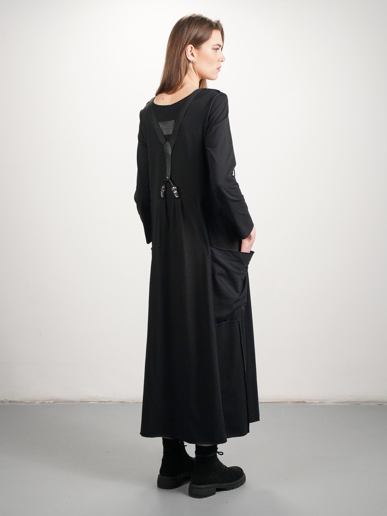 Długa sukienka z szelkami i efektownymi, naszytymi kieszeniami – w większej z nich, jest mniejsza – to prawdziwa perła w świecie mody designerskiej.