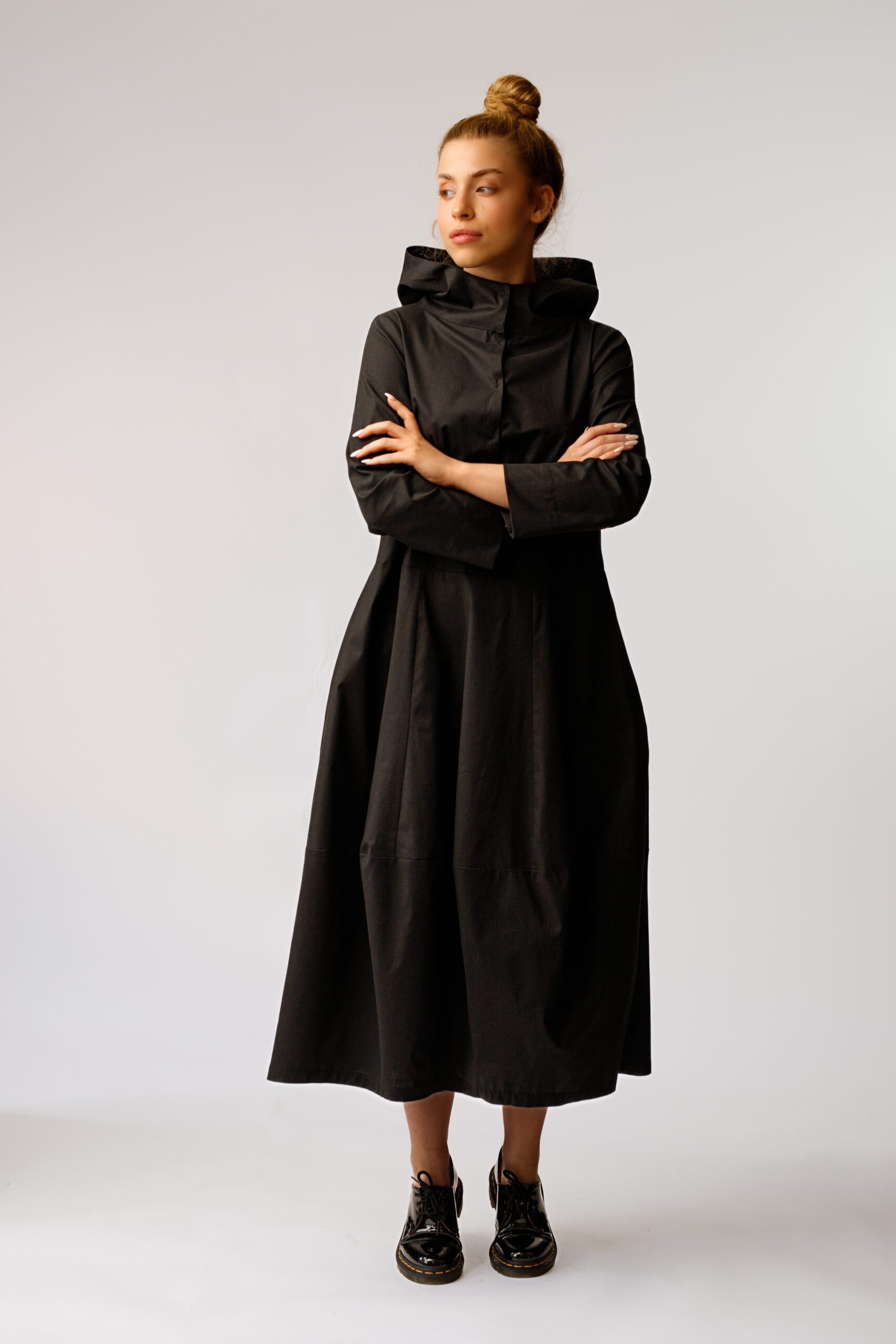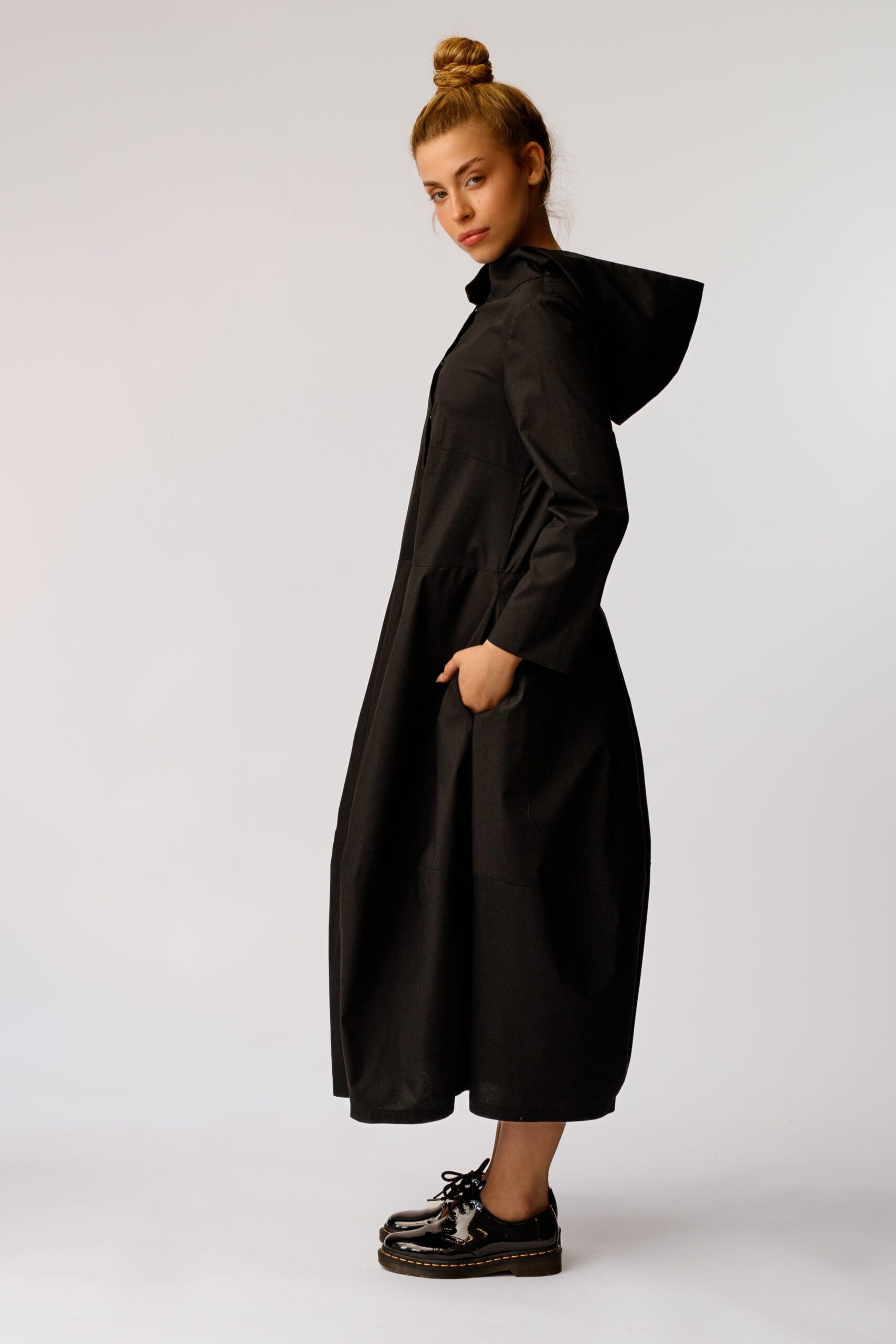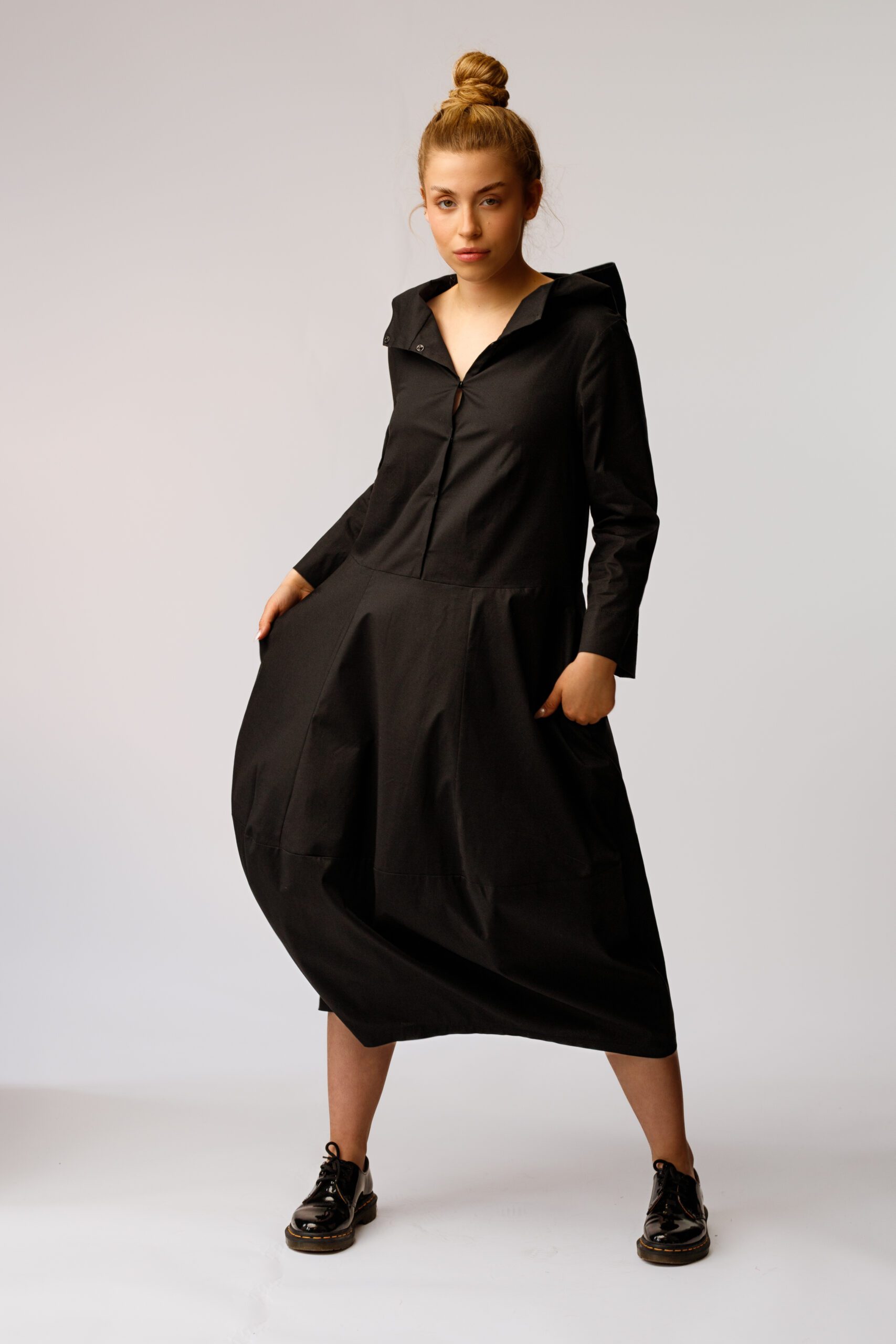 Sukienka MŁYNARKA BLACK uszyta jest z miękkiej, lejącej bawełny. Góra zapinana na małe zatrzaski, wykończona dużym kapturem. Dół sukienki w kształcie bombki, boczne kieszonki. Idealna na wiosnę i lato, pięknie się układa!