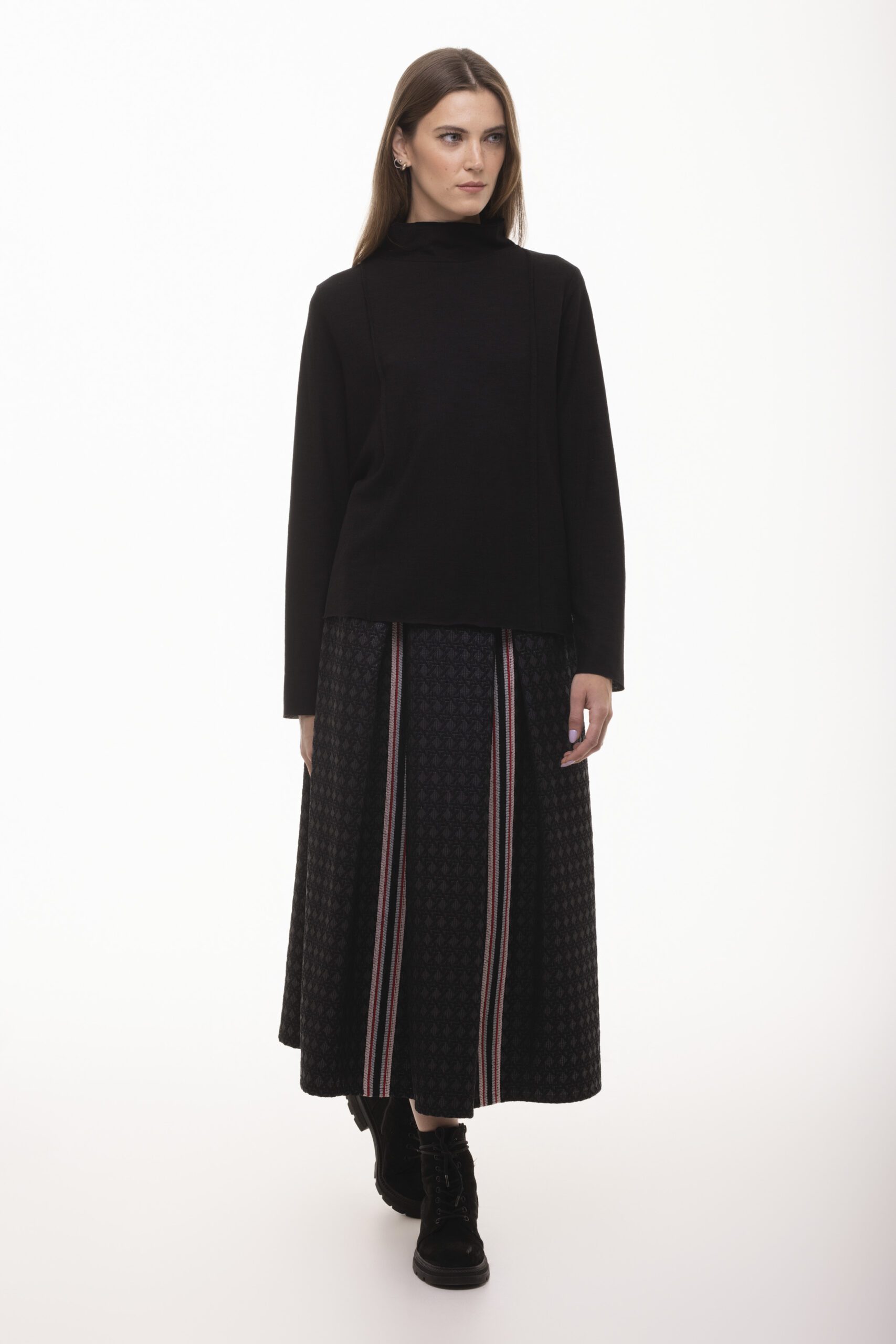 Spódnica Tajemnica to stylowa propozycja, która doskonale uzupełnia płaszcz z tej samej serii, tworząc spójną, sportowo-elegancką stylizację. Wykonana z tkaniny żakardowej o geometrycznym wzorze w odcieniach czerni z kontrastującymi, pionowymi lampasami w kolorach różu, czerwieni i bieli, spódnica emanuje wyjątkowym stylem, który przyciąga uwagę i nadaje całości wyrazistości.