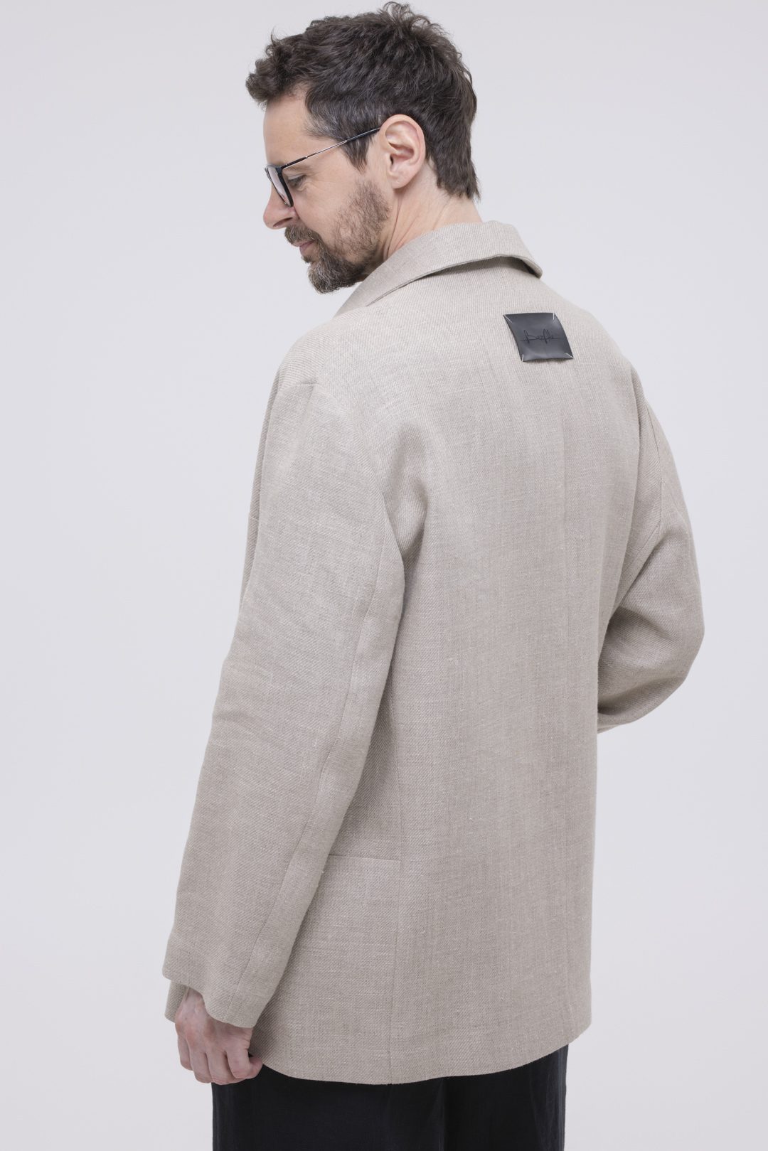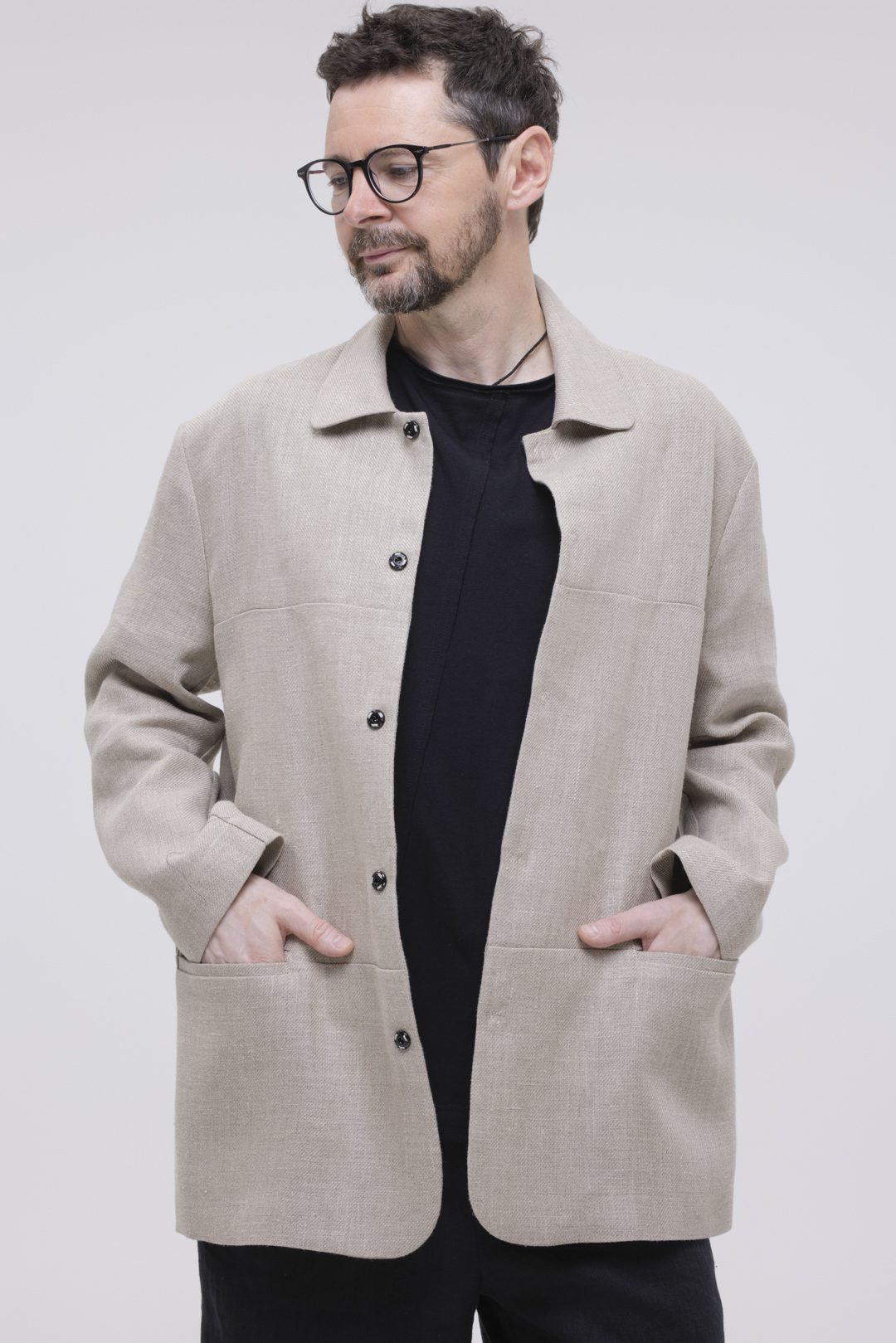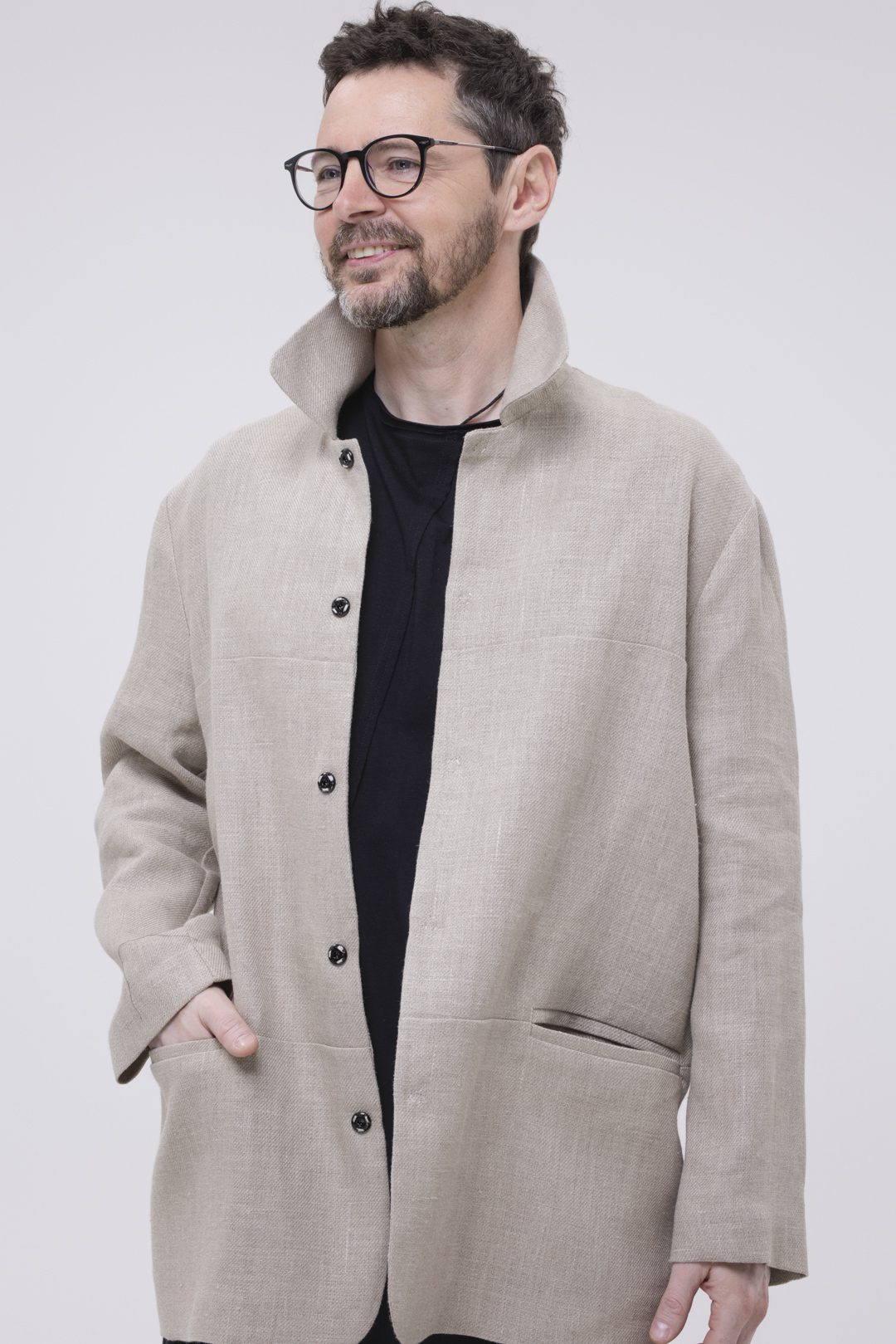 Lekka kurtka TŁO, uszyta z 100% lnu w ciepłym, piaskowym odcieniu. Zaprojektowana na sezon wiosenno-letni – oddychająca, wygodna, bez zbędnych elementów. Zapięcie na zatrzaski i dwie kieszenie nadają jej prostą funkcję i charakter. Klasyczny kołnierz i czysta linia sprawiają, że dobrze wygląda zarówno z t-shirtem, jak i koszulą.