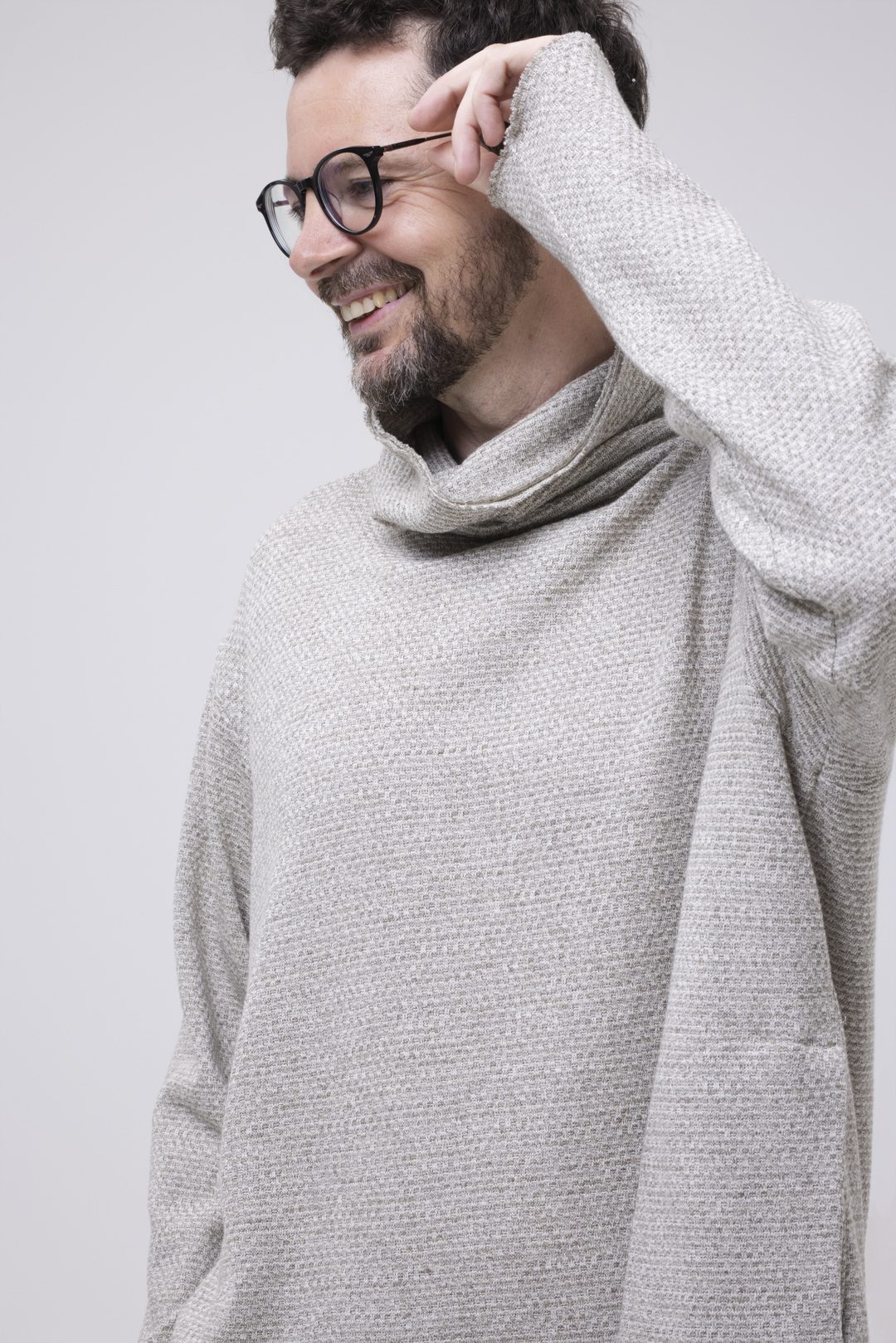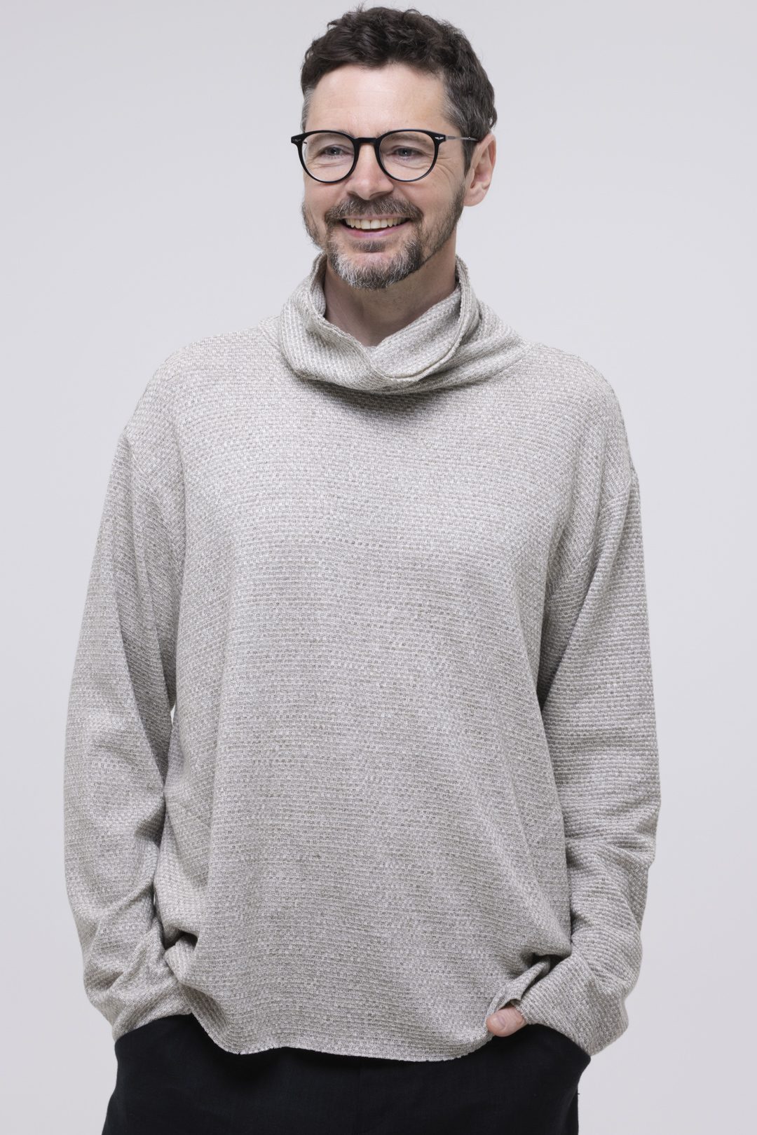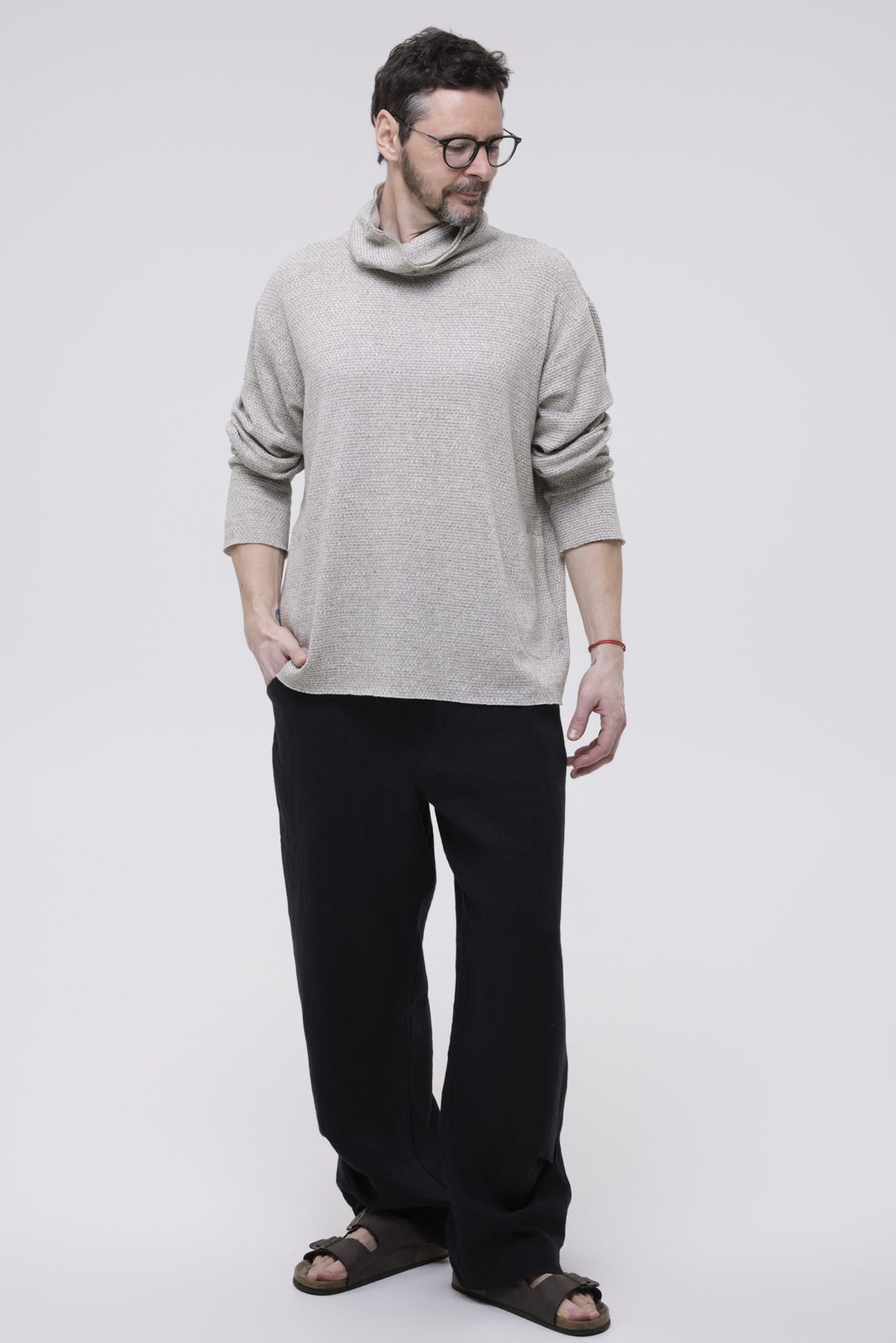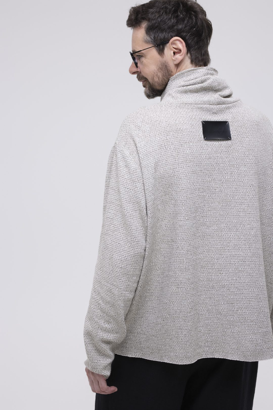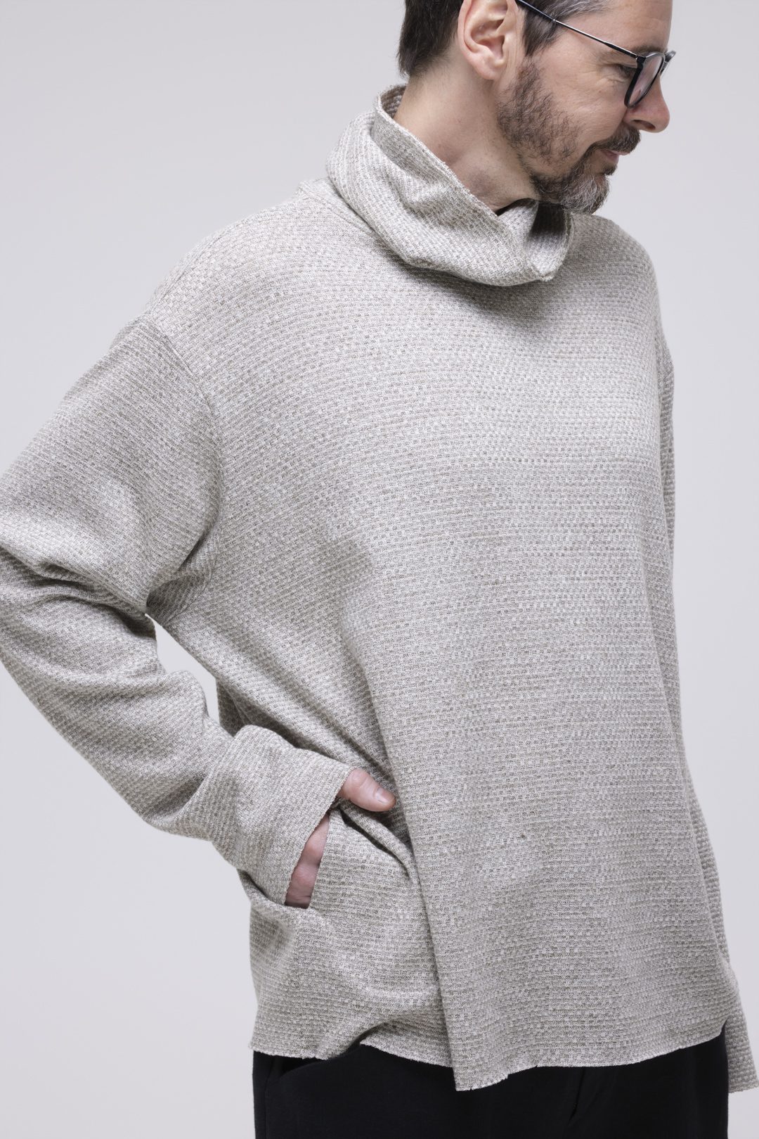 Lekki golf męski uszyty z dzianiny o wyraźnej strukturze. Luźny krój zapewnia swobodę, a miękki, swobodnie układający się kołnierz dodaje komfortu i lekkości.