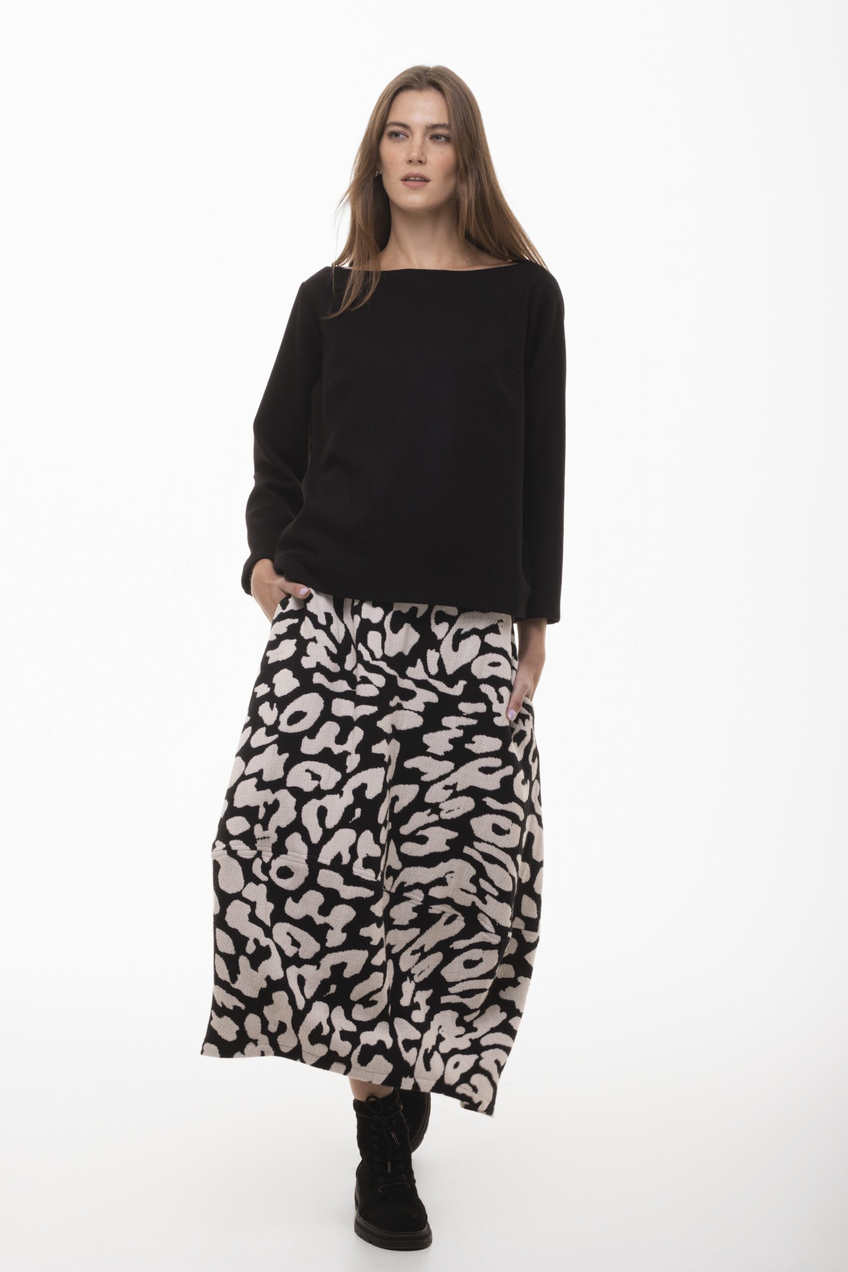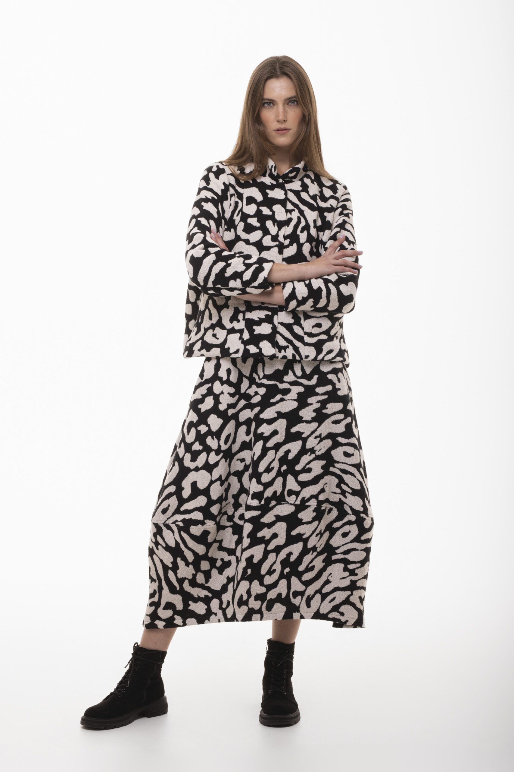 Spódnica Więź to nasz bestsellerowy model Bombowej Szefowej. Tym razem to wyrazisty element garderoby, który łączy komfort z oryginalnym wzorem. Wykonana z naturalnej, przyjemnej w dotyku bawełny, spódnica zapewnia wygodę noszenia, a jej bombkowy fason daje swobodę ruchu, idealną na co dzień. Wyrazisty wzór w kontrastujących barwach czerni i bieli przypomina abstrakcyjne motywy inspirowane naturą, wprowadzając do stylizacji energię i dynamikę.