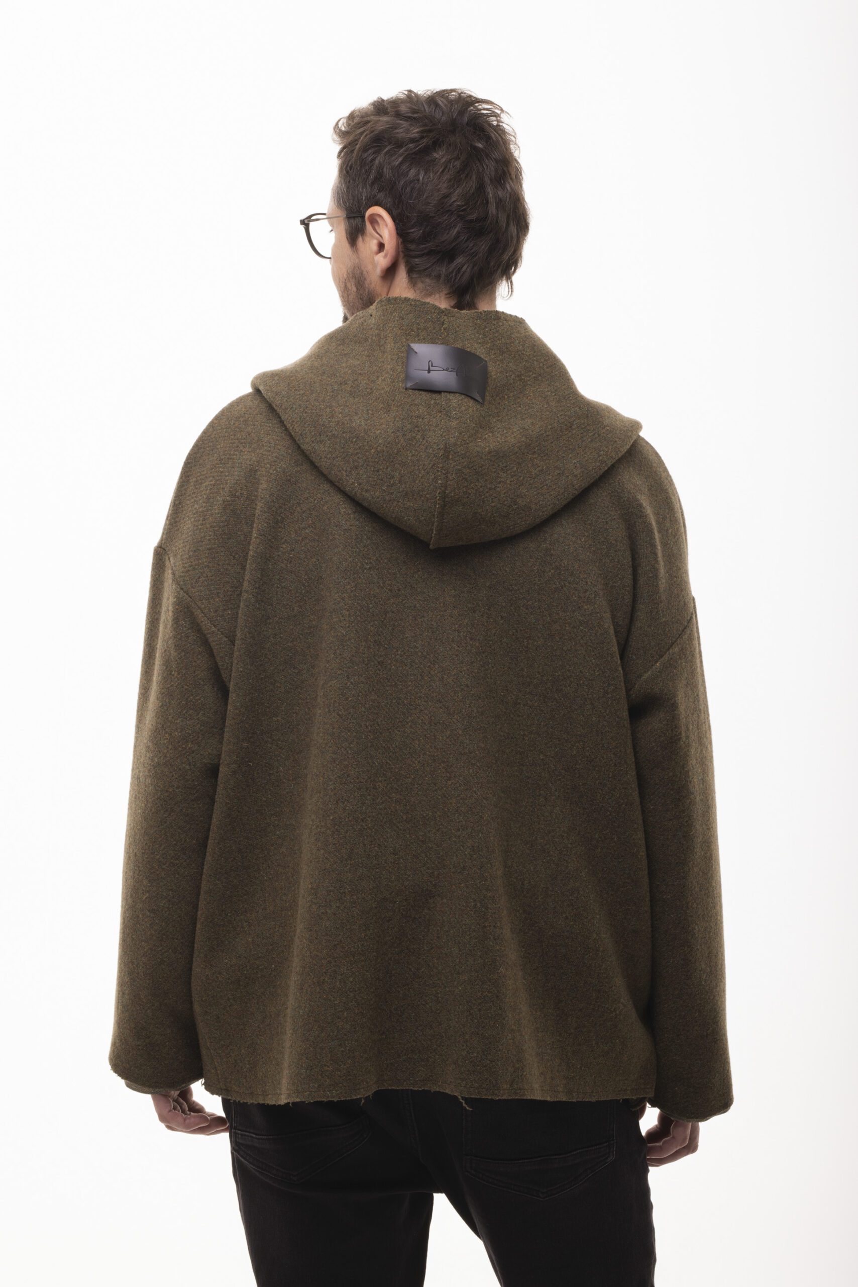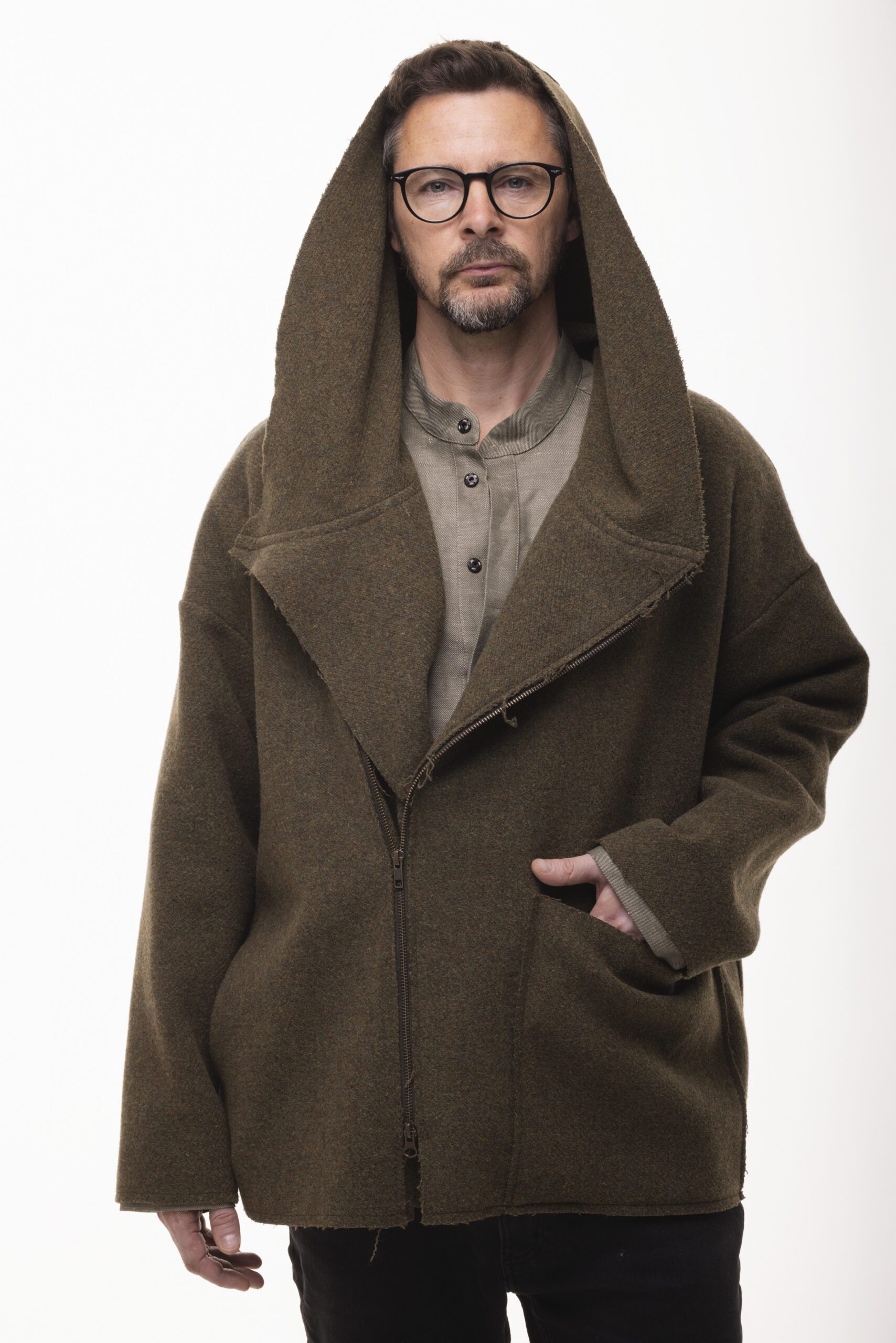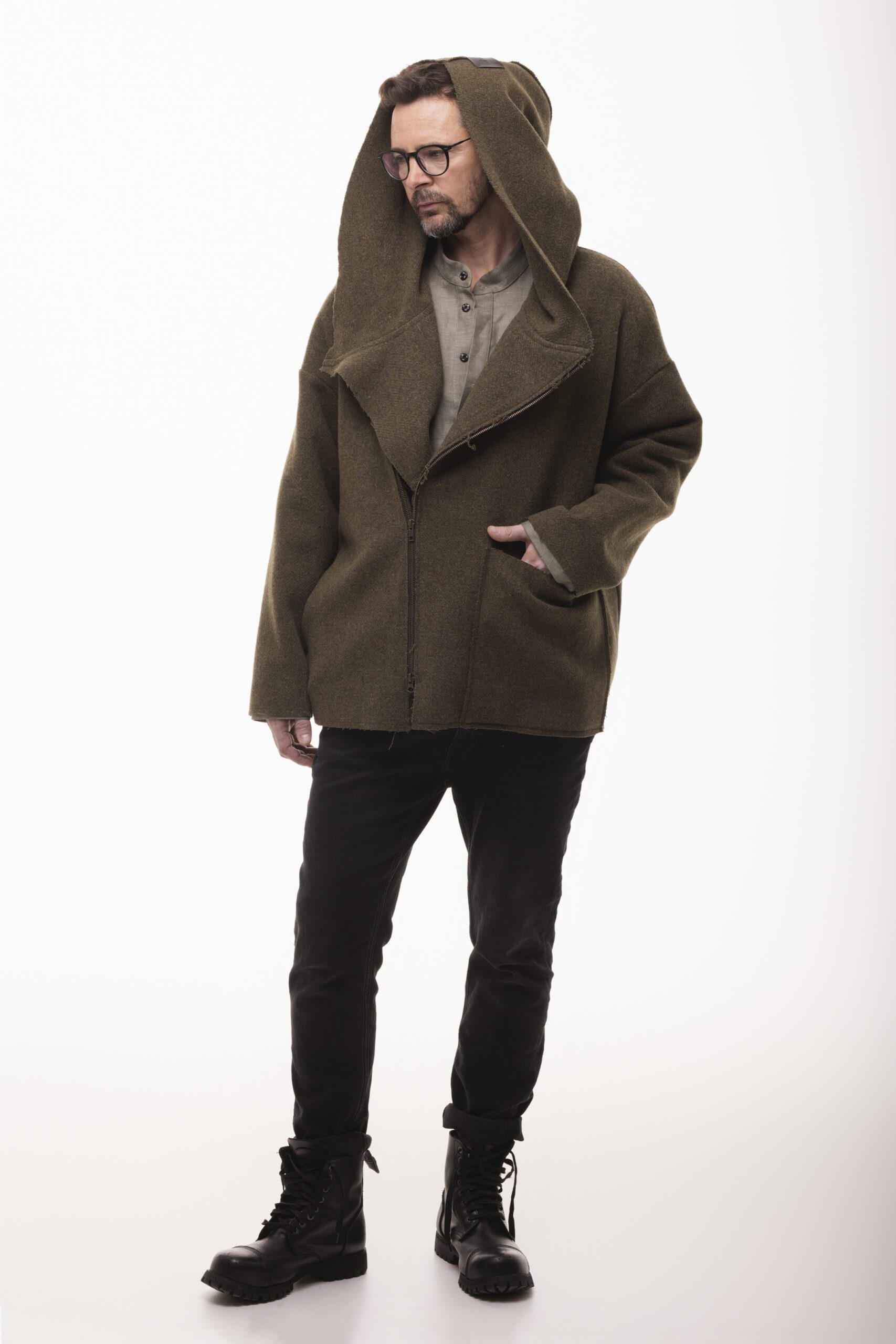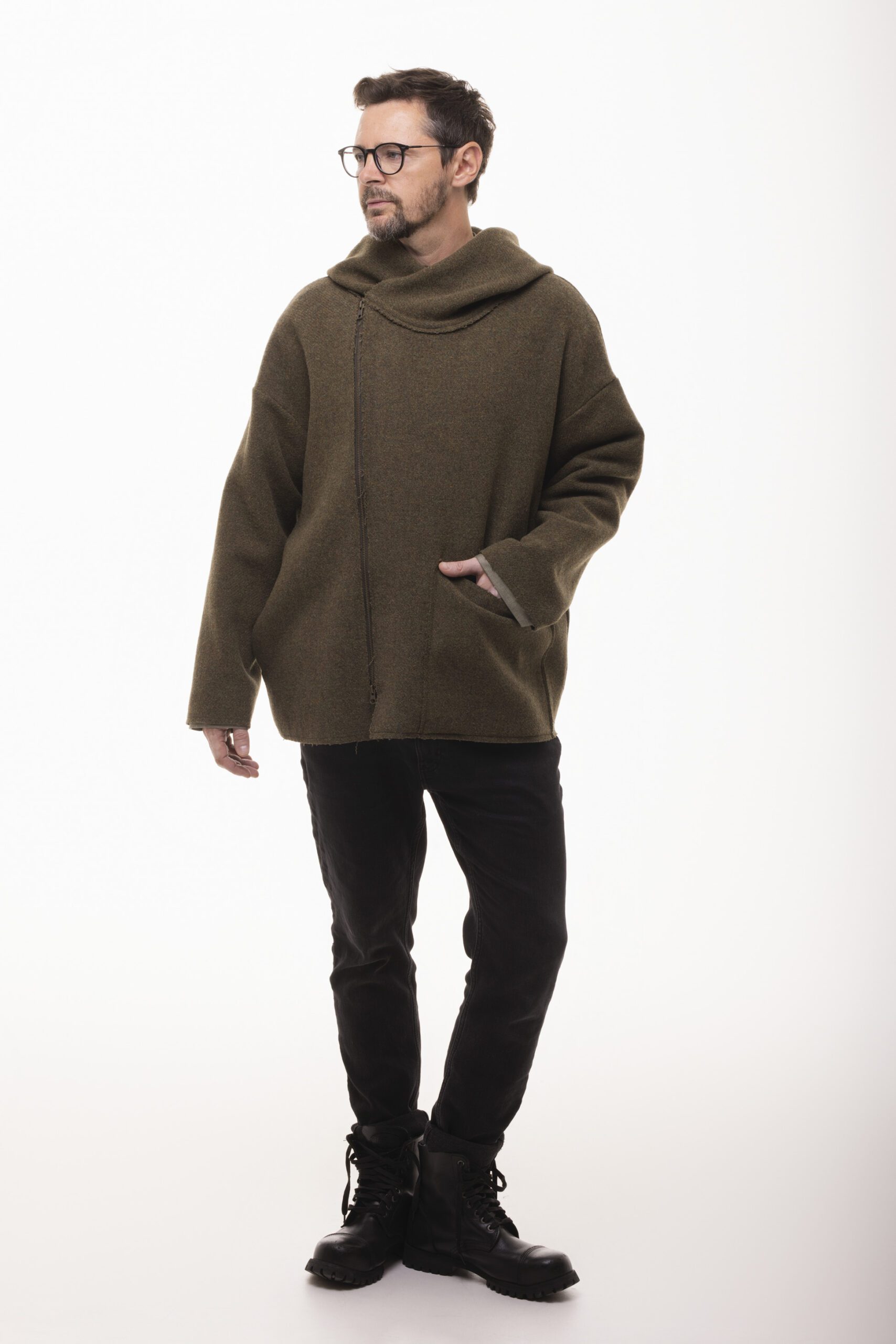 Kurtka Zielony Mech to nowoczesny, otulający model o kroju oversize, który idealnie wpisuje się w miejską estetykę. Z kapturem i asymetrycznym zapięciem na suwak, zapewnia funkcjonalność i stylowy wygląd. Model z opuszczonym ramieniem dodaje luźnego, swobodnego charakteru. Z jednej strony znajduje się naszywana kieszeń, z drugiej kieszeń ukryta w szwie, co podkreśla praktyczność i oryginalność projektu. Materiał w odcieniu khaki, wykończony na surowo, tworzy naturalny, nowoczesny look. Bluza po rozsunięciu może być noszona na różne sposoby, co pozwala dostosować ją do różnych stylizacji i okazji.